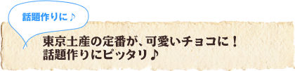 東京チョコばな奈見ぃつけたっ本格チョコの中には本物の味わいにこだわったバナナクリーム。チョコとバナナの黄金コンビは、一瞬で心和ませてくれるから不思議。どこか懐かしさも感じさせるかわいいチョコ。お子さまにも喜ばれますね♪ |