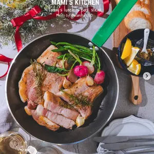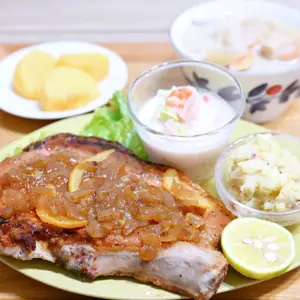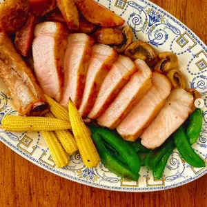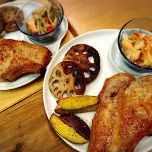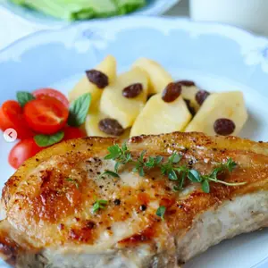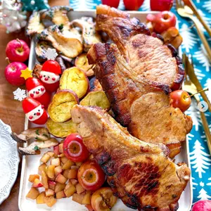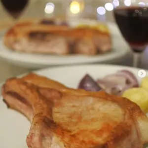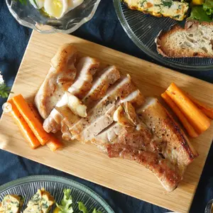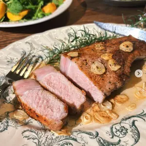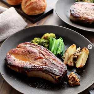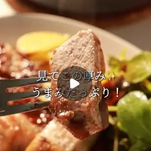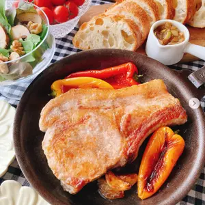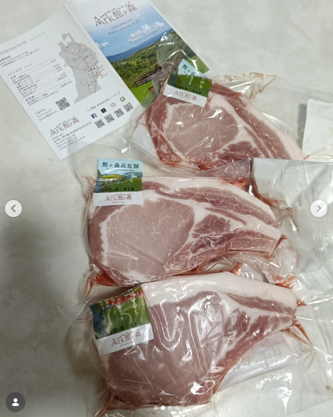 銘柄豚 館ヶ森高原豚の一番旨みのある骨の近くの希少なロース肉を贅沢に厚切り。ほんのりピンク色で十分火が通ってるから焼き過ぎないのがポイント。おいしい焼き方のレシピ付き。