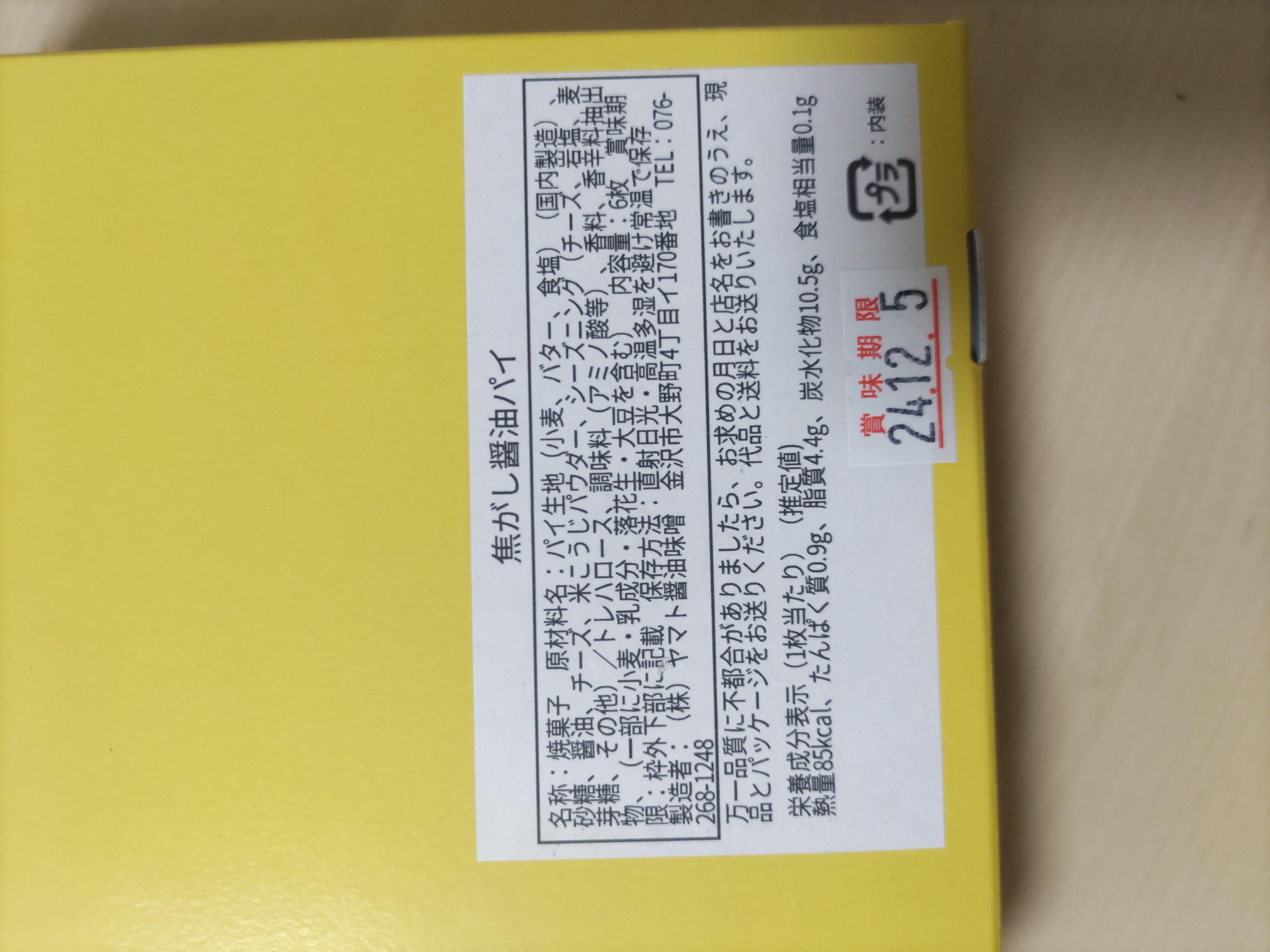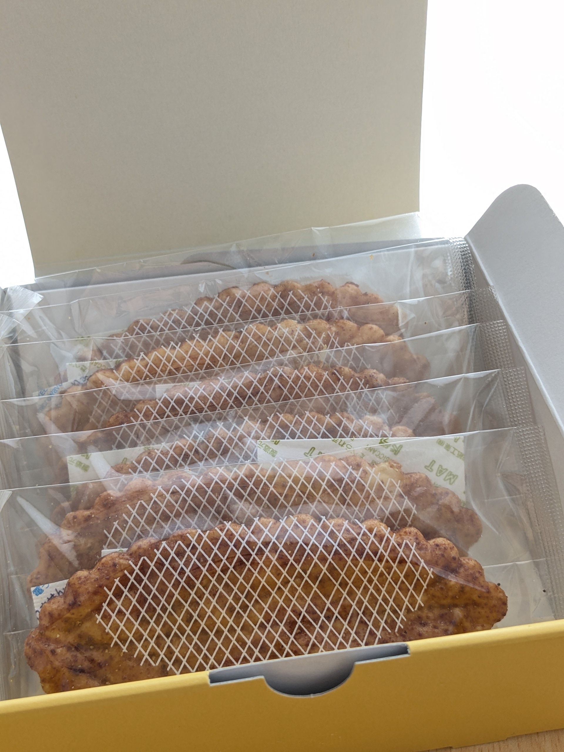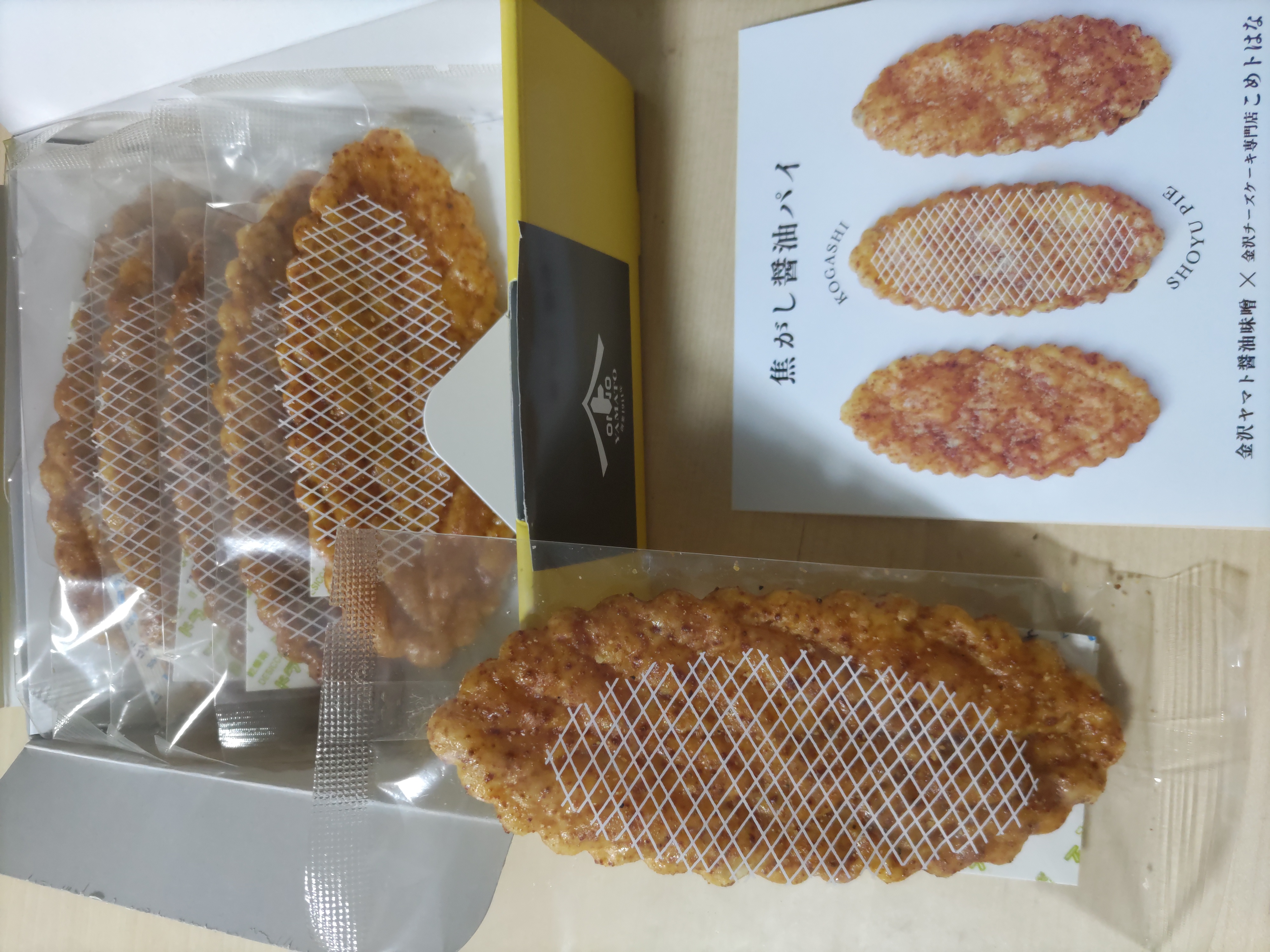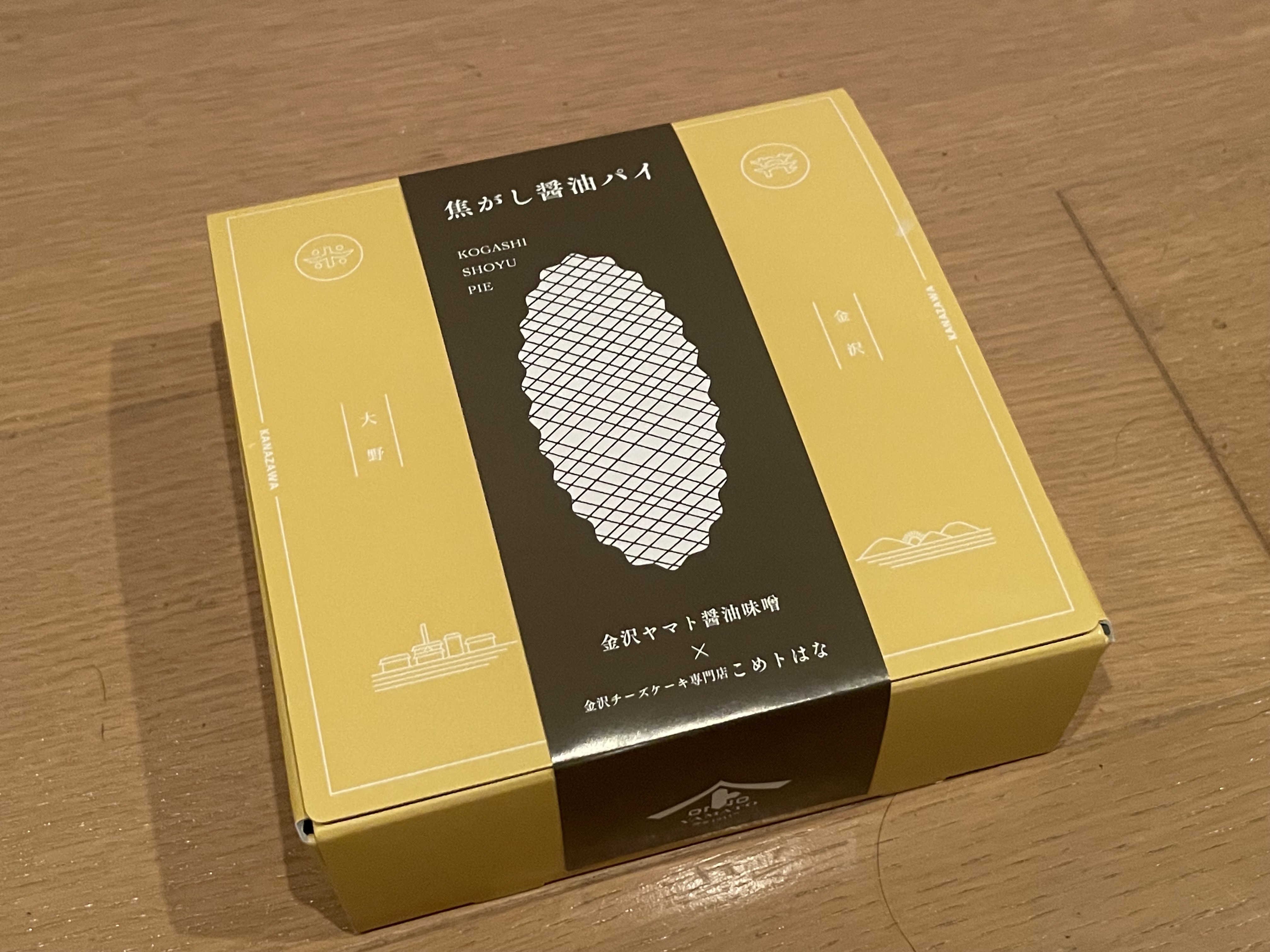 焦がし醤油パイはシンプルで洗練されたパッケージに包まれ、大きなサイズ感が目を引きます。個包装されているので、手軽に楽しめるのも魅力的です。層がしっかりとしたパイ生地が、食欲をそそる美しい焼き色をしています。