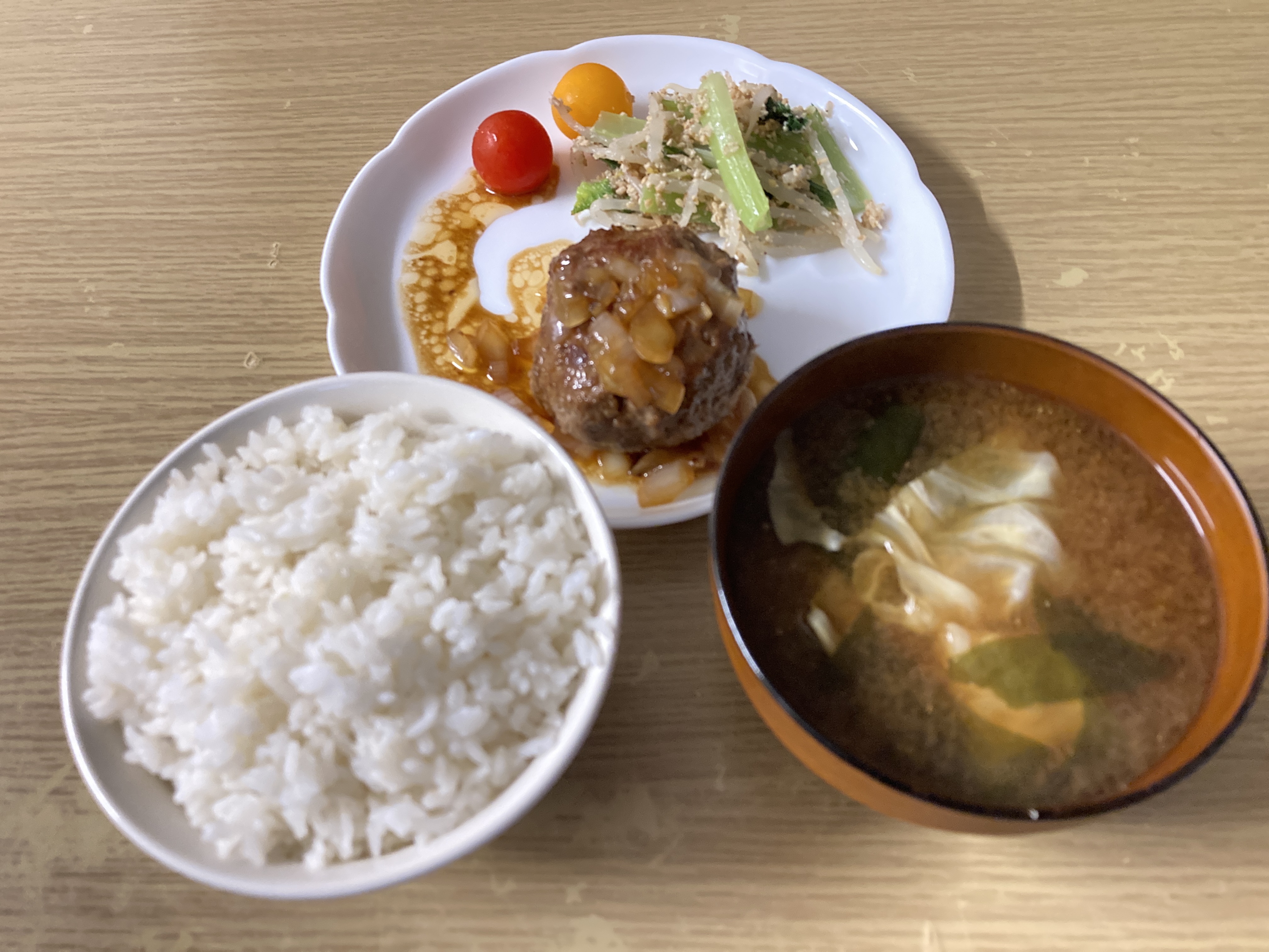 ハンバーグをお皿にうつしたら、先程のフライパンに炒めた玉ねぎ、ソースを加え軽く煮詰めハンバーグに添えました。