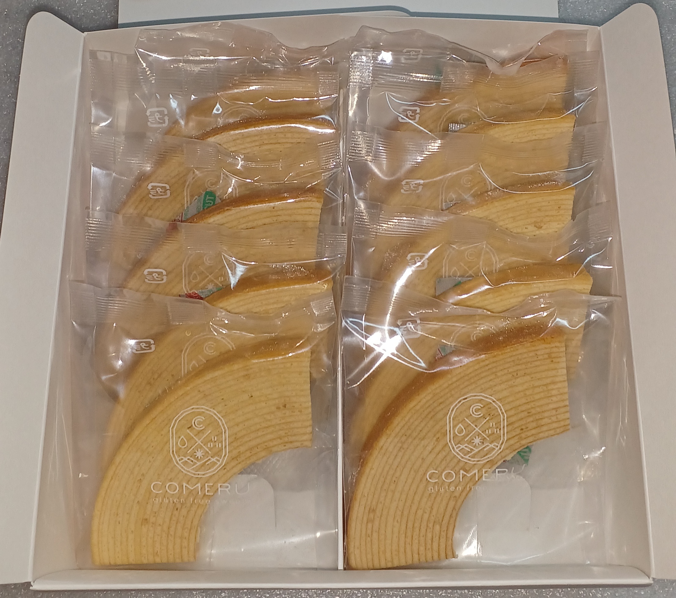 山形県産ブランド米「はえぬき」の米粉を100%使用したバームクーヘン食べやすい大きさにカットし、個包装させていただきました。