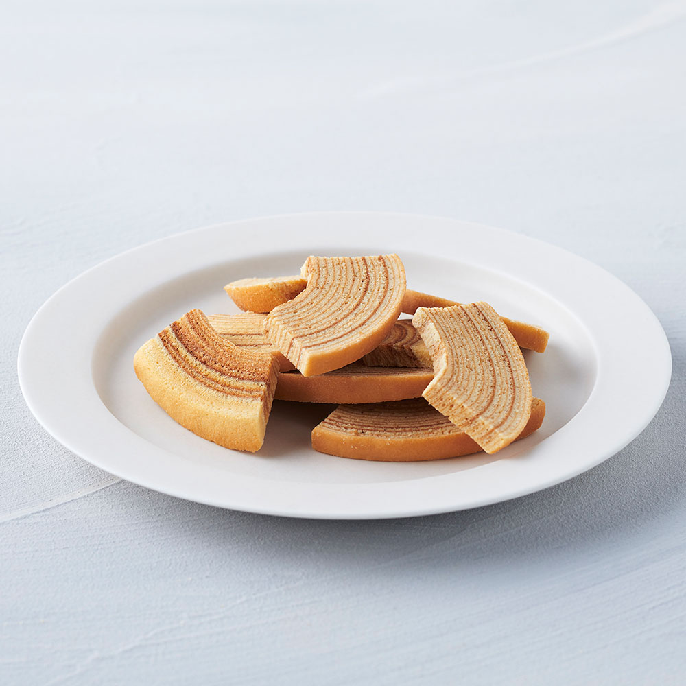 山形県産ブランド米「はえぬき」の米粉を100%使用したバームクーヘンを薄くスライスしてさらに平釜でじっくり焼き上げたこだわりの製法。 バームクーヘンから生まれた新しい食感のラスクです。