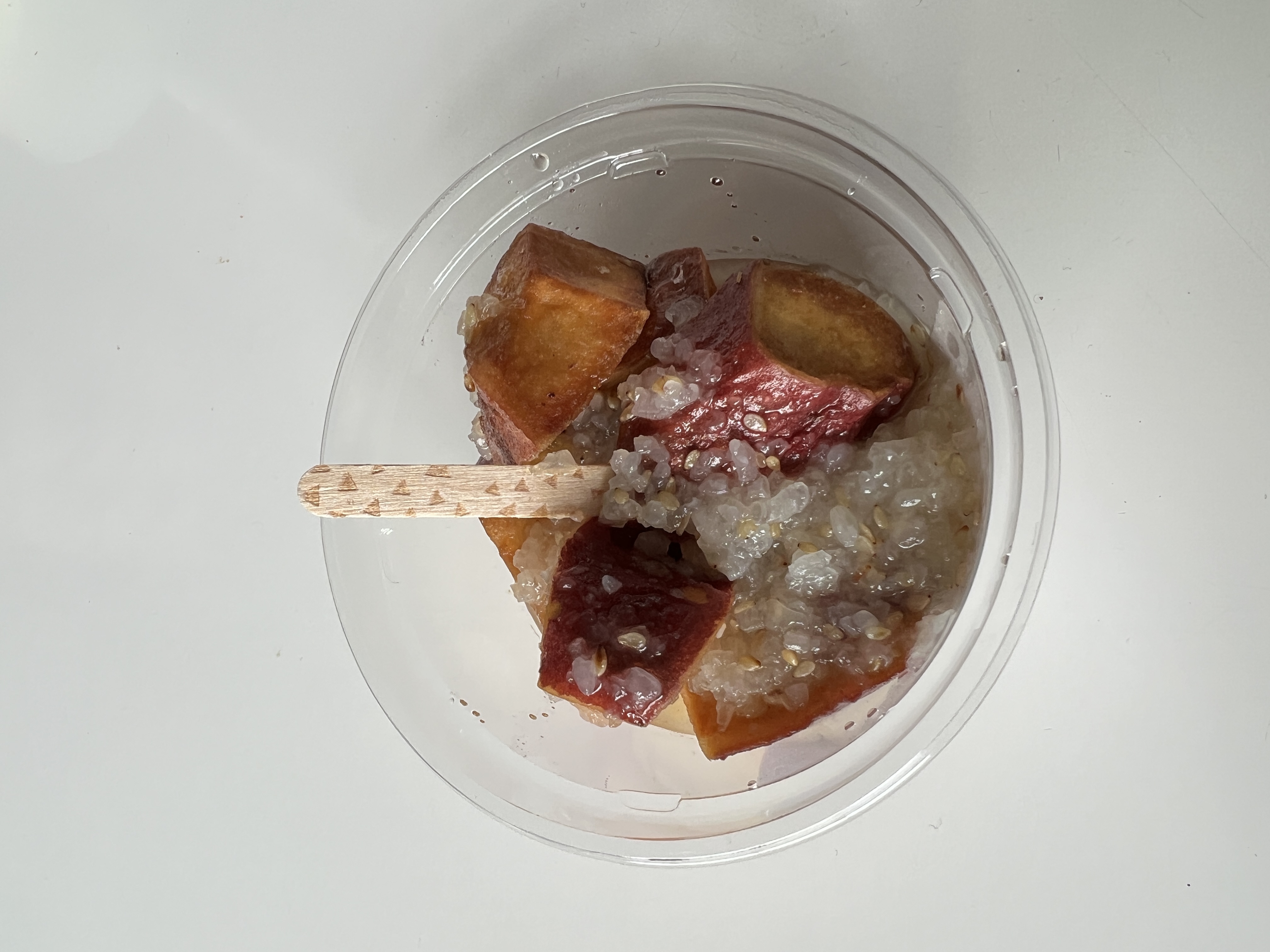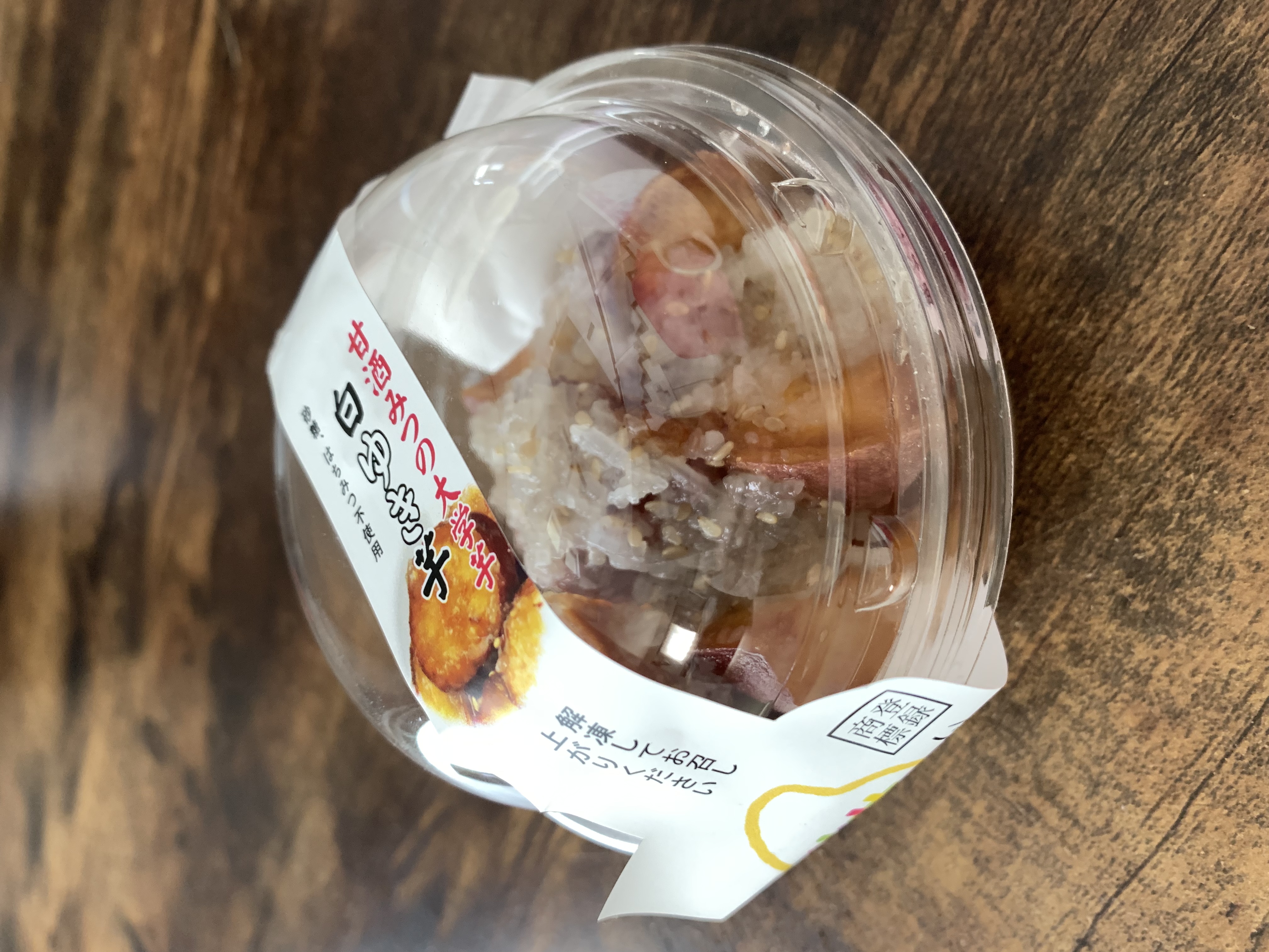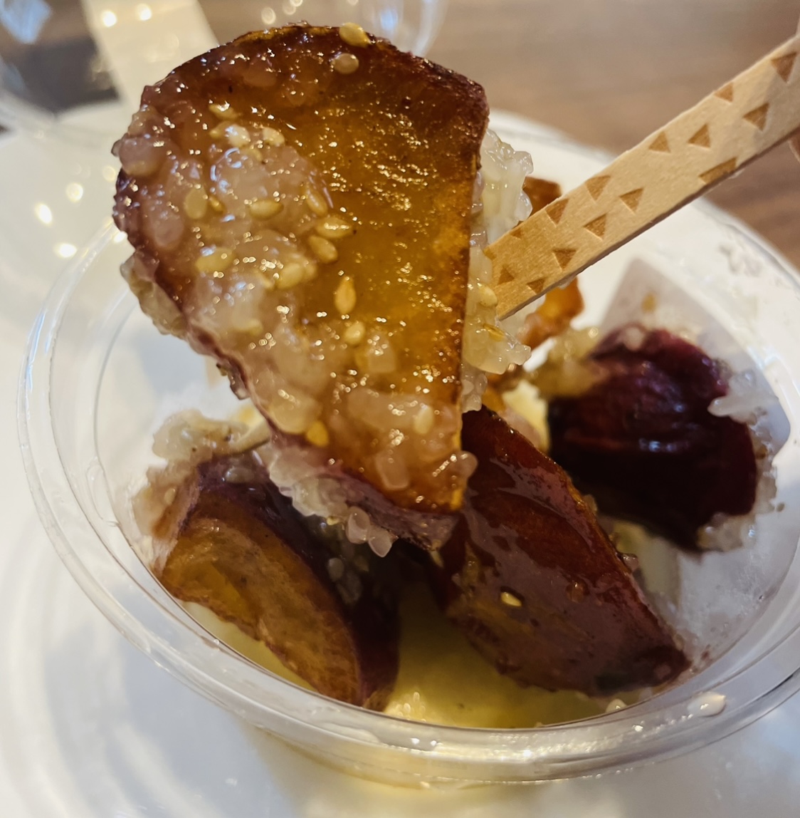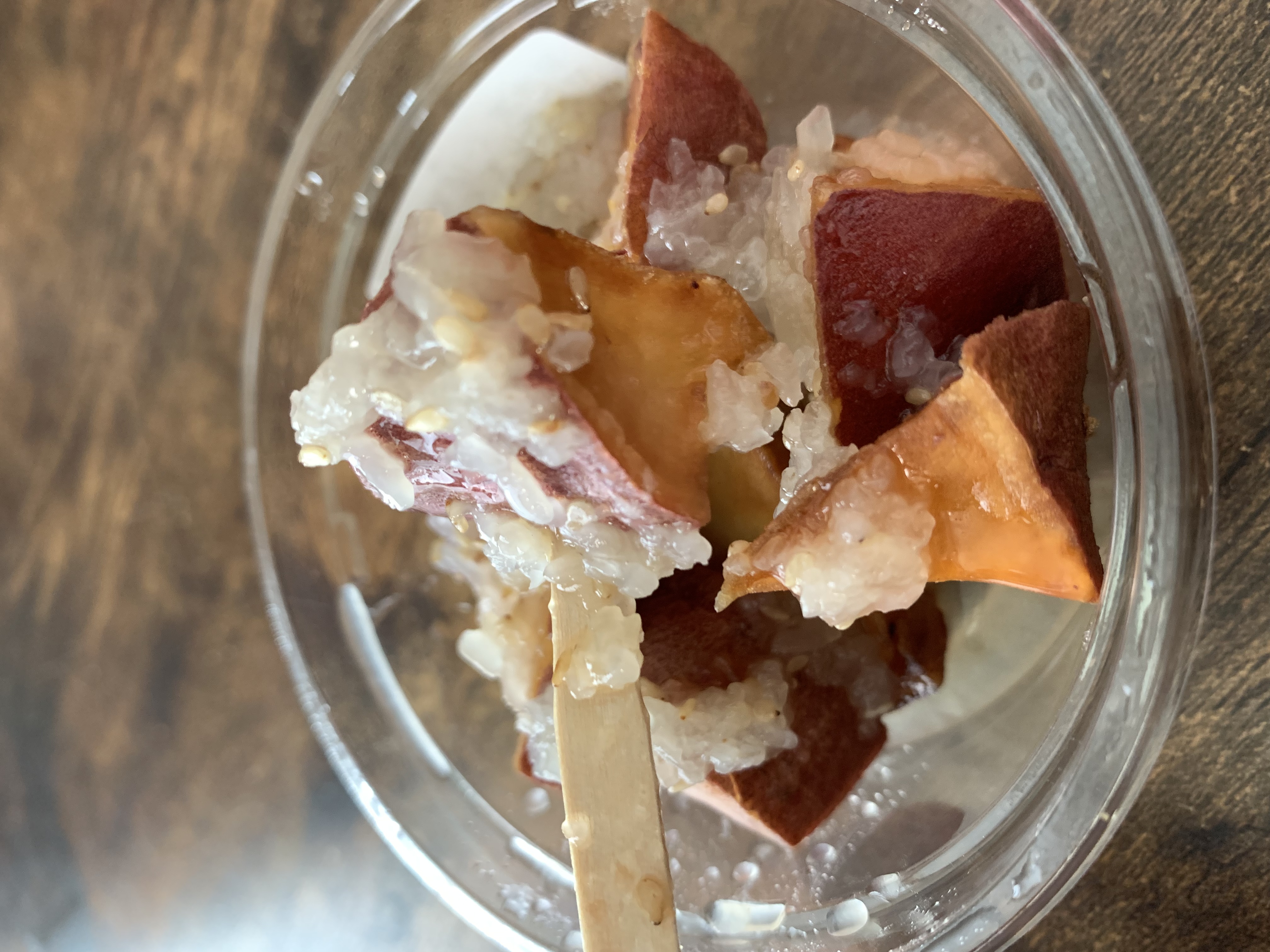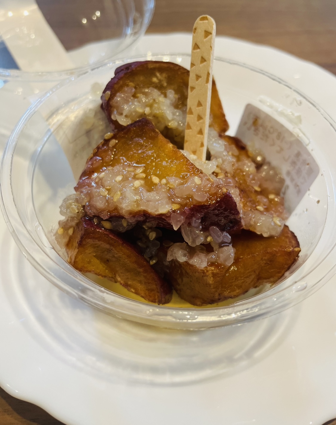 芋の上に砂糖の塊がのっているのかと思ったら米麹のつぶつぶで、食べてみると甘酒のつぶつぶを思い出しました。蜜の甘さはほんのり控えめな上品な甘さで、その分五郎島金時芋の美味しさとホクホク感がしっかりと味わえる大学芋で美味しい。