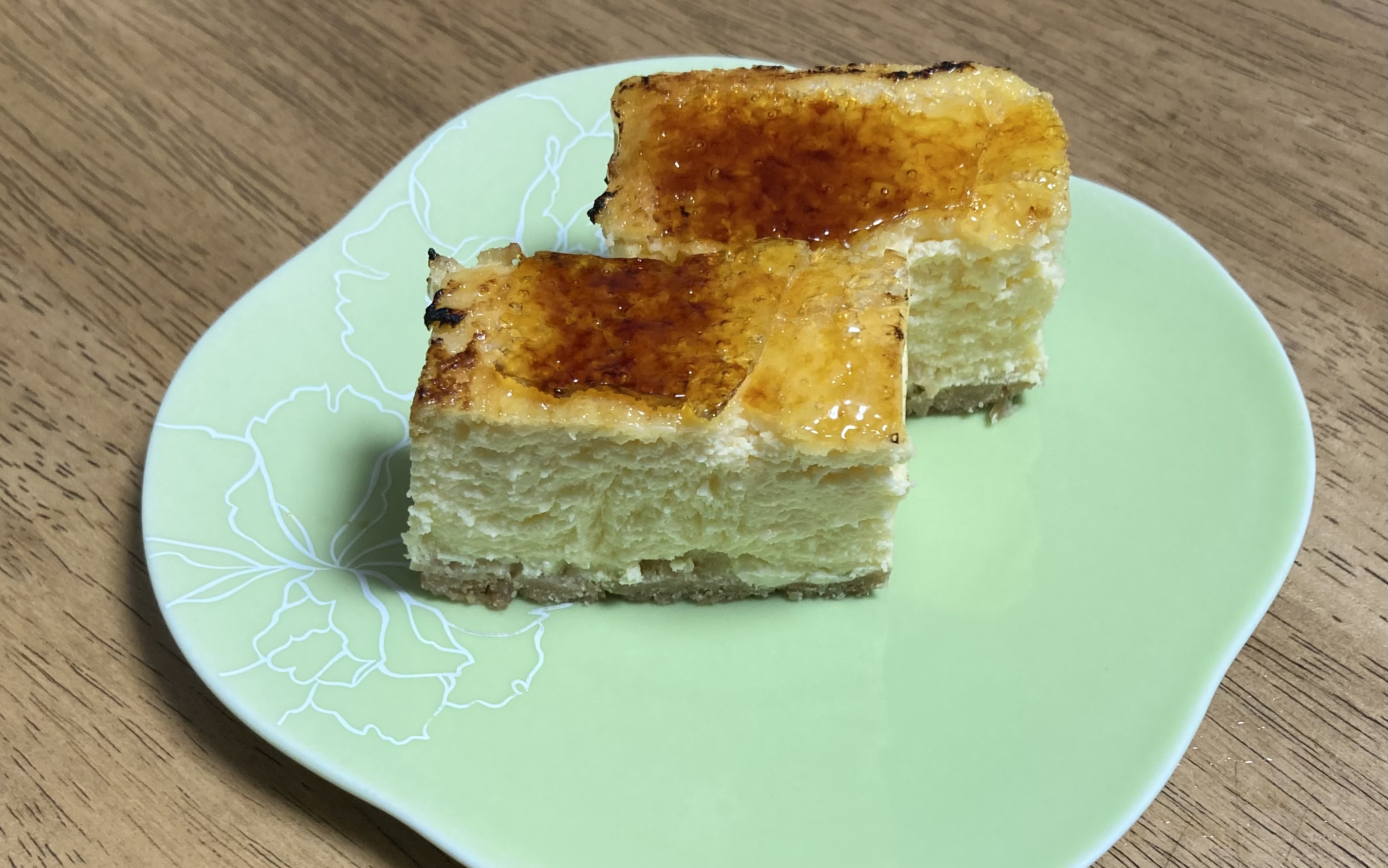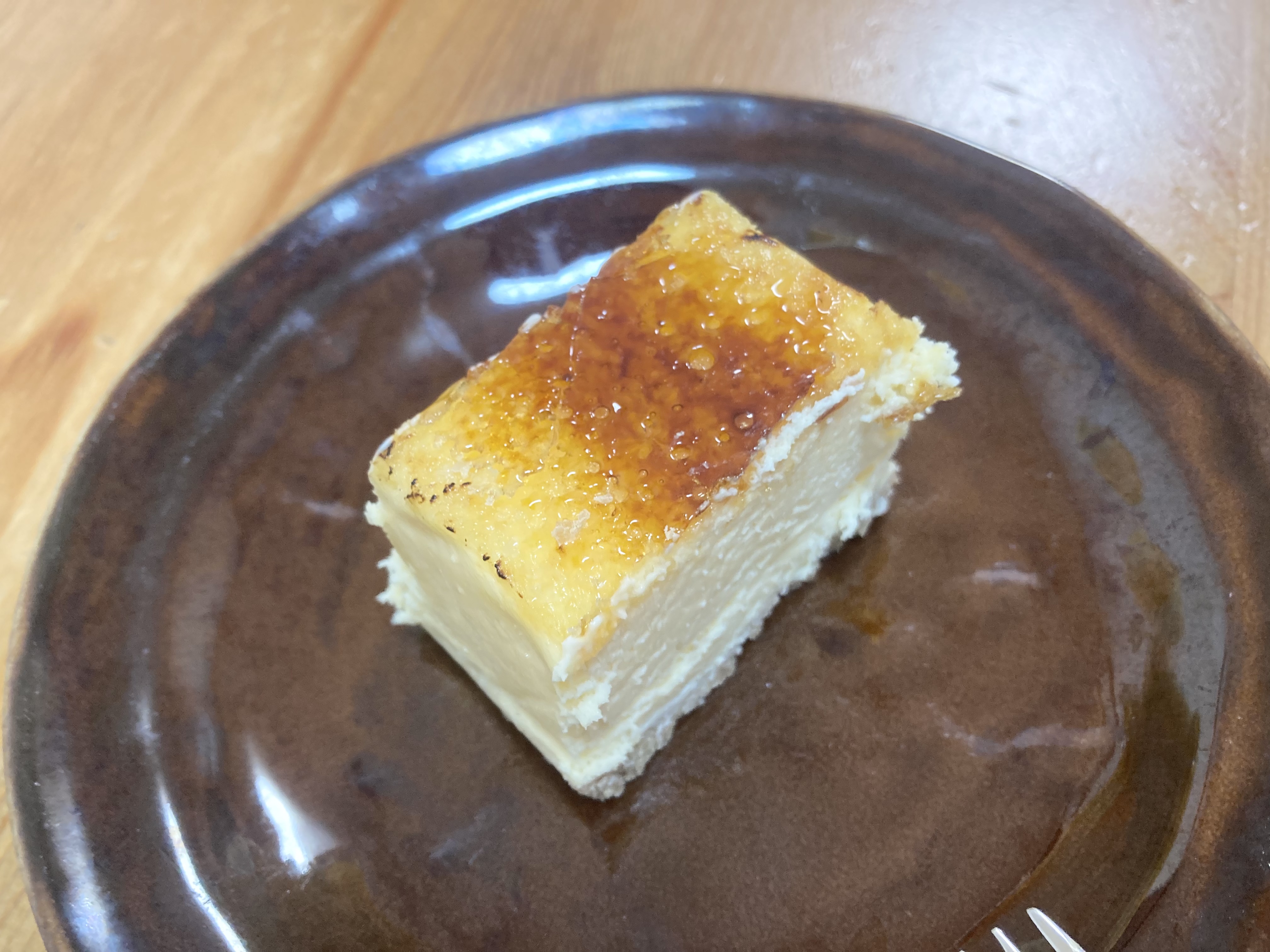 2日目は、パリパリだったブリュレが、チーズケーキに染み込み、まさにチーズプリンのような全く別の味わいを楽しめます。キャラメリゼはどこにいったのかと、驚きましたが、香ばしいほろ苦さが溶け込んでます。クッキー生地もしっとりし、まとまった感じです。