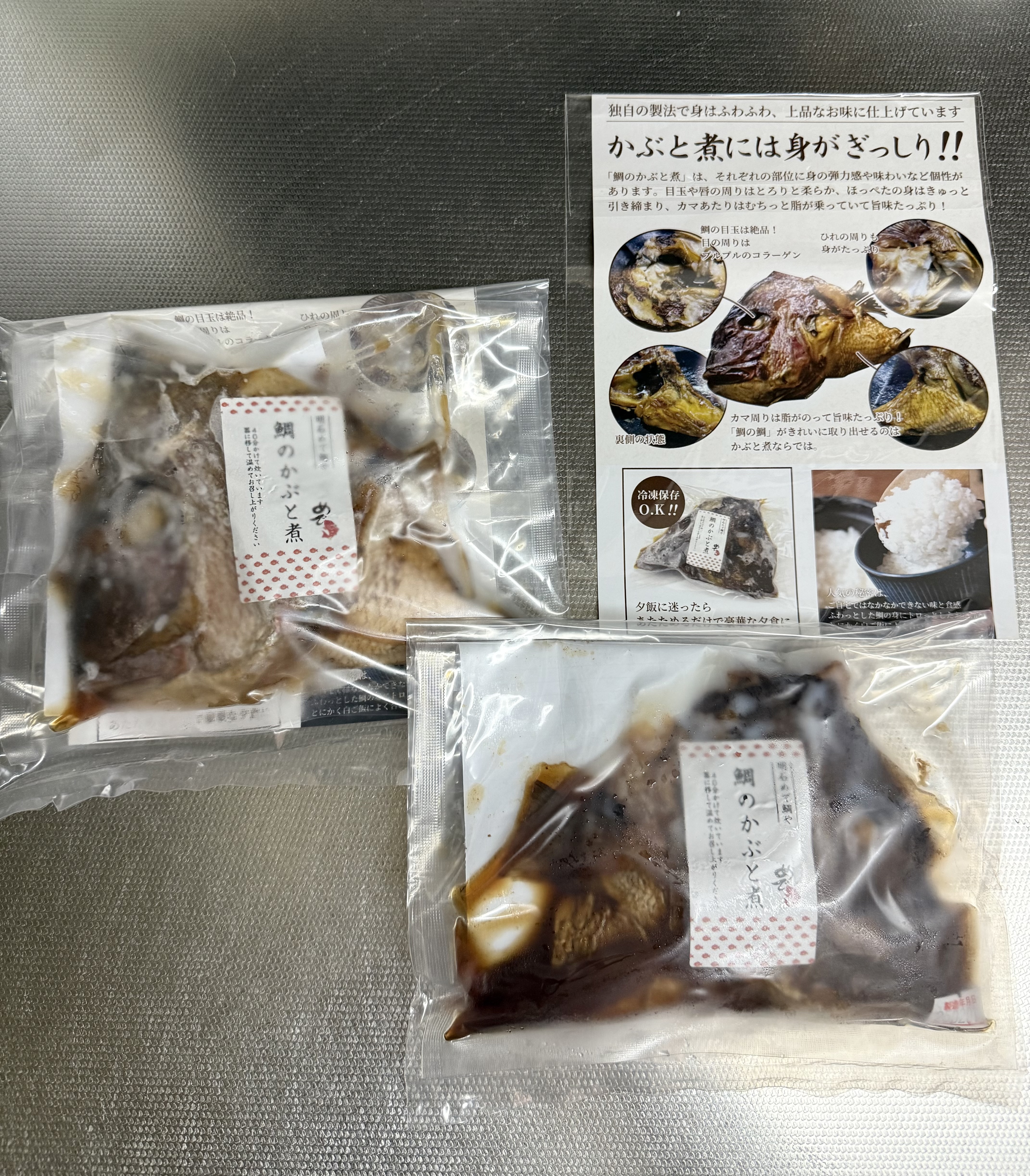 独自の製法で身はふわふわ、上品なお味に仕上げています。「鯛のかぶと煮」はそれぞれの部位に身の弾力感や味わいなど個性があります。目玉や唇の周りはとろりと柔らか、ほっぺたの身はきゅっと引き締まり、カマあたりはむちっと脂が乗っていて旨味たっぷり。夕飯に迷ったらあたためるだけで豪華な夕食に!