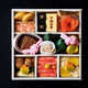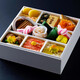 笹巻麩、飛竜頭煮、粟麩揚げ煮、ゆばのあんかけ、にしん昆布巻き、かに甘酢漬け、柿なます、厚焼玉子、からすかれい西京焼、鮑旨煮、栗甘露煮、帆立ひもたらこ雲丹和え、筍煮、子持イカ、海老イカ華飾り、サーモン華飾り、千代結び蒲鉾、花麩煮、いんげん、菊花