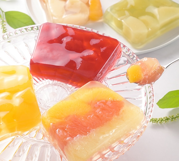フルーツの並びが美術品のように美しい夏季限定「フルーツゼリー」です。みずみずしいフルーツを、相性のよい洋酒を香らせたゼリーと合わせています。ひとつのゼリーの中には「アップル&イエローピーチ」や「オレンジとグレープフルーツ」など、みずみずしいフルーツを贅沢に2種類敷き詰めました。柑橘系のつぶつぶした食感、弾けるようなマンゴー、さわやかな味わいのアップル。どこから食べても果実のジューシーさを味わえます。パッケージは涼しげでありながらカラフルな色合いで、夏の贈りものにもピッタリです。