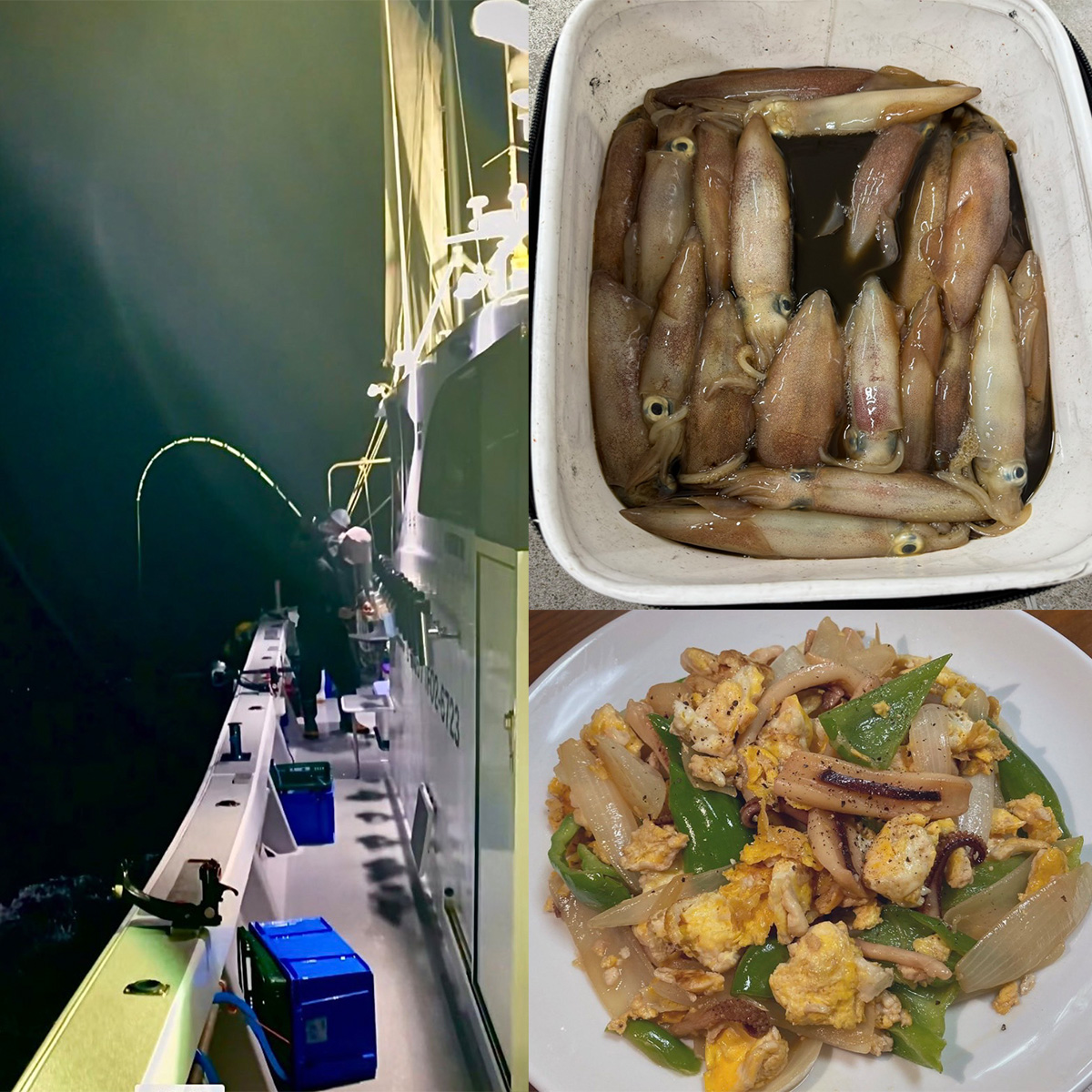 船上にて釣りあげ活きたままタレに漬けこんだ「イカ沖漬け」
