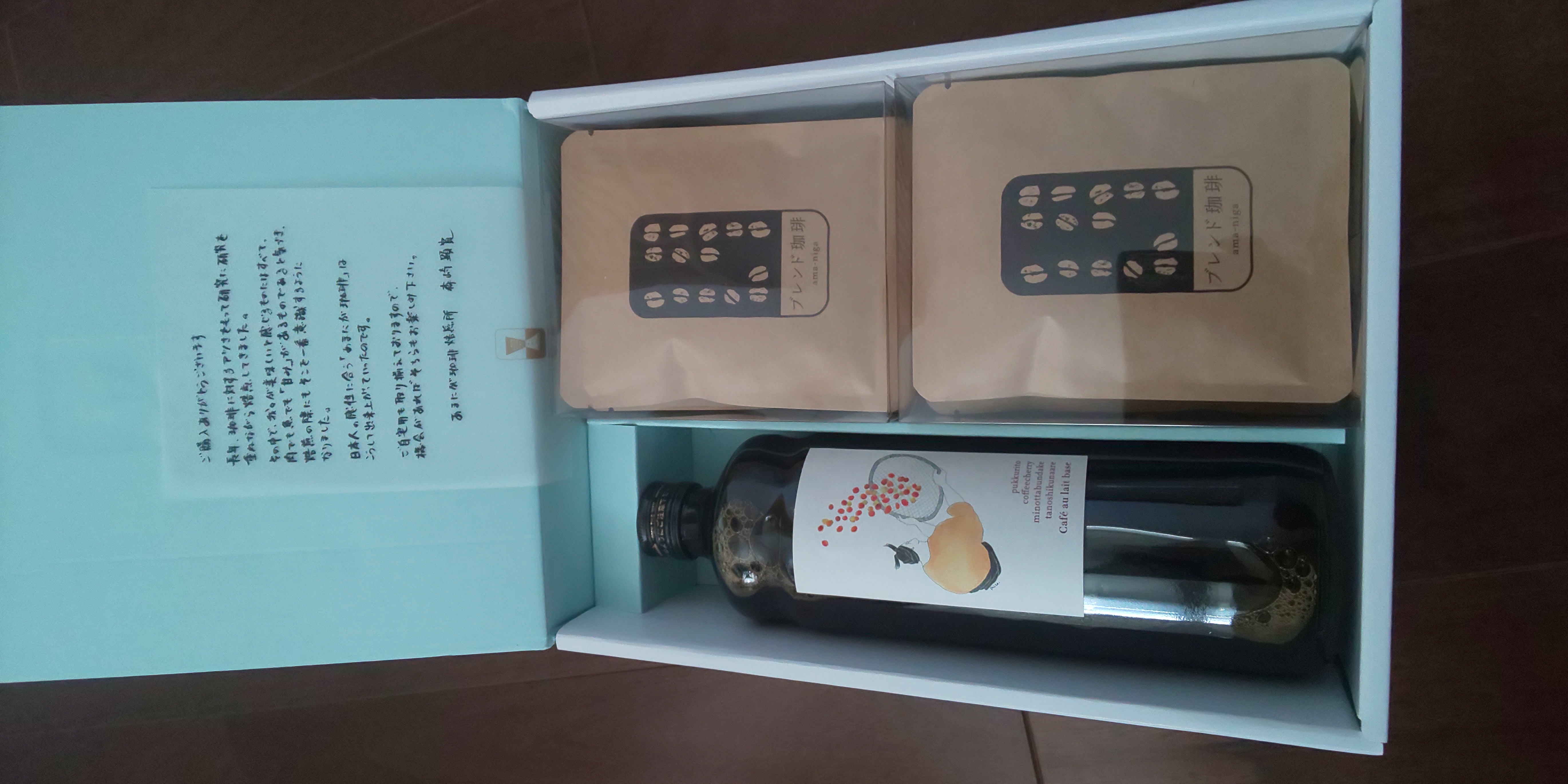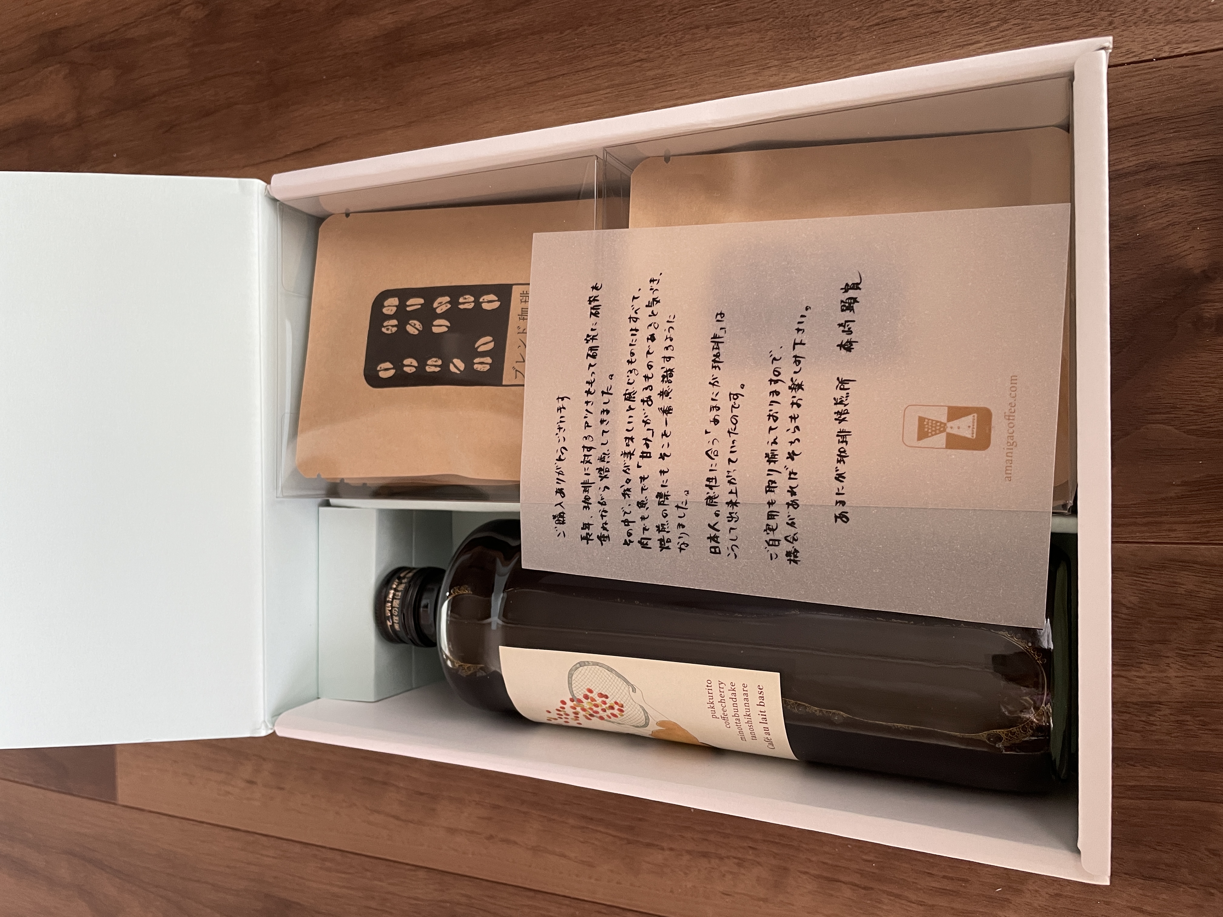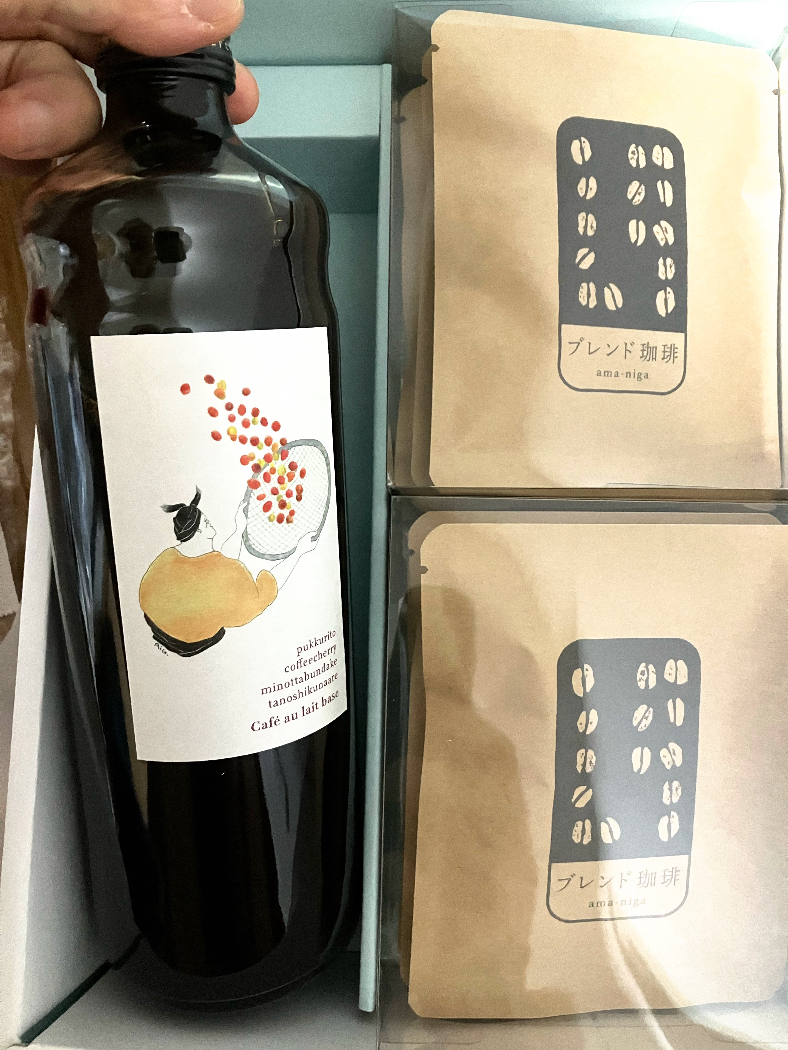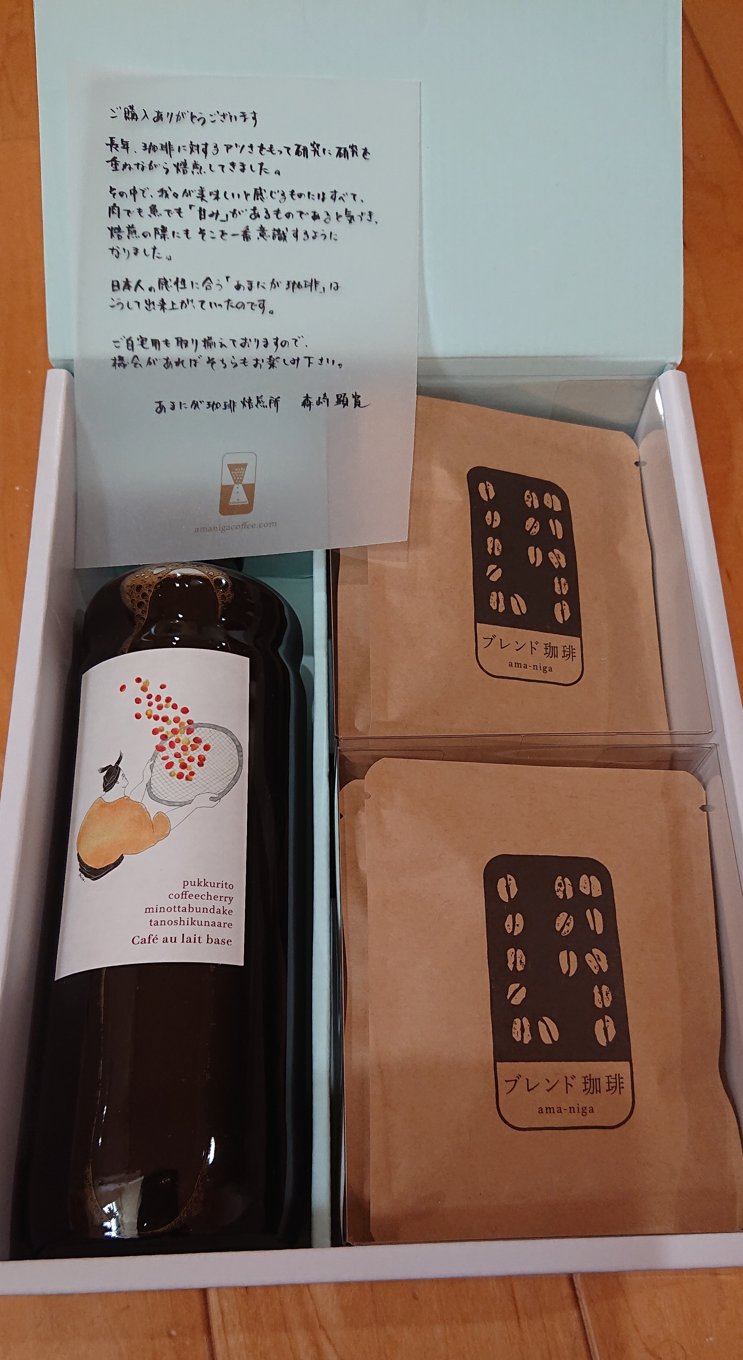 珈琲焙煎所の「カフェオレベース」と「ドリップバッグ」です。「カフェオレベース」は、オリジナル配合のしっかりとした味わいで、牛乳とよく合う無糖タイプです。スペシャリティコーヒーのみを使用した濃縮コーヒーなので、牛乳で4~5倍に希釈するとコクのあるカフェオレが、自宅で簡単に作れます。無添加で保存料・着色料等は一切不使用です。「あまにがブレンド」は、ブラジルのさっぱりした味わいに、コロンビアの甘み・コクをかけ合わせた珈琲です。あっさりだけでなく、徐々に甘み、コクを増し、そしてそれは優雅な余韻へを変化します。焙煎によって生豆の中の水分をしっかり飛ばすので冷めても嫌なえぐみがないのが特長。あきのこない、毎日飲める味です。専用ボックスに入ったギフト向き商品なので、贈り物にもおすすめです。