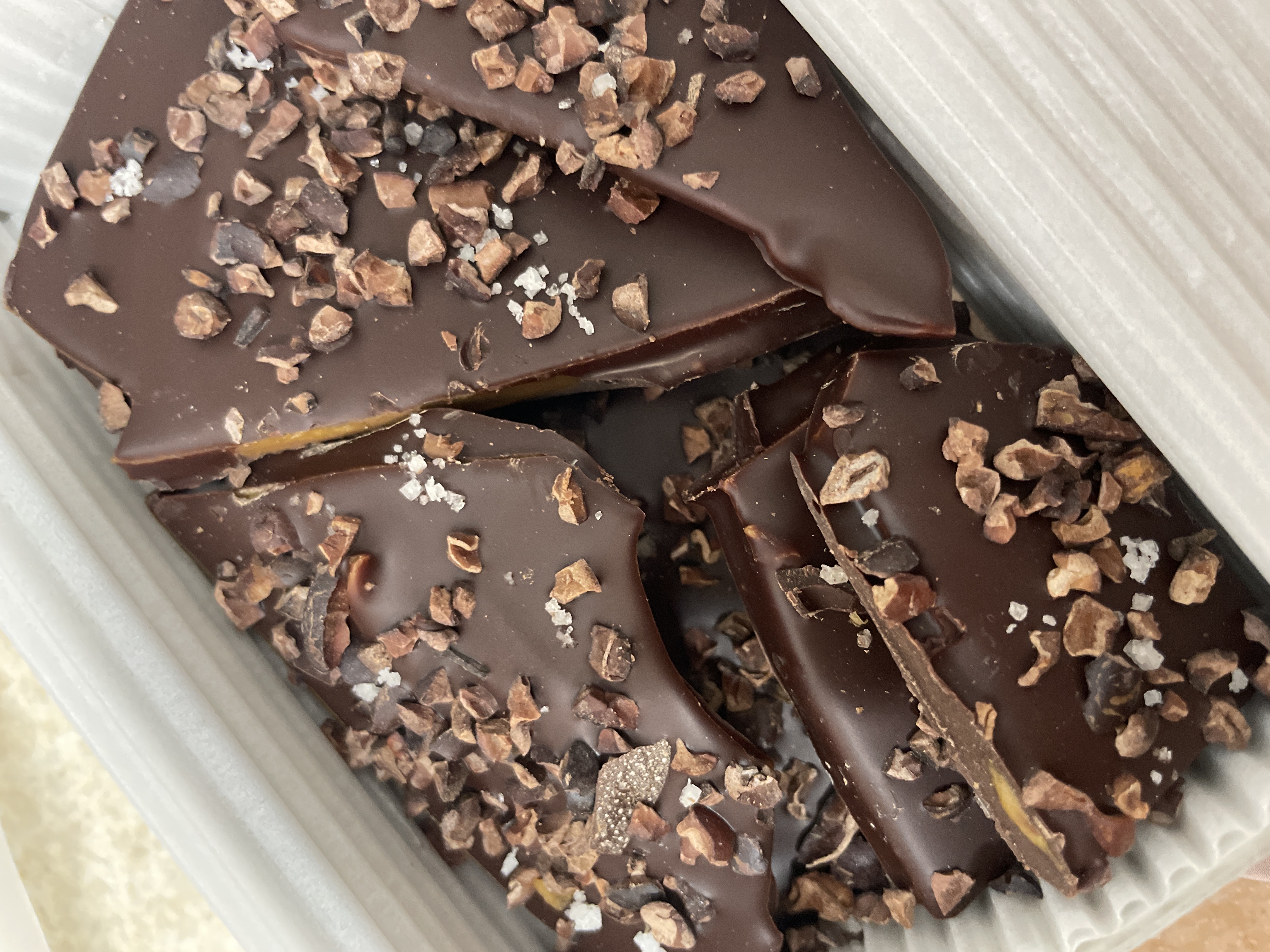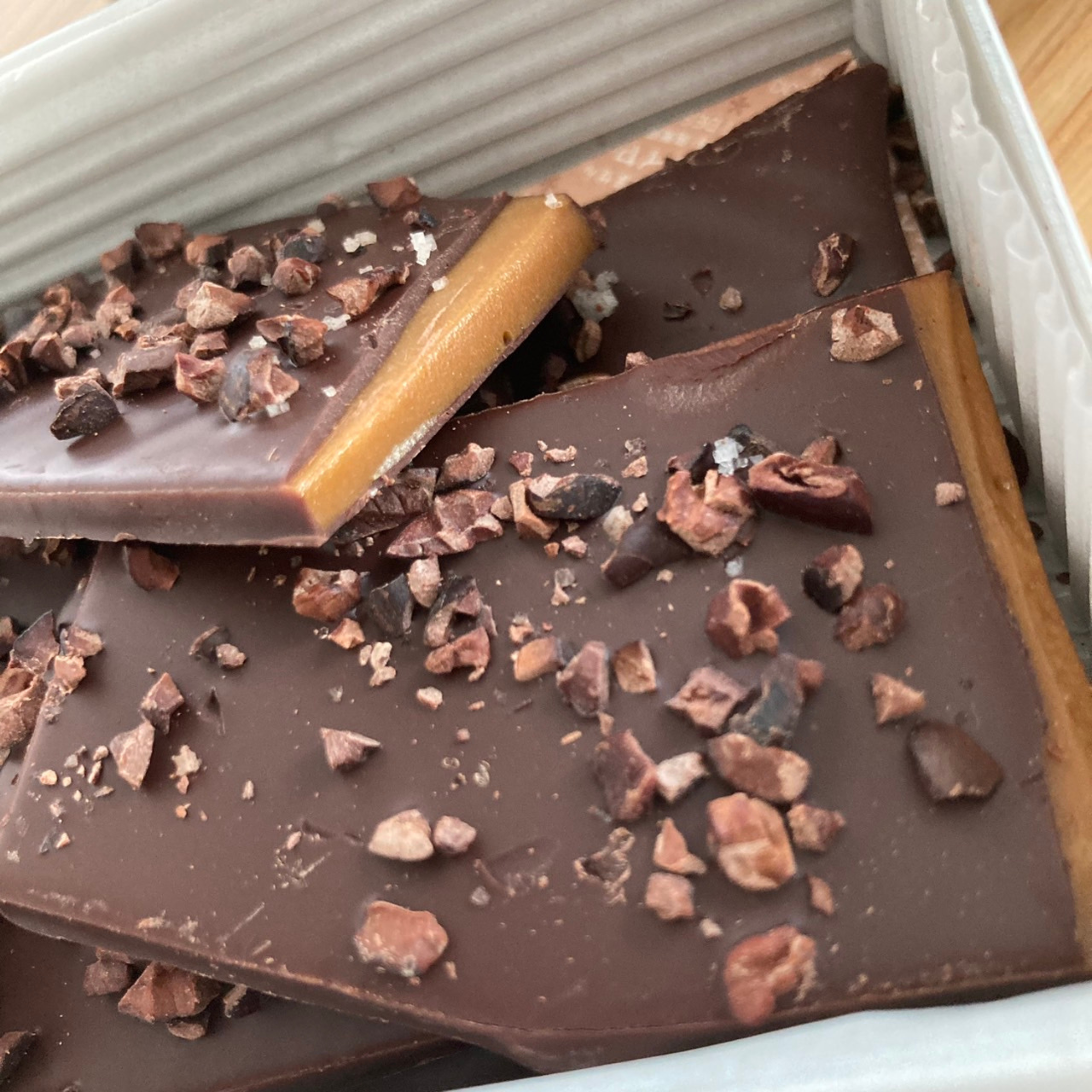 普通のチョコレートではなく、少しの塩味がアクセントとなり、サクサク感、香り高さがとても高級感を演出しています。