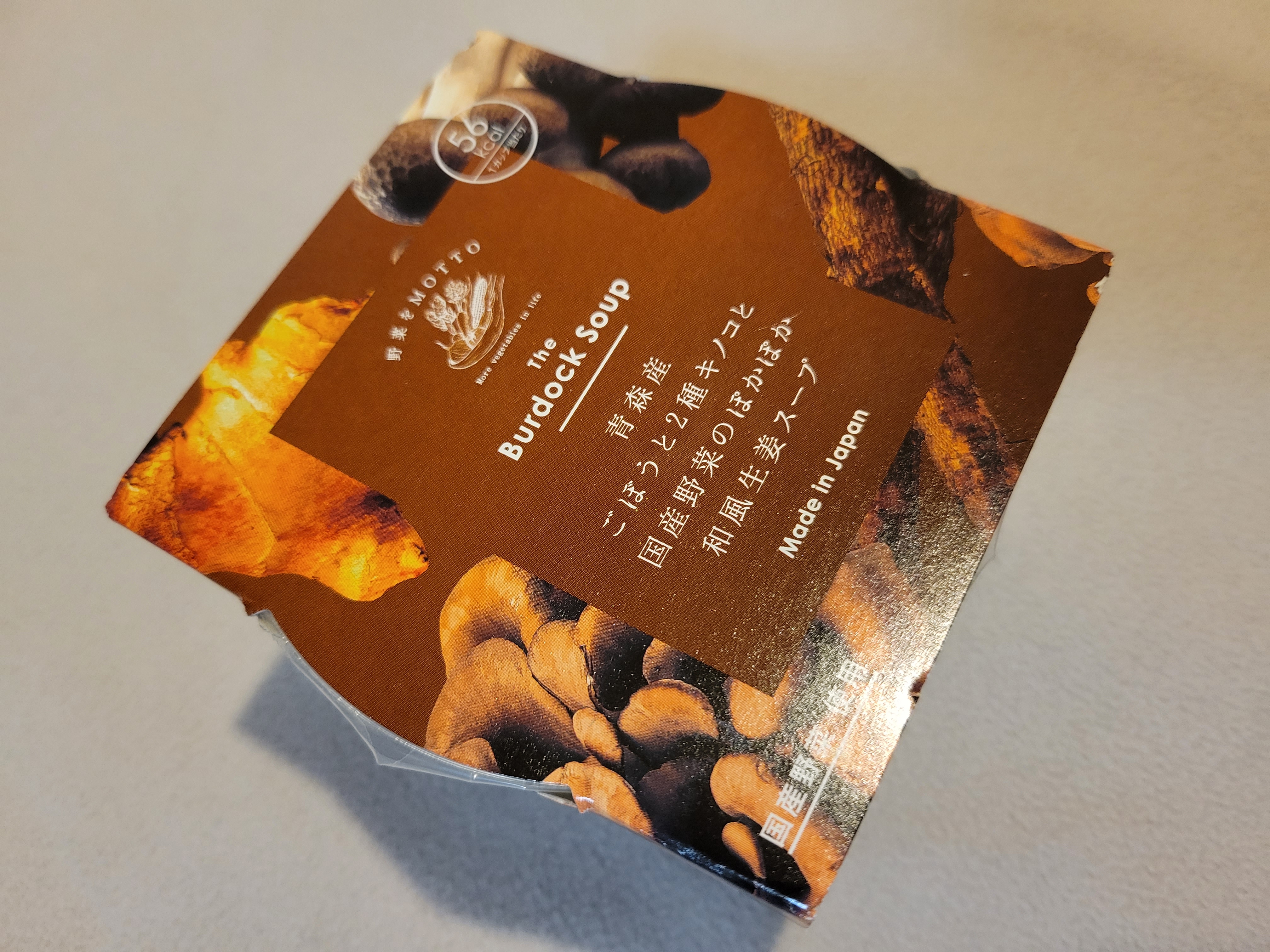 レンジで1分そのまま温めるだけでOK!カップに入った「和風生姜スープ」です。青森県でとれたごぼうと、2種きのこ(まいたけ、ぶなしめじ)をたっぷりと使用。生姜が効いているので、おにぎりなどのご飯ものとも相性抜群です。保存料・合成着色料・化学調味料不使用。常温保存も可能なので、常備菜としてもおすすめです。