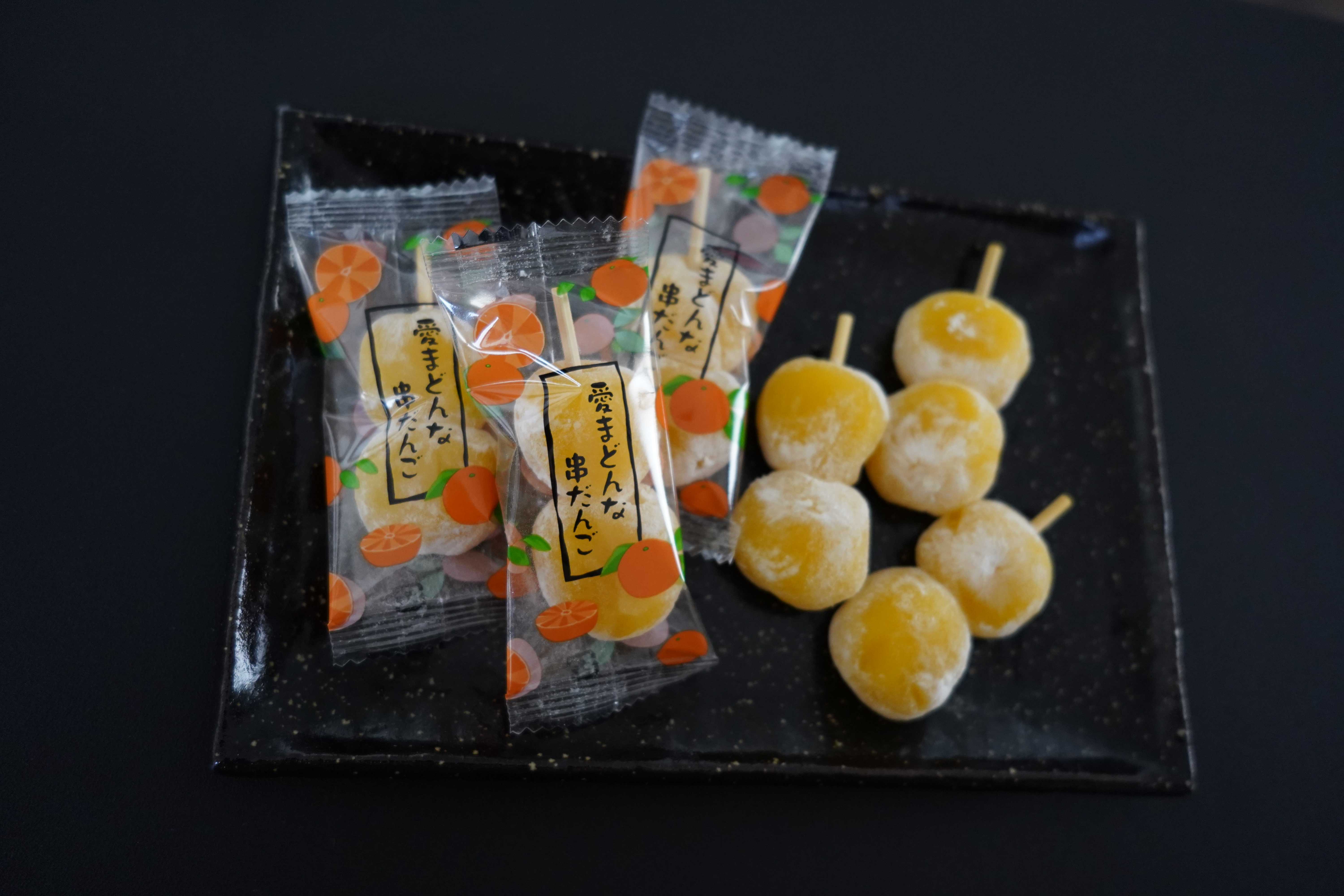 ゼリーのような食感の愛媛県産愛まどんなの果汁を使用した、爽やかな香りの串団子です。可愛らしい見た目と、もちもちした食感がたまりません。しっとりとしたお餅に、みかんの味がほのかに香ります。