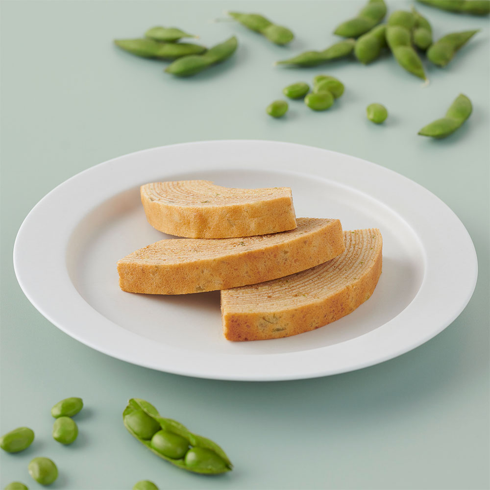 山形県庄内産はえぬき米粉を100%使用した生地に、庄内産だだちゃ豆を加え、濃厚な味わいに焼き上げた、期間限定販売の「バームクーヘン」です。カットして個別包装しています。「だだちゃ豆」は、明治より庄内平野の一角で栽培されてきた、枝豆の一種。噛むほどに強みを増す甘みと旨み、濃厚な豆の味わいを生かし「バームクーヘン」に仕上げています。工房内でも小麦を一切使用していないので、完全グルテンフリー商品。だだちゃ豆のイラストが印象的な専用ボックスに入って届くので、手土産スイーツとしてもおすすめです。