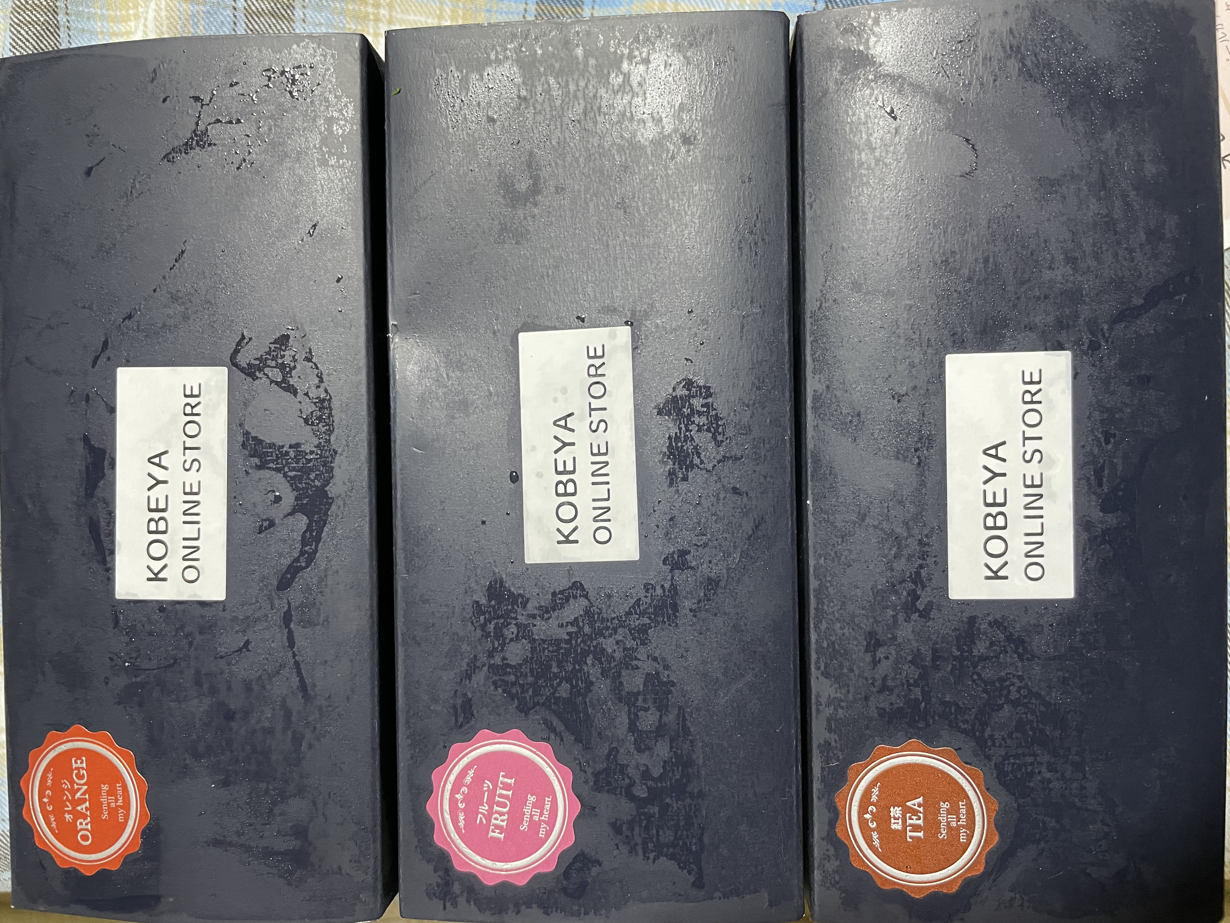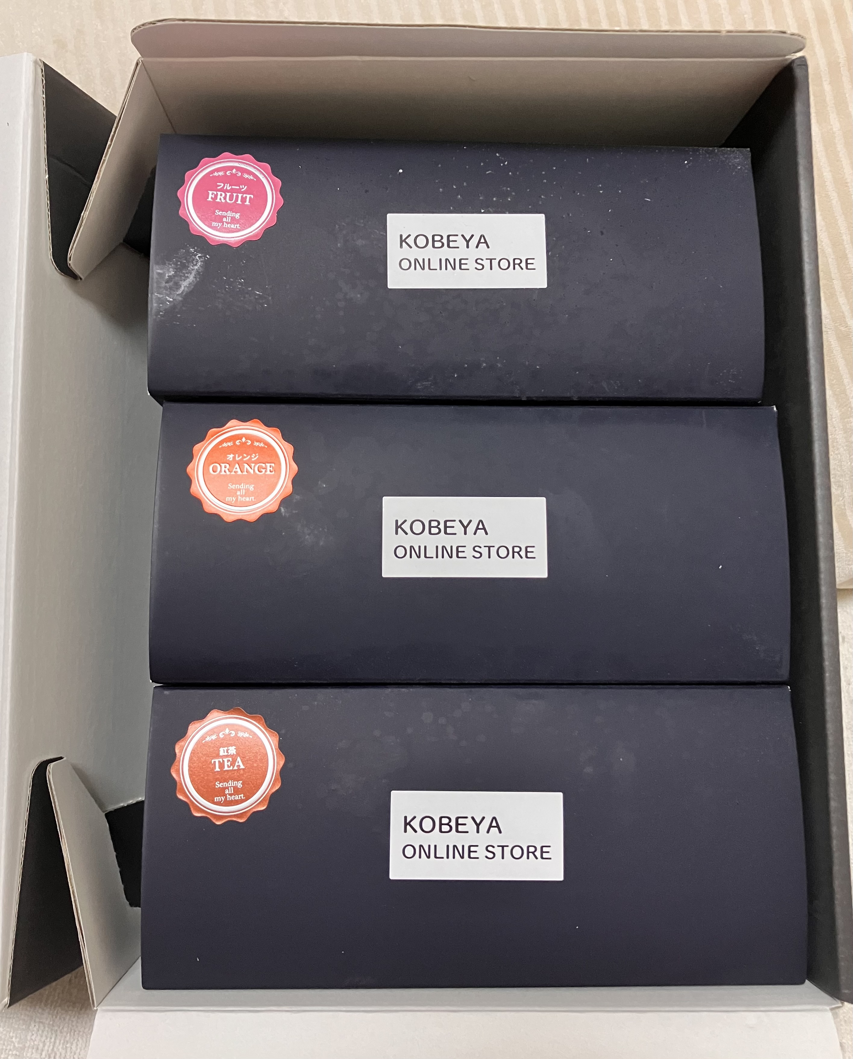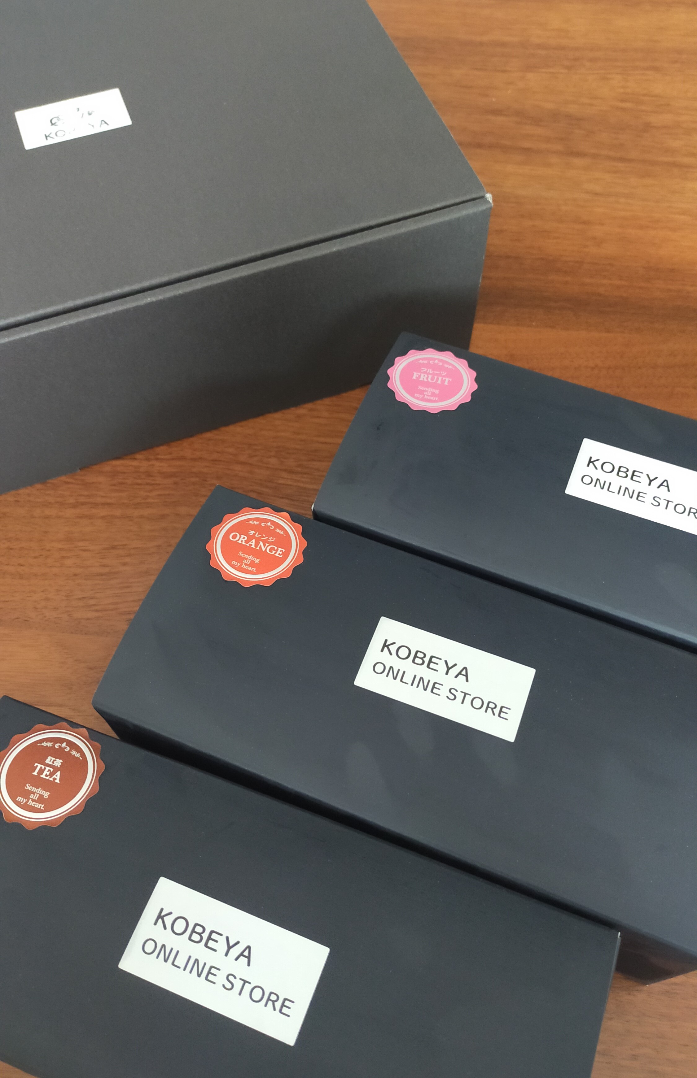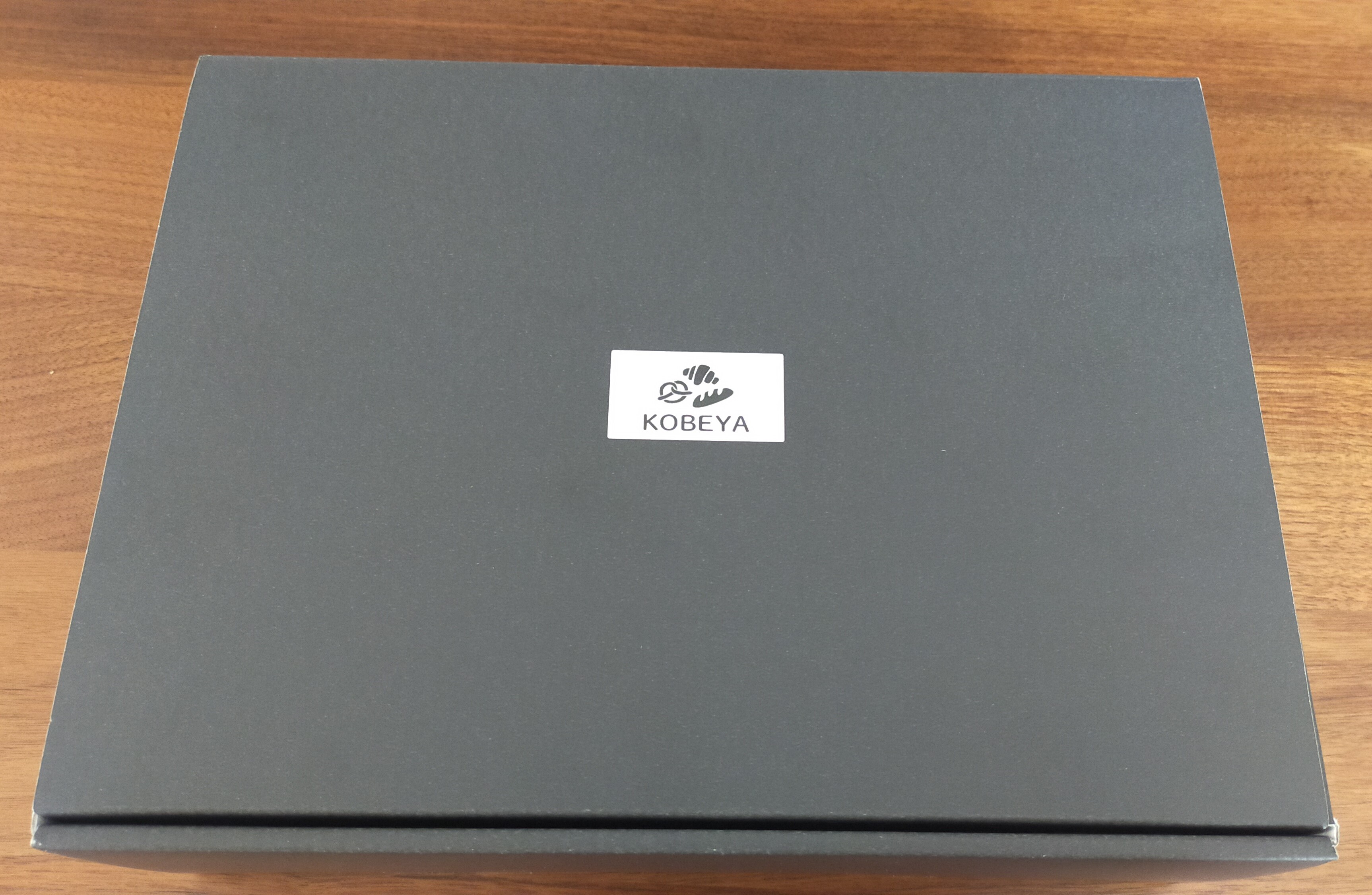 ダンボールの中に、黒の KOBEYA ロゴ入り箱。