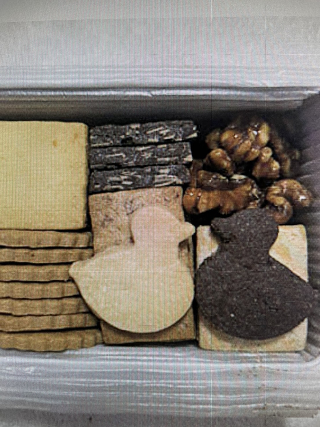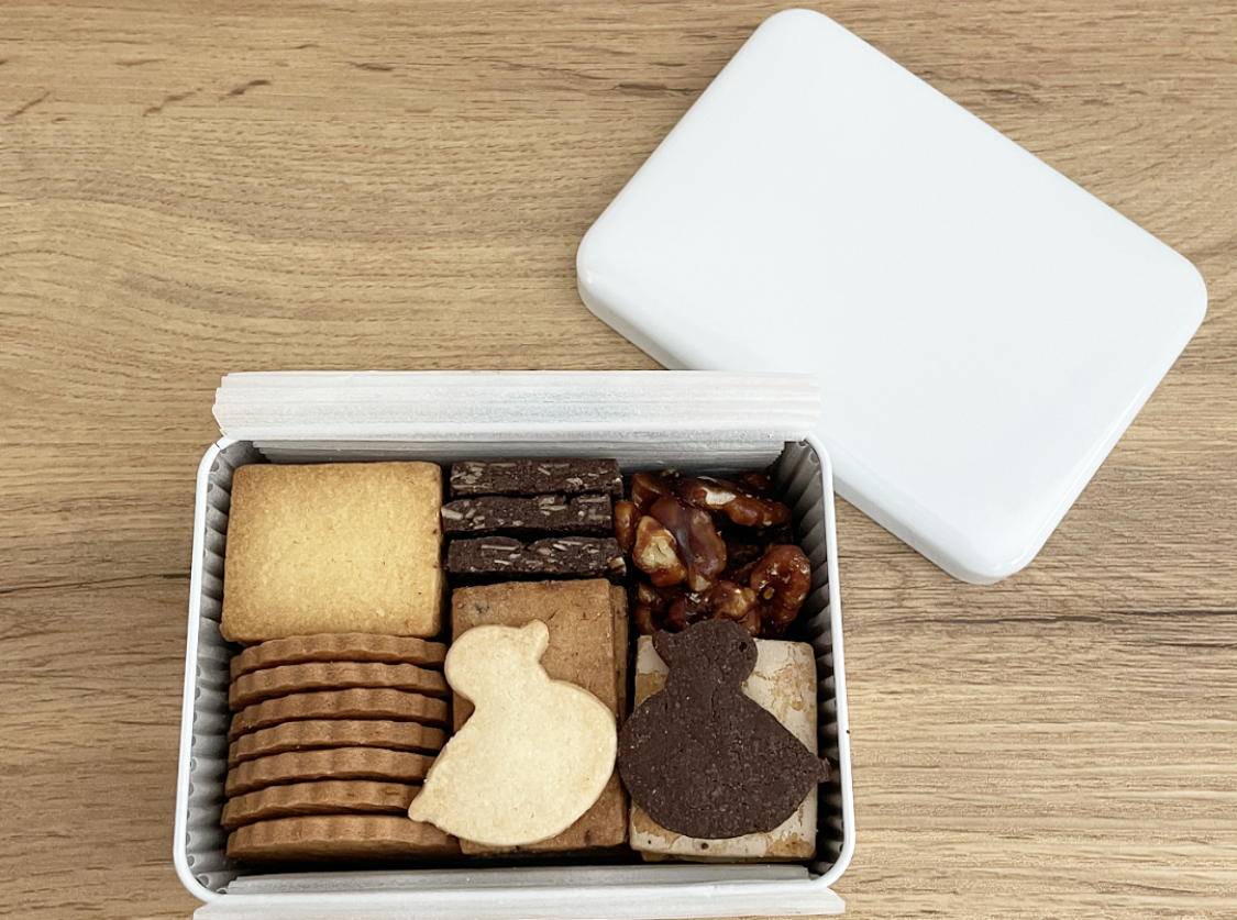 綺麗な色合いのクッキー缶入り「クッキー詰め合わせ」です。シンプルなバタークッキーから、スパイスやナッツ、ドライフルーツが入ったクッキーまで、様々な味、食感が楽しめるます。8種類のクッキーの他、口直しにはクルミのキャラメリゼ。ほろ苦さがアクセントとなり、次から次へとクッキーに手が伸びてしまうこと間違いありません。シンプルな白地の缶には、オリジナルデザインの帯をあしらっています。ご褒美おやつとしてや、手土産スイーツとしてもおすすめです。