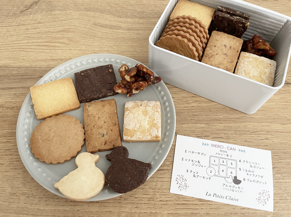 プティ・クレールのクッキーは、生地には発酵バターを使い風味豊かに、ベーキングパウダーはアルミニウムフリーを使用。クッキーの形はシンプルに、味や食感にはバリエーションをもたせて、楽しくお召し上がりいただけるよう工夫を凝らしています。