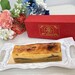 3層仕立ての「蜜芋のチーズテリーヌ」です。焼き芋ペーストを使用した濃厚な蜜芋の土台をベースに、味・見た目のアクセントとなる紫芋の層と、生クリームとクリームチーズをたっぷりと混ぜ込んだレアチーズケーキの層を重ねています。チーズケーキの表面にたっぷりグラニュー糖を乗せ、ブリュレすることで、パリッとした食感で、香り、見た目を華やかに仕上げています。金色のロゴが印象的なボックスに入って届くので手土産スイーツとしてもおすすめです。