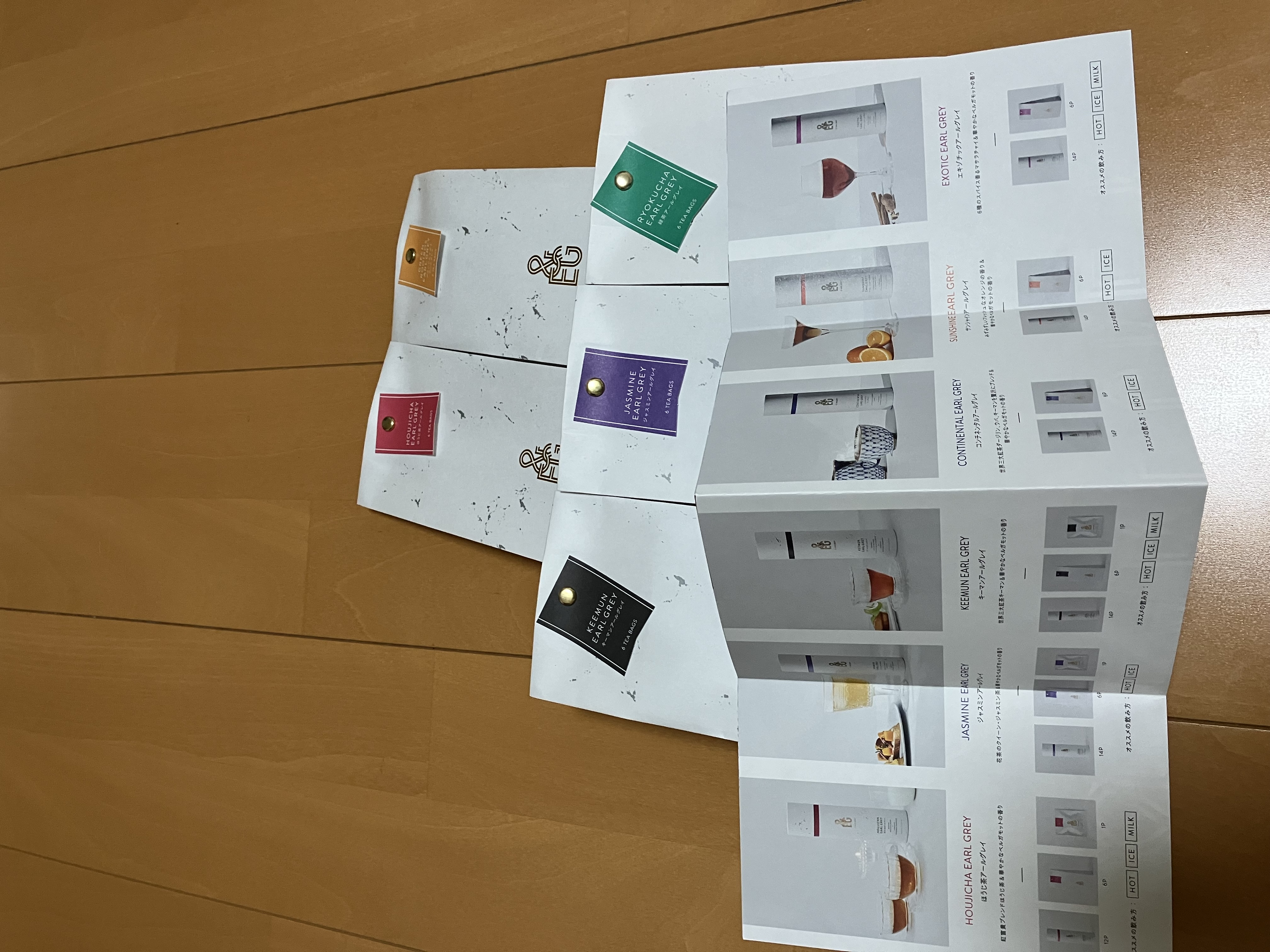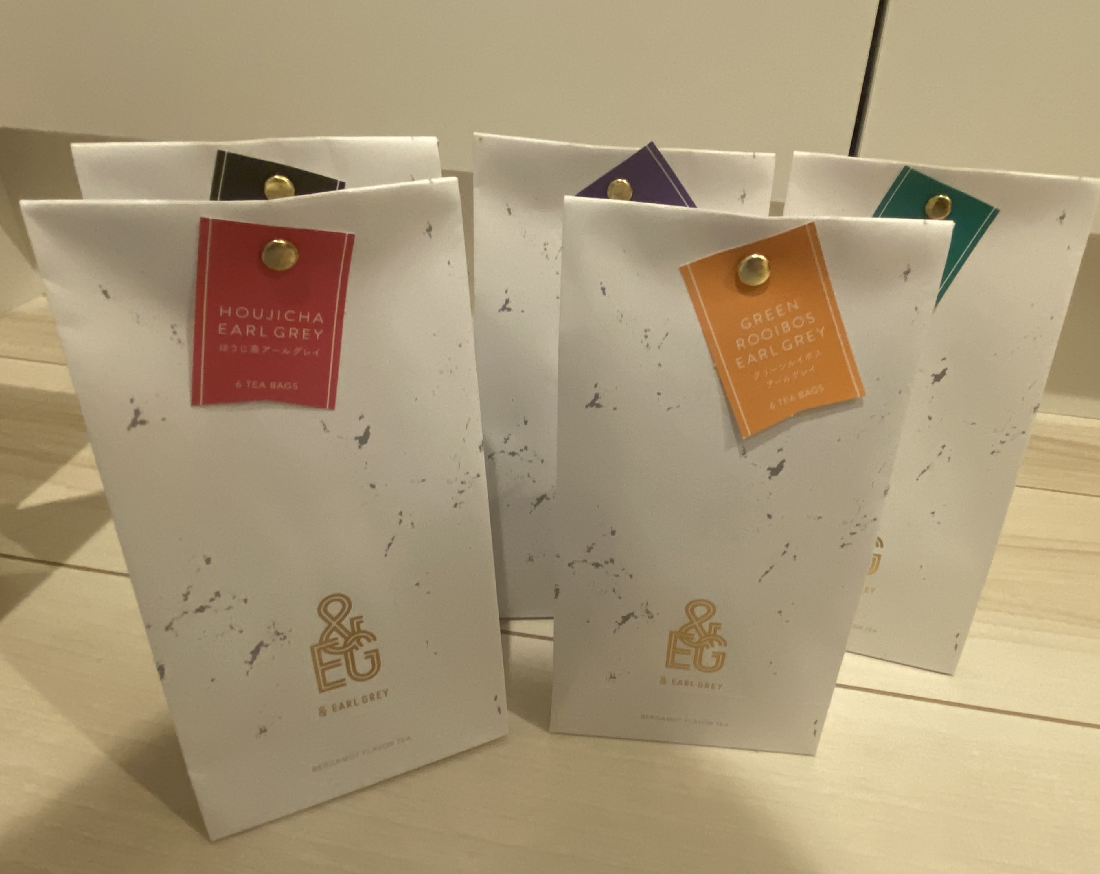 5種各1本(6ティーパック)(緑茶アールグレイ(3g)、グリーンルイボスアールグレイ(3g)、ほうじ茶アールグレイ(3g)、ジャスミンアールグレイ(2.5g)、キーマンアールグレイ(2.5g))こちらが入っています。