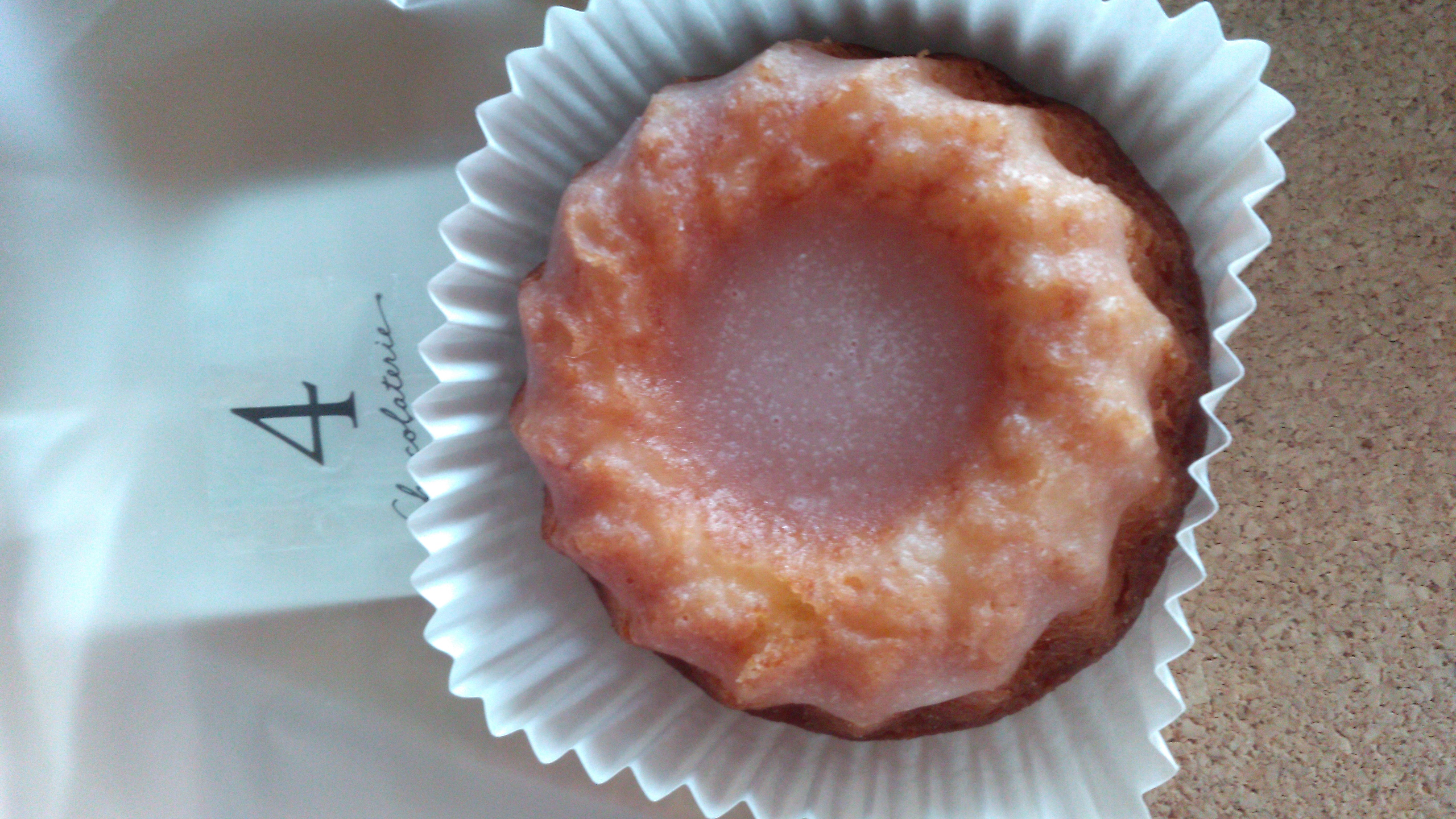 真ん中に凹みのある可愛らしい形でした。上にお砂糖がコーティングされていました。生地はしっとりとしていて、甘さはどちらかというと甘めで美味しかったです。