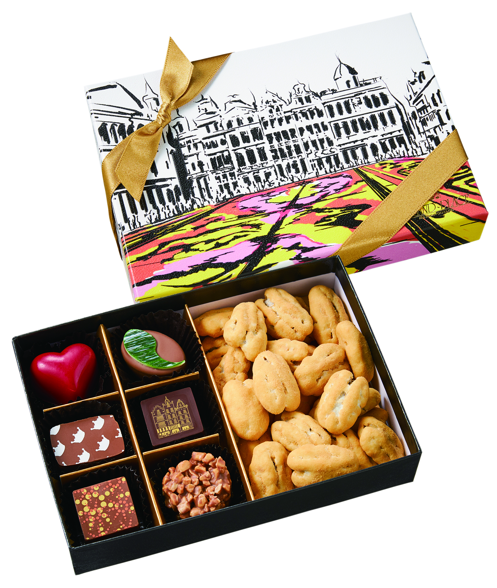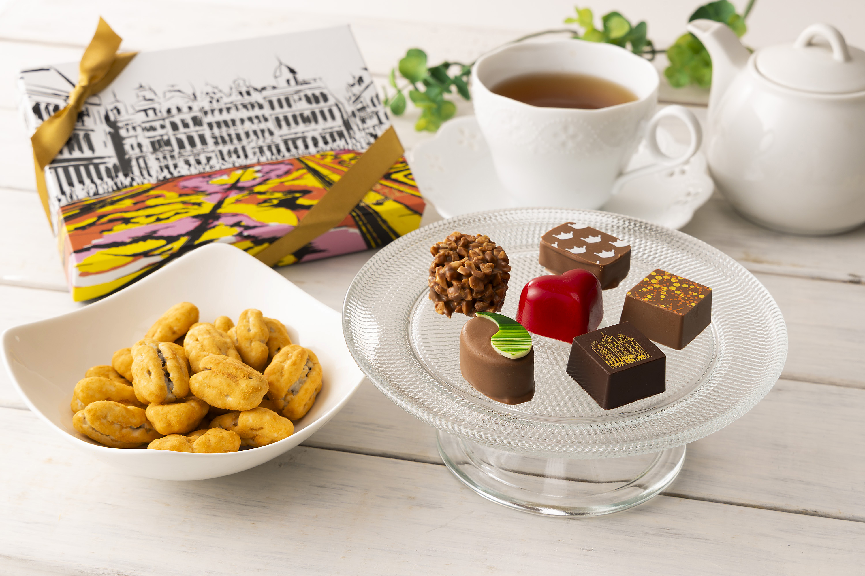 「ペカンナッツショコラ(キャラメル)」と「トリュフ」の詰合せです。「ペカンナッツショコラ(キャラメル)」は、ローストしたペカンナッツをホワイトチョコレートでコーティングし、キャラメルパウダーをまぶしています。「トリュフ」は、真っ赤な色合いが印象的な「ティーハート」やグリーンピスタチオのガナッシュをミルクチョコレートで包んだ「ピスターシュ」など6種。ベルギー産クーベルチュールを使用し、ベルギーの伝統的な製法を受け継ぎながら、日本人の味覚に合わせ、日本人ショコラティエが作っています。ベルギー・ブリュッセルにある「グランプラス広場」のイラストが描かれた専用ボックスに入って届くので、贈り物にもおすすめです。