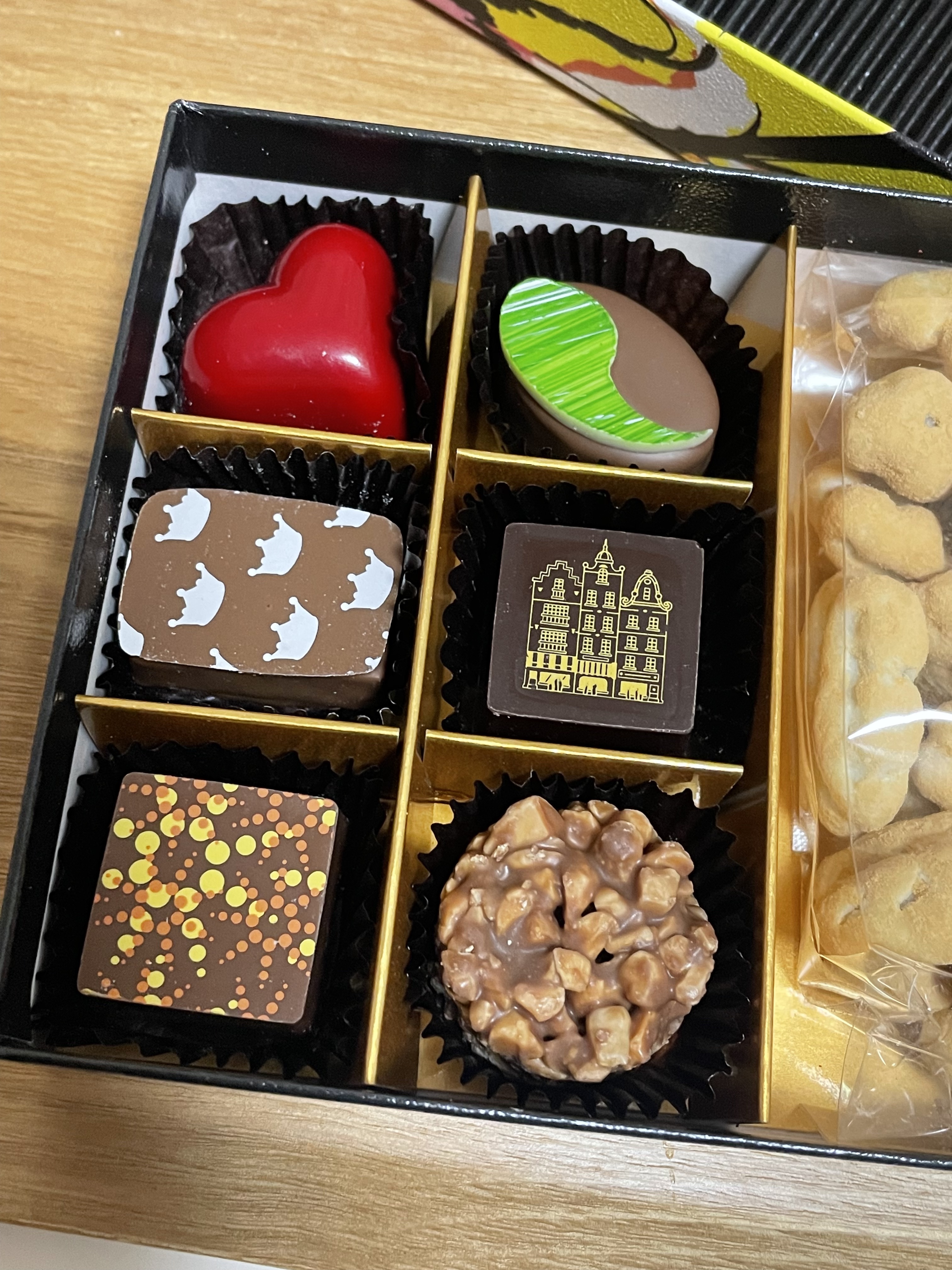 まずはトリュフチョコレート。こういうタイプのチョコが大好きなのでどれも美味しくいただきました。アマンドロッシェは普通のアーモンドチョコレートよりかなりの量のアーモンドが入っていてザックザク!ピスターシュもピスタチオがかなりの濃厚さ!ティーハートは紅茶が濃すぎるくらいの香りの高さ。コアントローはお酒にあうかんじ。マンゴーパッションはフルーツ感満載。ミルクリッチは定番の美味しさ。色々と食べられる楽しさが満載でひとつひとつ大事に食べました!そしてペカンナッツショコラ!止まらない美味しさです!ついつい一つ、また一つと食べてしまう…本当に美味しいです!これは購入ありだと思います!おすすめします!!