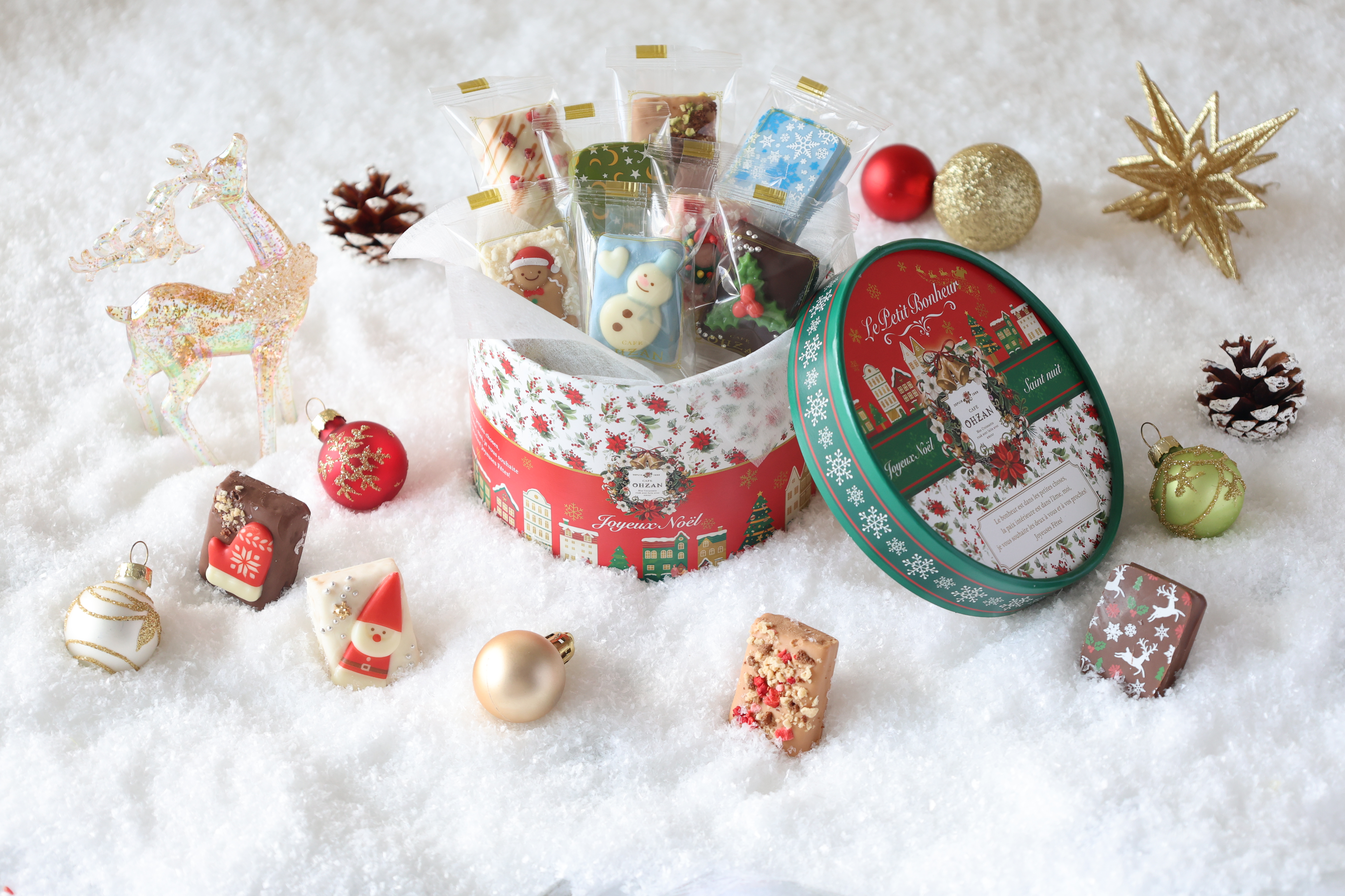 赤と緑のクリスマスらしい配色を軸に、ポインセチア・ヒイラギなどを飾りました。5個入や24個入とは箱のデザインを変えて、大人っぽい印象にしています。