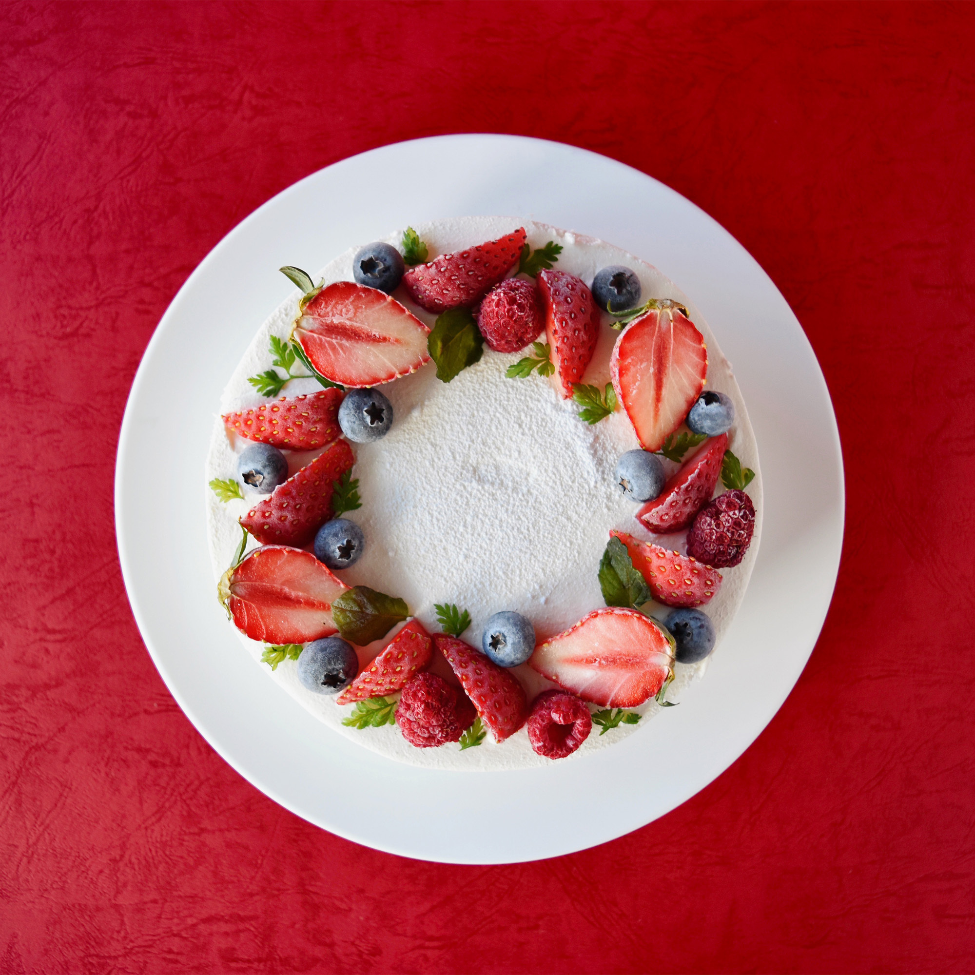 いちご、ラズベリー、ブルーベリー、ミントの葉を使い、クリスマスリースをイメージしたデコレーションに仕上げました。