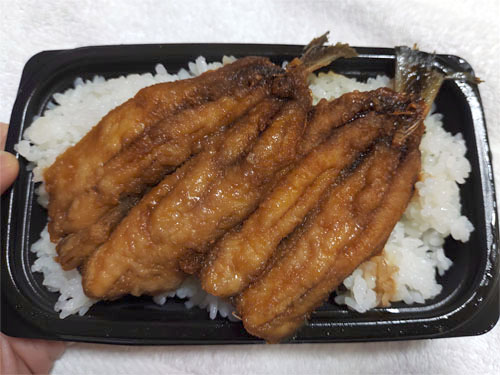 ・いわし蒲焼ご飯は、イワシの小骨がなくなるように1匹ずつ手開きし、さらに二度揚げして蒲焼にしています。少し甘めのたれに絡めて濃い味付けとなっていますのでご飯が進みます。