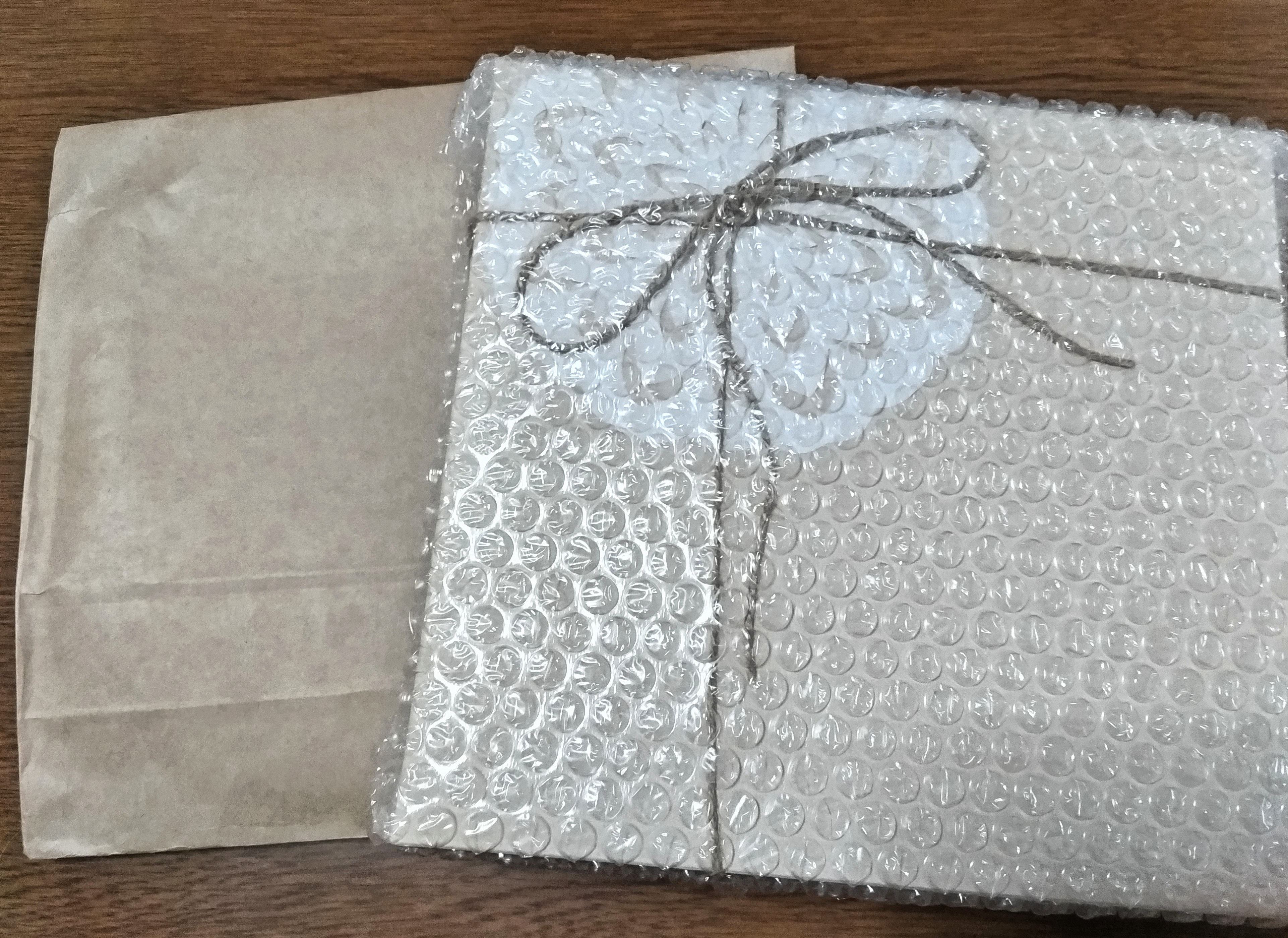 箱がプチプチの緩衝材でくるまれて黄土色の紙袋に入っています。