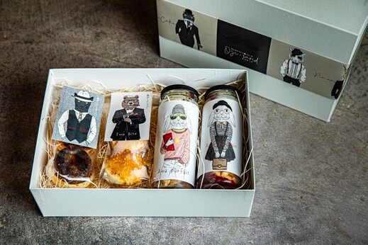 おじさんフレンチシェフが作るスイーツ専門店の「パイ」セットです。144層のパイ生地をザクザク・サクサク食感に焼き上げました。焦がしキャラメルチーズパイ「TwoBites」は、ザックザクパイの上に、濃厚なNYスタイルチーズケーキをのせ、表面をキャラメリゼしています。2口で食べるのがおすすめです。泡状ムースとパイのパフェ「AwaParafit」は、エスプーマという特殊な泡状のムースとパイで作った、濃厚なのに軽い食感のパフェです。それぞれ2種セットなので食べ比べが楽しめます。イラストが印象的なボックスに入って届くので、贈り物にもおすすめです。