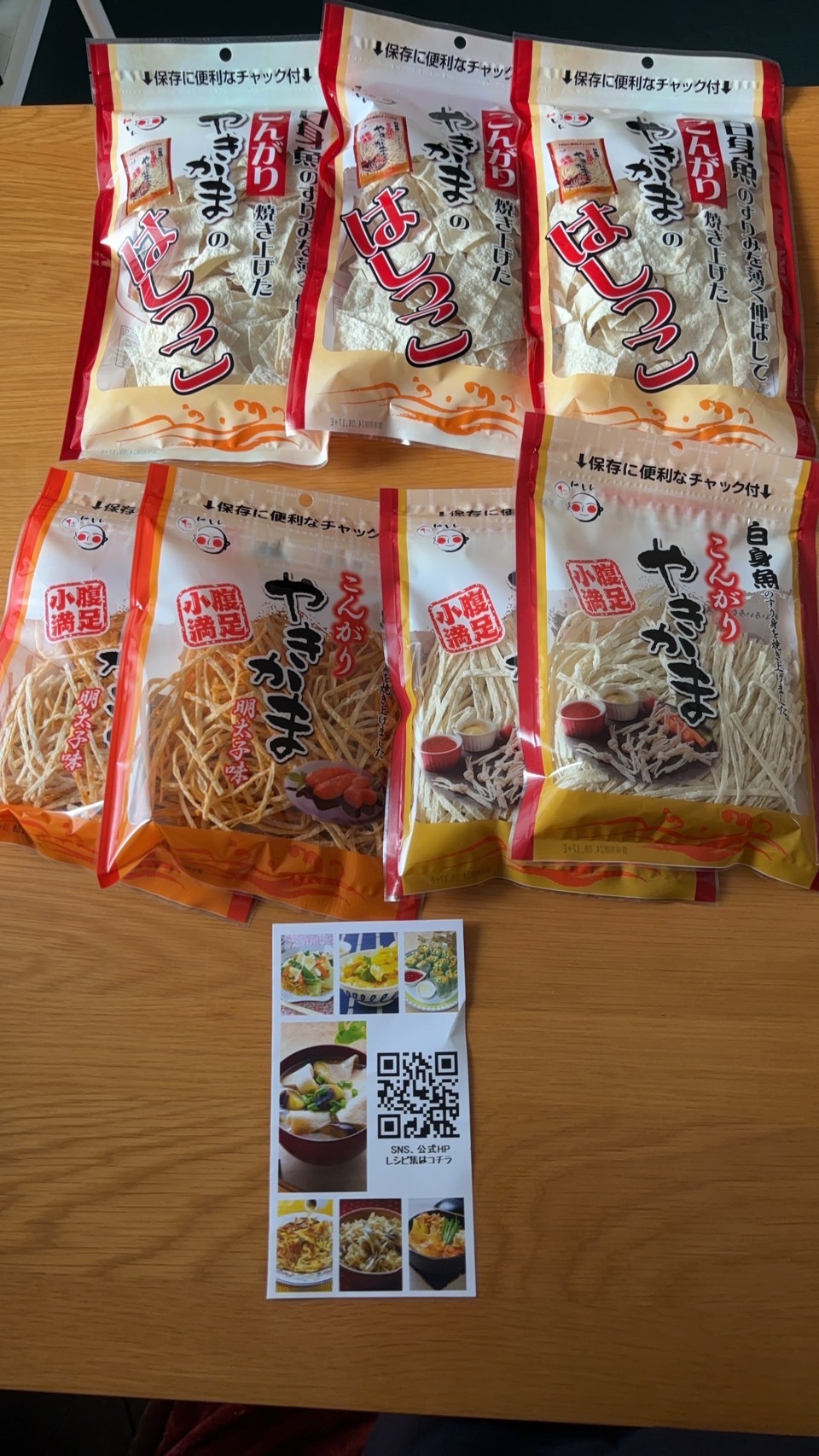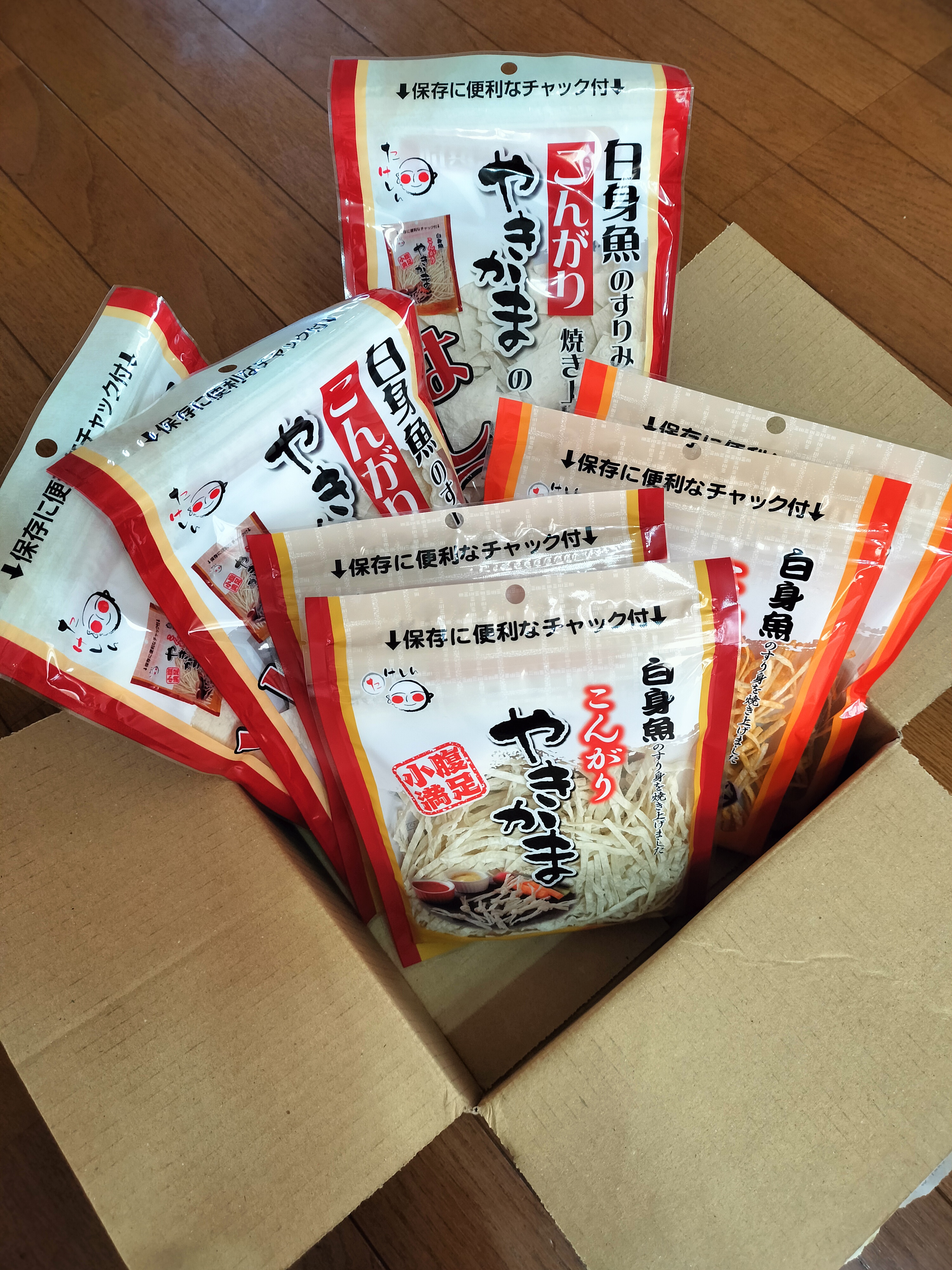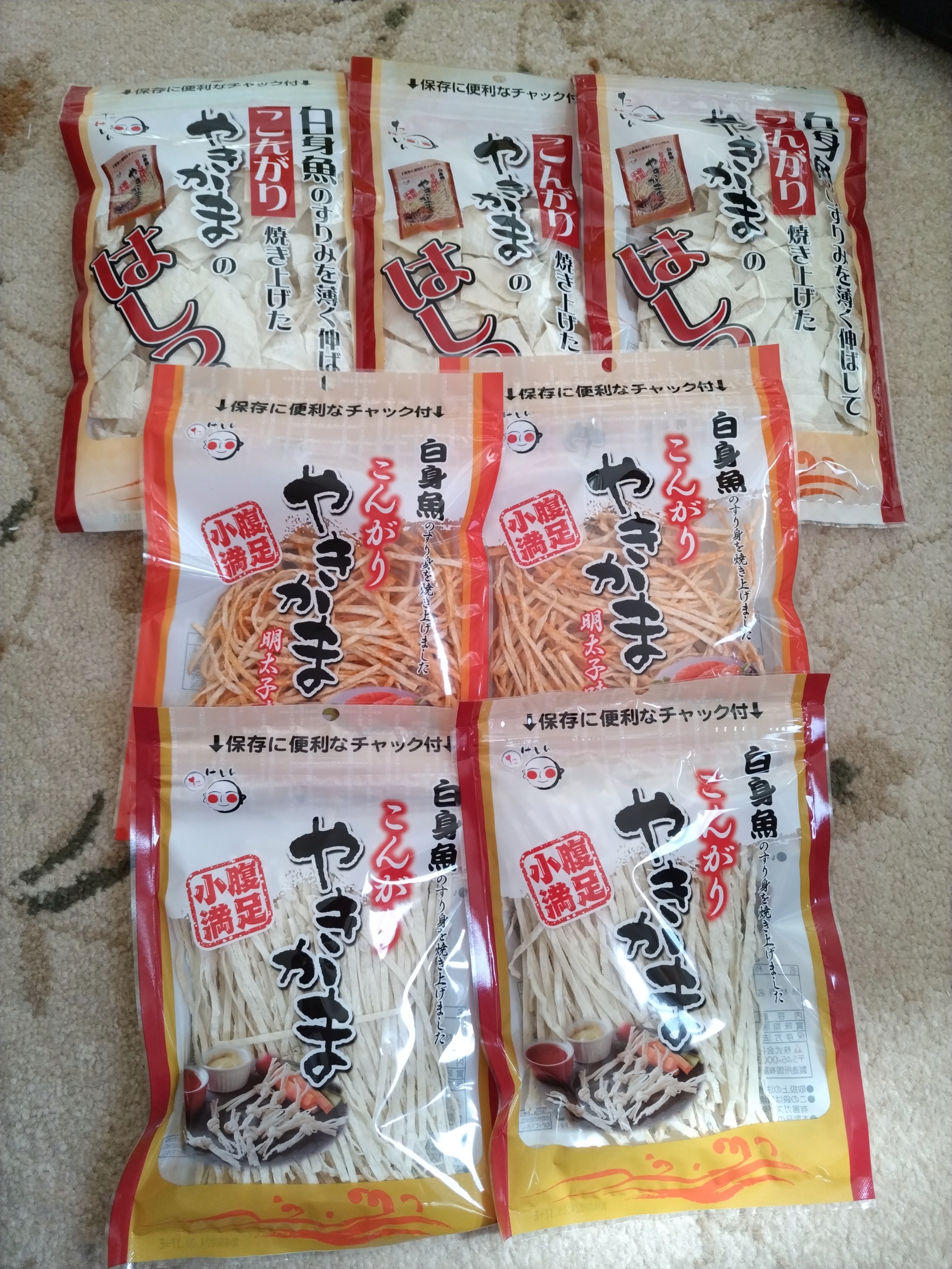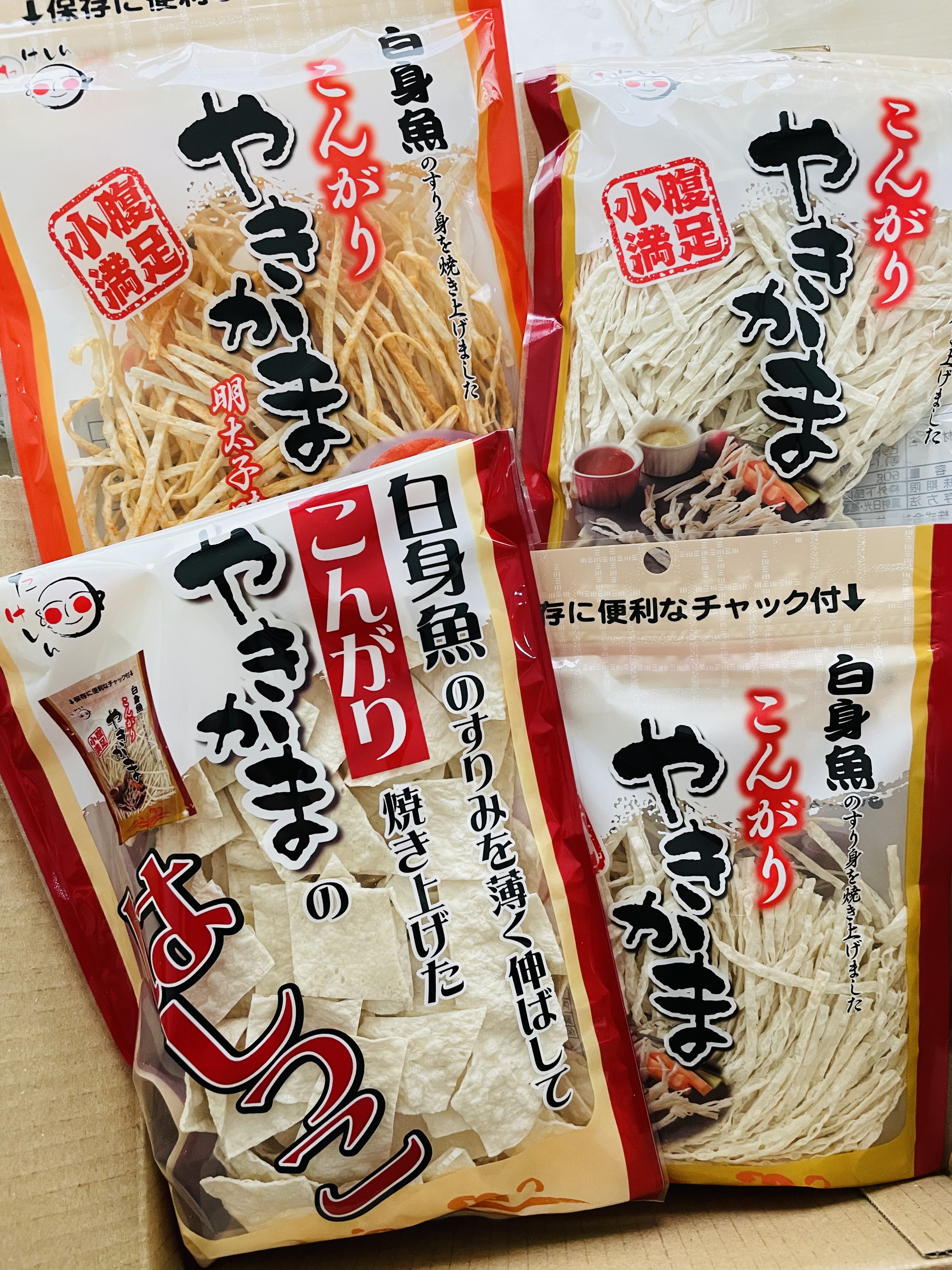 白身魚のすり身を薄く伸ばし、こんがり焼き上げた「やきかま」です。通常の「細切りタイプ」、ピリ辛の「明太子味」、やきかま製造時に発生する、魚肉シートのはしっこ等をお徳用パックとして詰め合わせた「やきかまのはしっこ」の3種。食感や味が異なるセットなので食べ比べが楽しめます。賞味期限が150日もあり、そのまま食べるだけでなく、料理にも利用できます。チャック付パッケージなので保存するのに便利です。