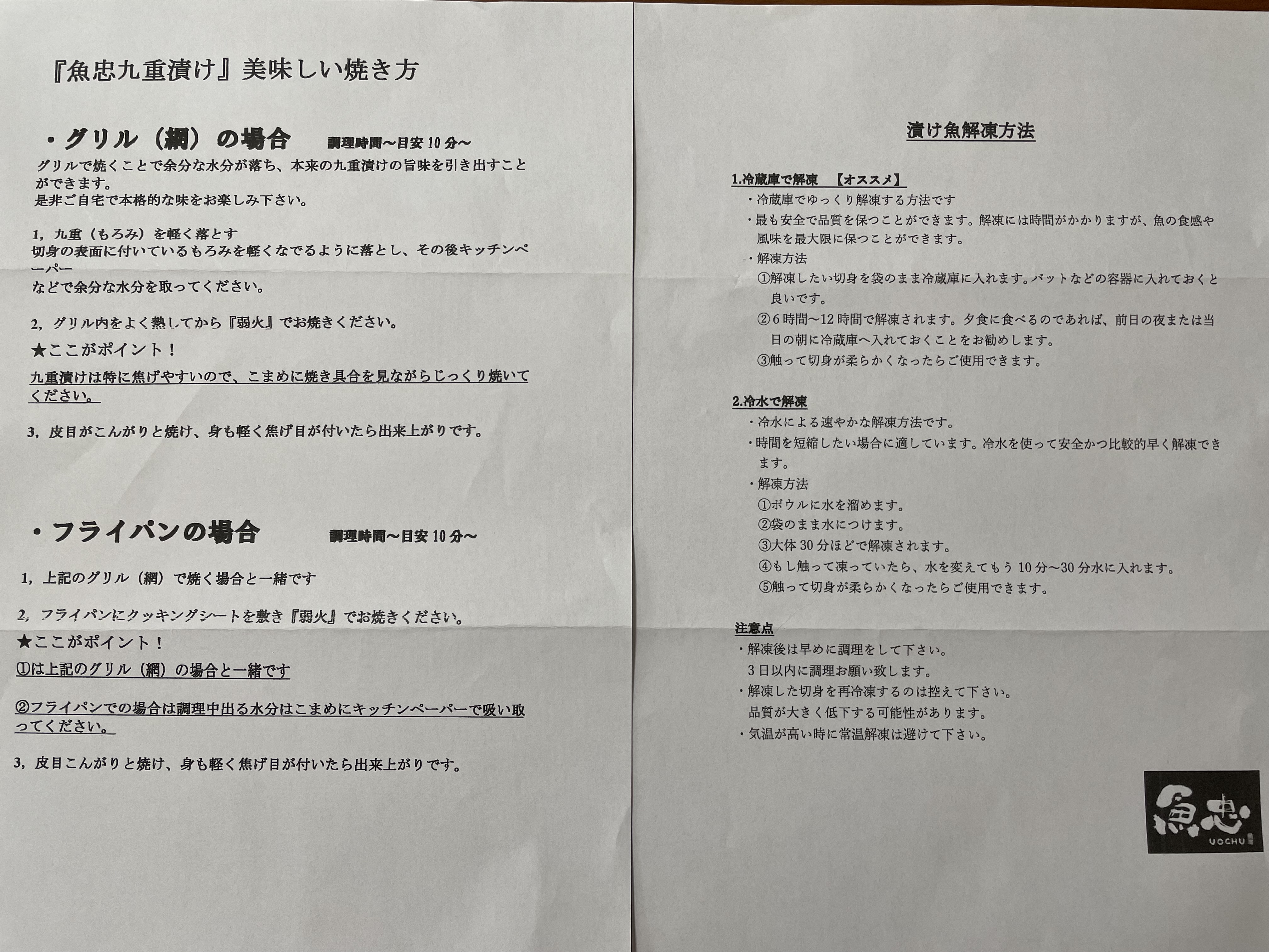 解凍方法、焼き方の説明用紙も同封していますので、安心して調理していもらえます。