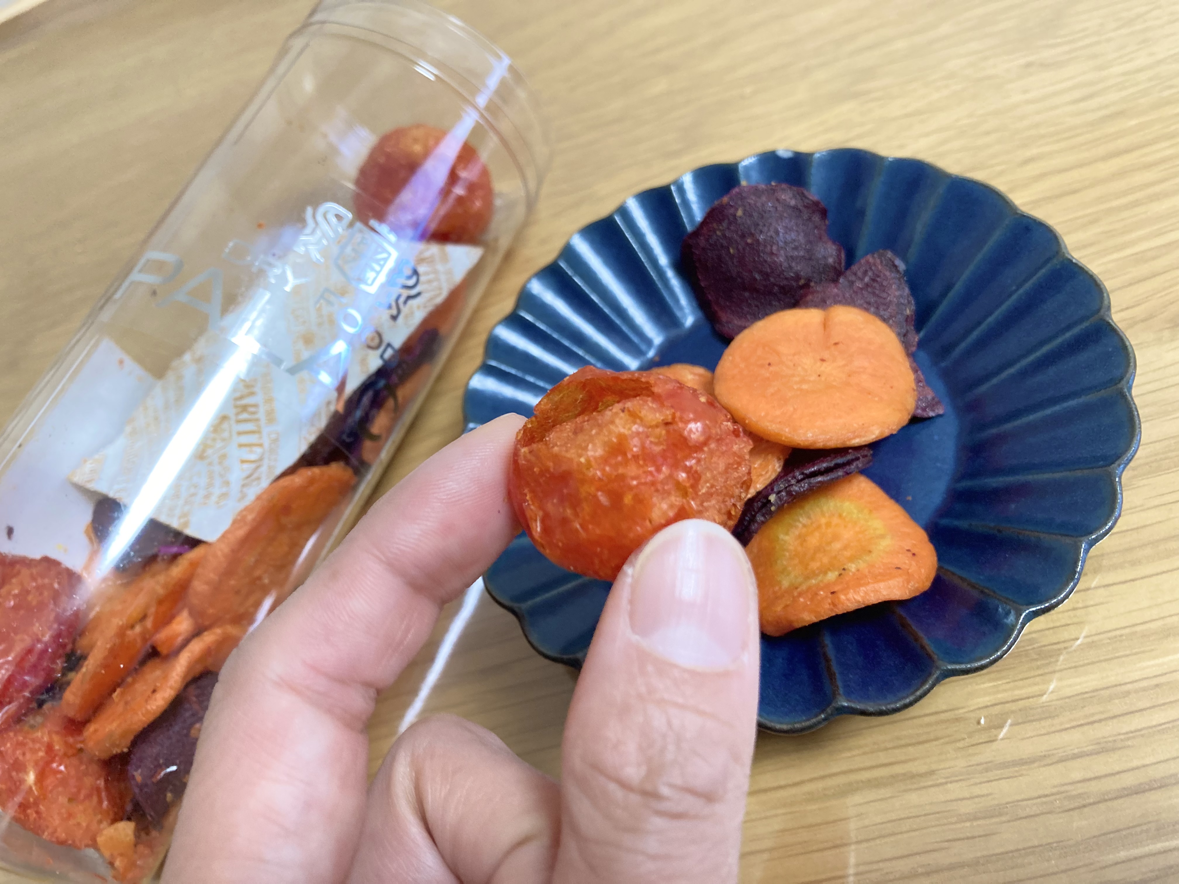 3種類共通して、野菜本来の味を調味料でマスクせず活かしていて、お菓子という感覚ではなくしっかりお野菜というお味です。様々な野菜が使われていますが、それぞれ均等に詰められています。とても軽い食感で食べやすく、チップスと言いながら食べたら健康に近づけるような商品です。