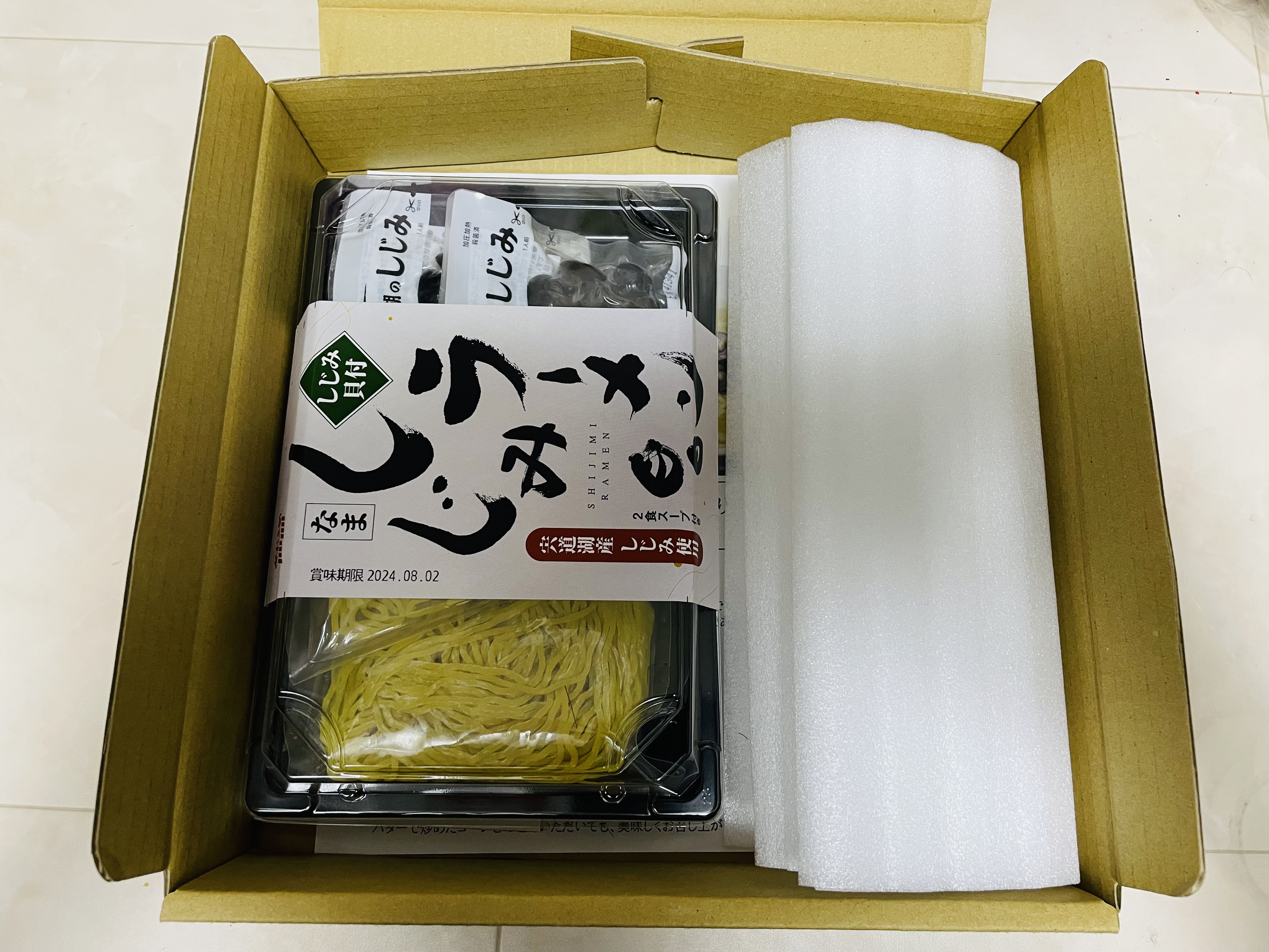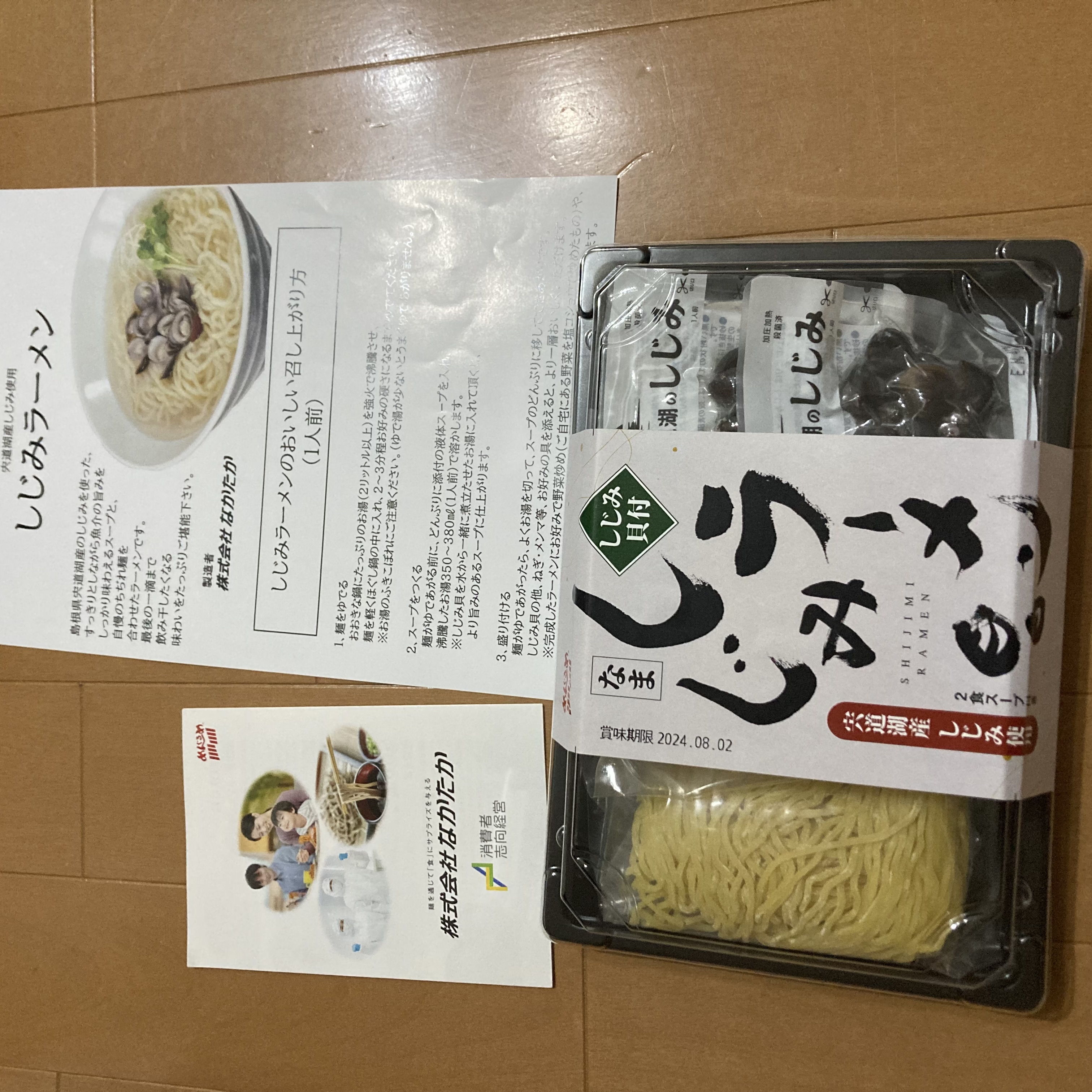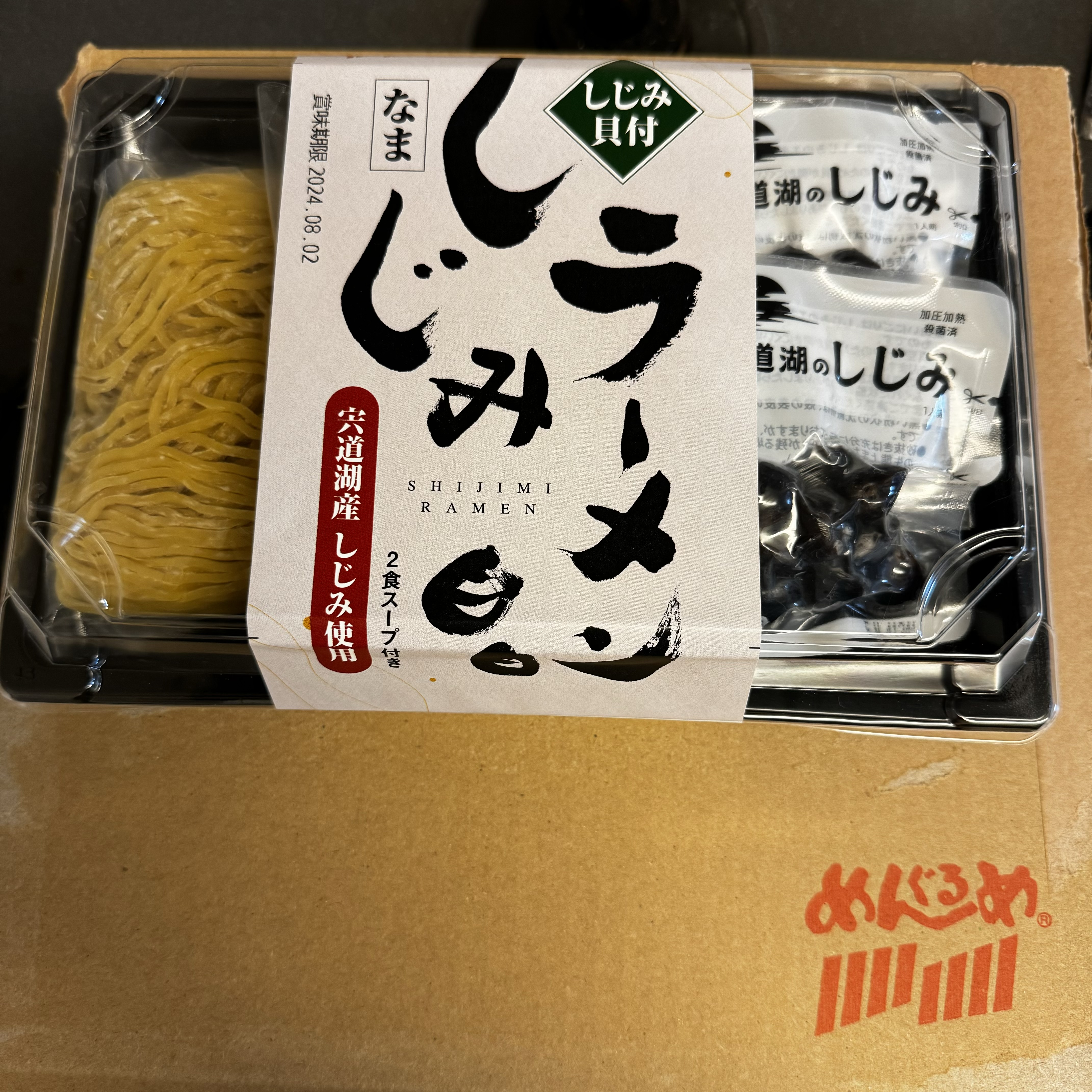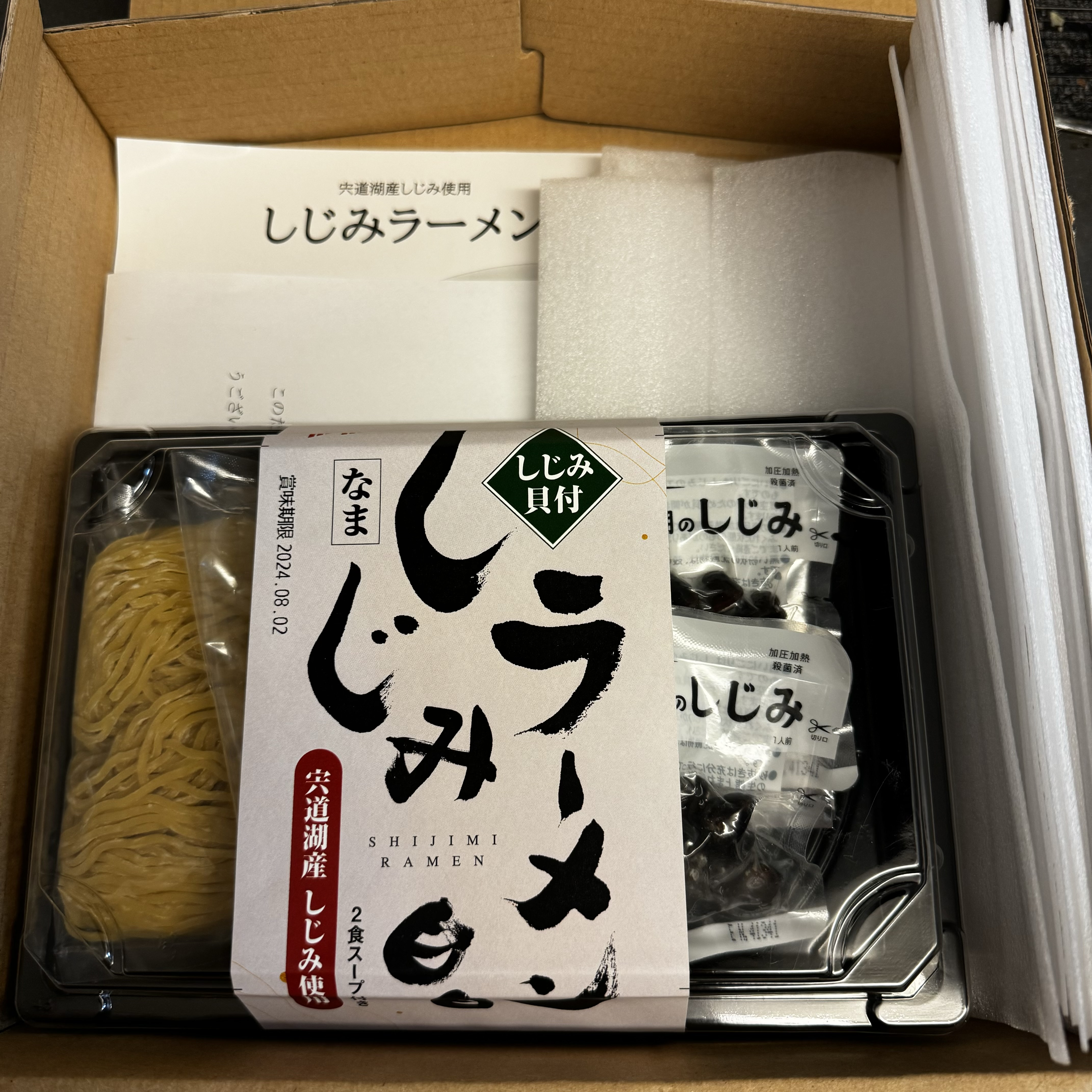 中を開けて見るとコンパクトに2食分のしじみラーメンがまとまった感じで箱の中に納まっていました。