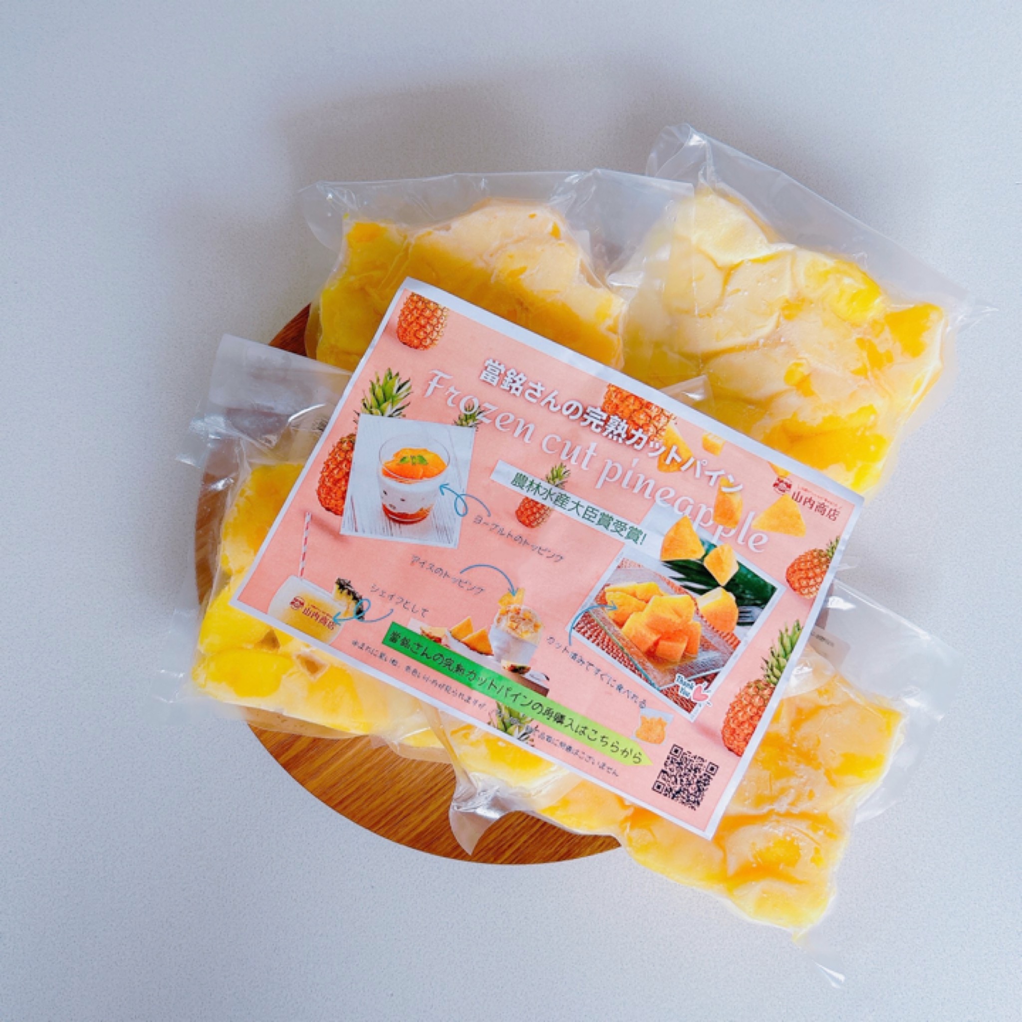 農林水産大臣賞を受賞した、沖縄県石垣島のパイナップル農家 當銘(とうめ)氏が作ったティダパインだけを使用した「完熟カットパイン」です。国内で流通するパイナップルの95%以上が輸入物である状況の中で、希少な国内産です。ティダパインは、酸味が少なく甘い、ジューシーで上品な香りが特長。完熟の状態で収穫し、石垣島内で加工しているので、甘みや香りはそのままに鮮度を保った状態で商品になっています。カット済みなので、案外面倒なカットが不要。賞味期限は加工から2年と長く、冷凍保存可能なので、ストック食材としてもおすすめです。