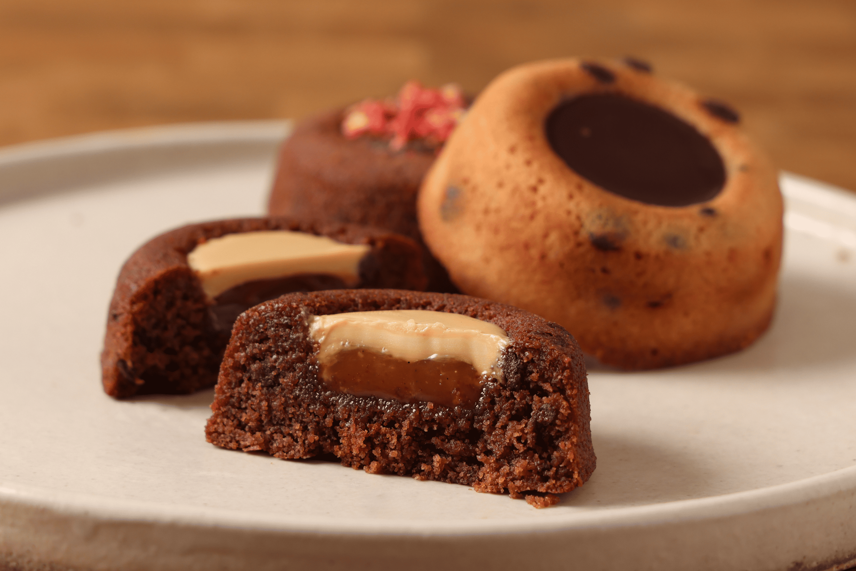 焦がしバターをたっぷりと使用したリッチな生地には、チョコチップとバニラを練り込み深みを追求。中央には、厳選カカオの濃厚なチョコレートや、季節の旬の素材、そしてなめらかなクリームの美味しさが、繊細に閉じ込められています。