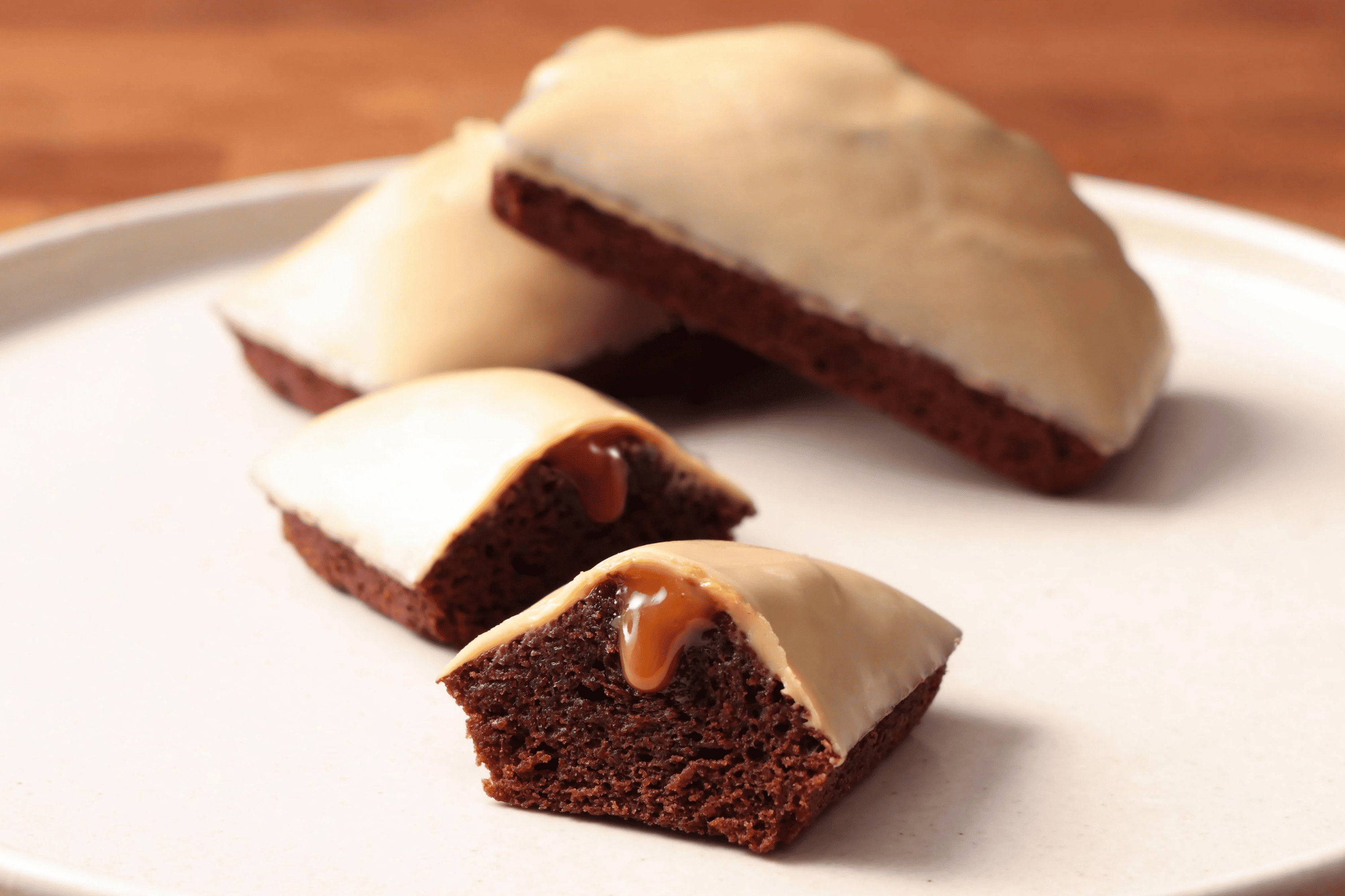 天面は、カカオバターを豊富に使用したブロンドチョコレートでコーティング。ビスケットのような香ばしさとキャラメルのコクが一体となる、至福の口どけをお楽しみください。