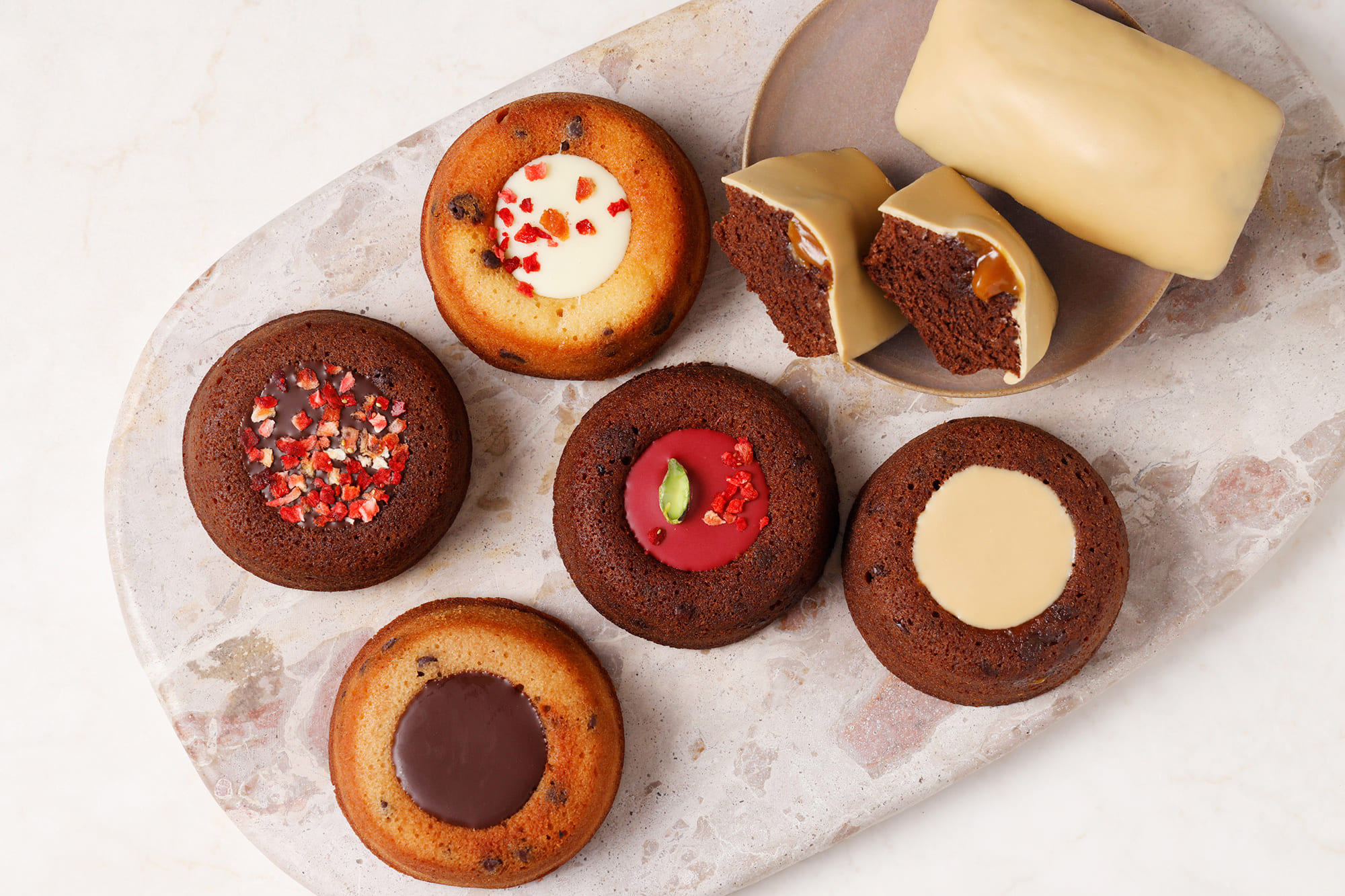 フィナンシェブロンドキャラメルは、手作りの塩キャラメルと本物のチョコレートで生地を仕上げ、どの状態でも美味しく味わえるよう工夫しました。ティグレは、焦がしバター香るしっとり生地にチョコチップやクリーム、ジュレを重ね、上にはパリッとしたショコラをのせています。