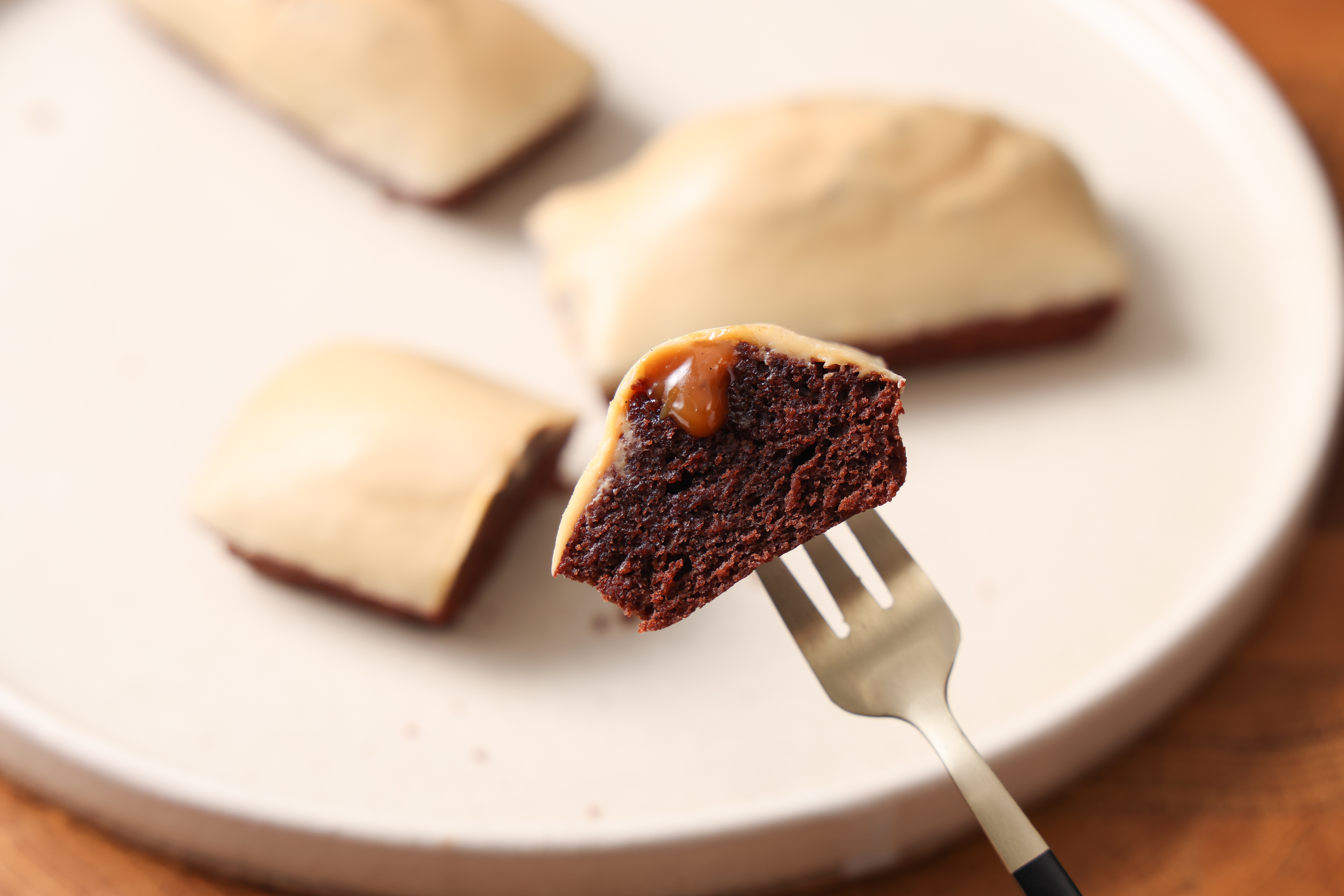 バターと卵の量を極限まで少なくすることでしっとりとした食感にしています。また、違和感なくチョコと生地の味わいを楽しんでいただけるように、チョコレートをディップした部分の生地とチョコの味わいの差を少なくしました。