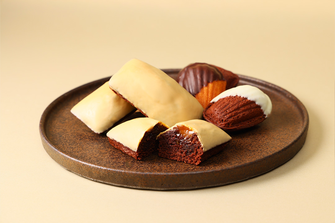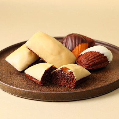 「フィナンシェブロンドキャラメル」と「ショコラマドレーヌ」のアソートセットです。「フィナンシェブロンドキャラメル」は、話題のブロンドチョコレートでコーティングしたショコラフィナンシェの中に、塩キャラメルソースが入ったオリジナル焼菓子。「ショコラマドレーヌ」はプレーンとショコラの2種類のマドレーヌ生地に、カカオの産地や苦みの異なるチョコレートをディップしました。ショコラティエこだわりのフィナンシェとショコラマドレーヌを1箱で食べ比べできる贅沢なセット。自宅でのティータイムはもちろん大切な人への贈り物としてもおすすめです。