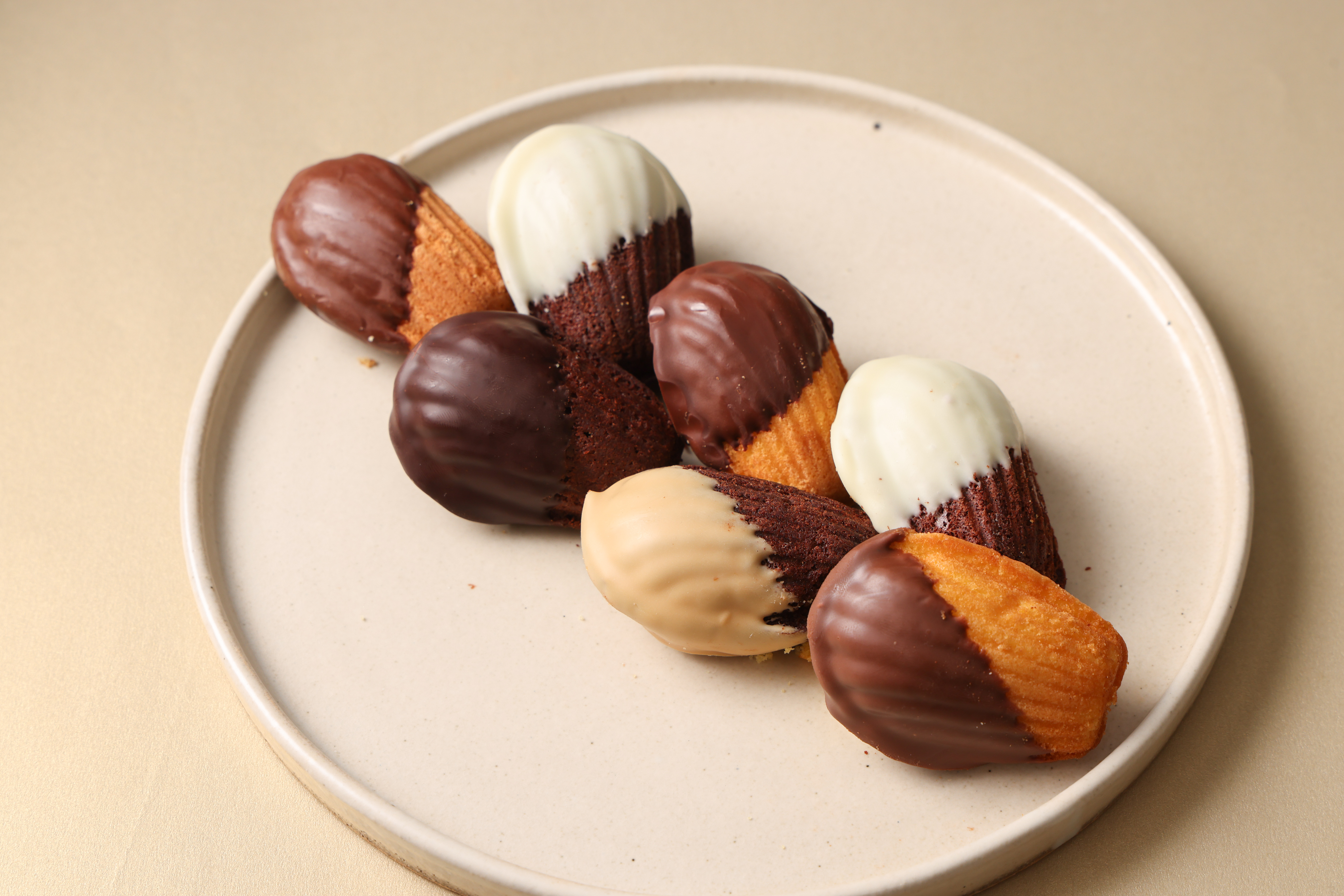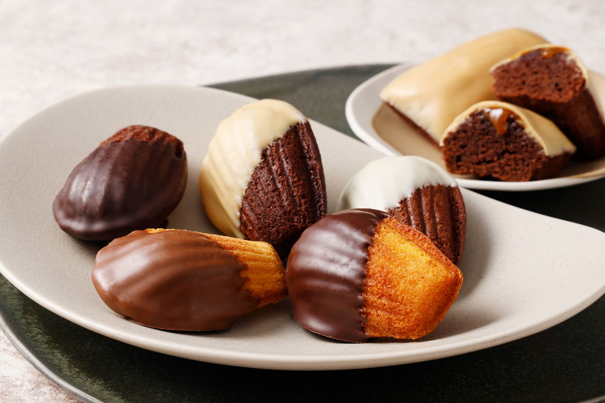 プレーンとショコラの2種の生地に、カカオの産地や苦味が異なるチョコレートをディップ。ひと口目からチョコと生地が一体となった濃厚な風味を楽しめ、食べ進めるごとに生地の香ばしさとバターの豊かな香りが広がり、奥行きある味わいに仕上げました。