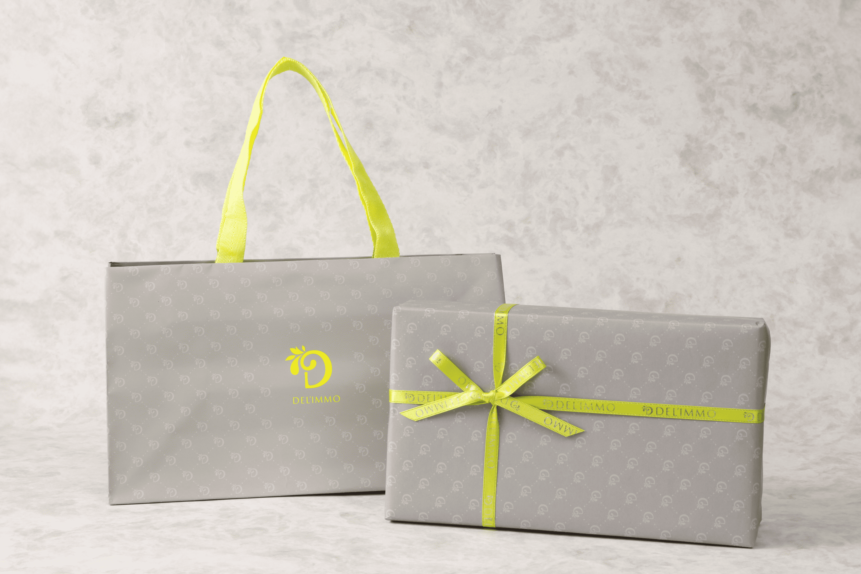 デリーモカラーのグレーとグリーンを基調にした、シックでシンプルなお包みでお届けします。