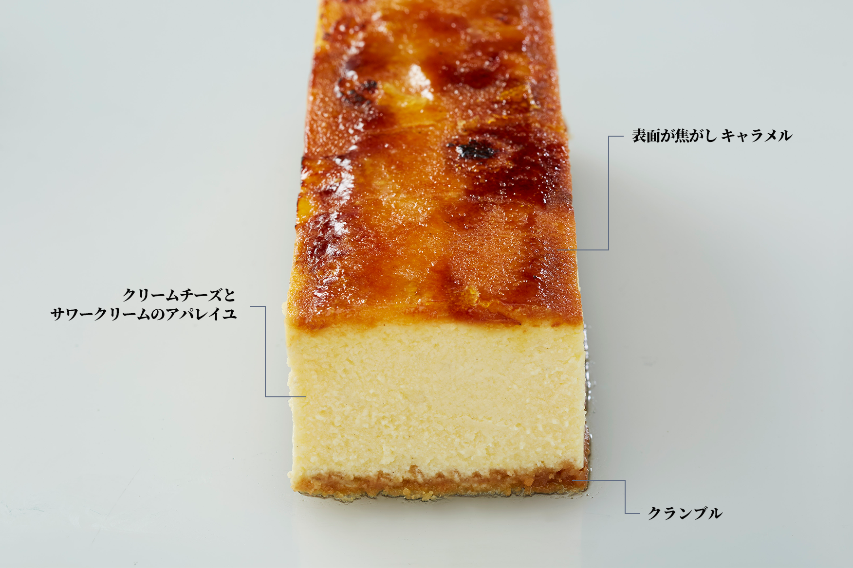 クラシカルなベイクドチーズの表面に、香ばしい焦がしキャラメルを敷き詰め、ガリガリの食感をプラス。一度食べ始めたら止まらない、チーズとキャラメルのマリアージュをお楽しみください。