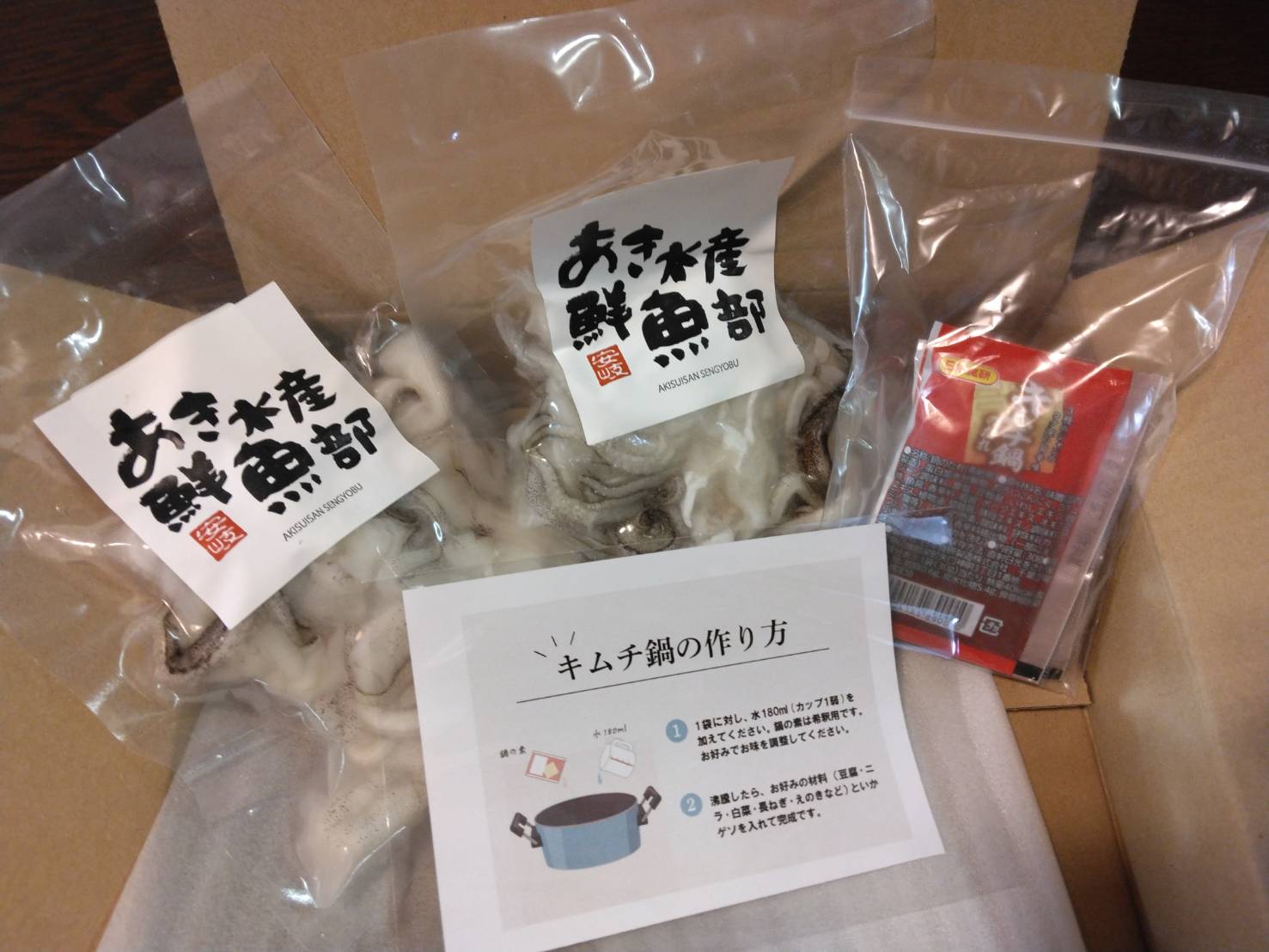 いかゲソのパックのほかに、国産味噌とニンニクやコチュジャンと仕上げた希釈用のキムチ鍋の素が付いてきます。