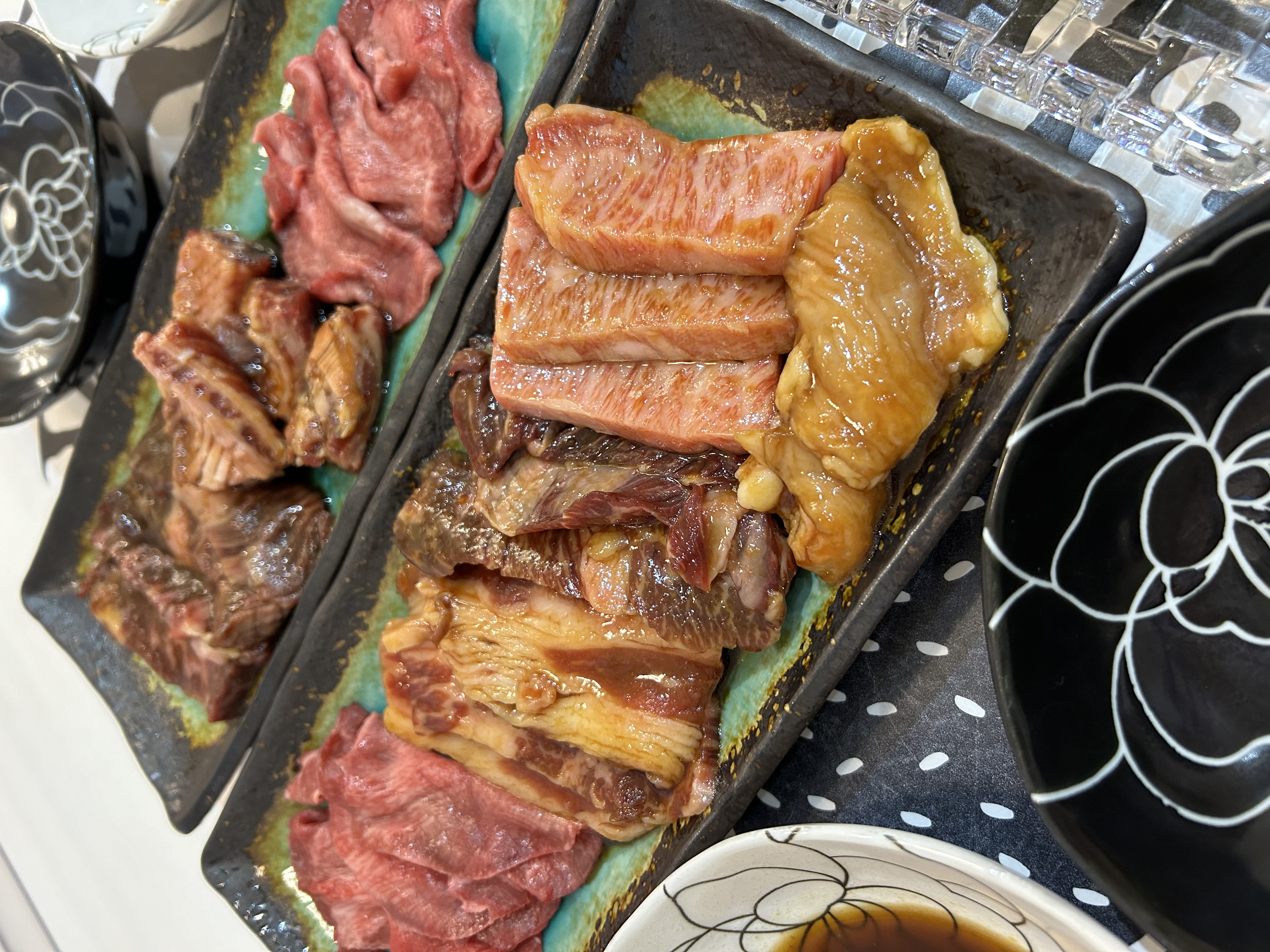 国産和牛カルビ、米国牛上ハラミ、カルビ、タン、大腸を少しずつ食べ比べできるセット。