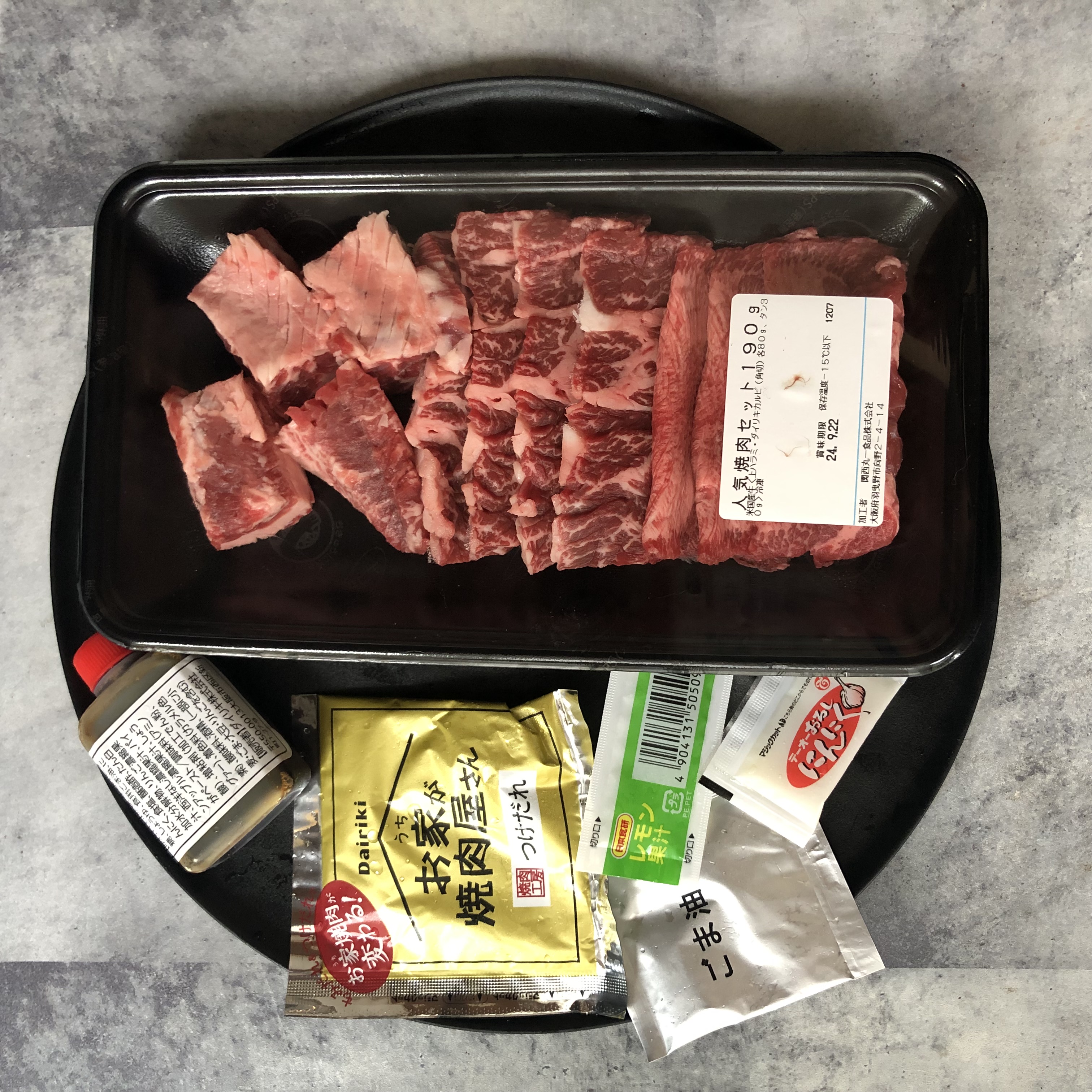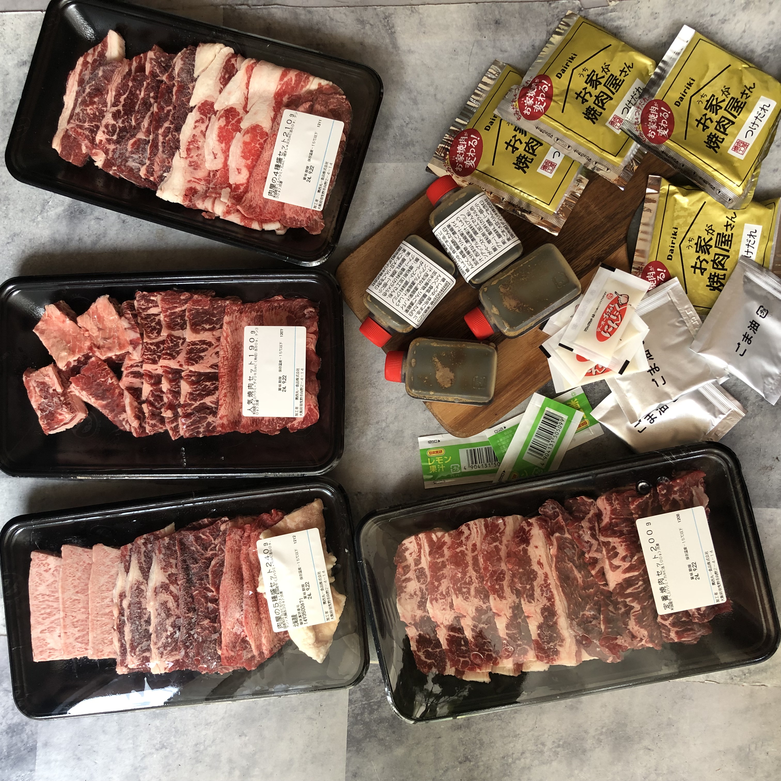 お肉以外に、もみだれ、つけだれ、ごま油、おろしにんにく、レモン果汁が付いてくるので特に自分で何も用意せず焼肉を始められます。