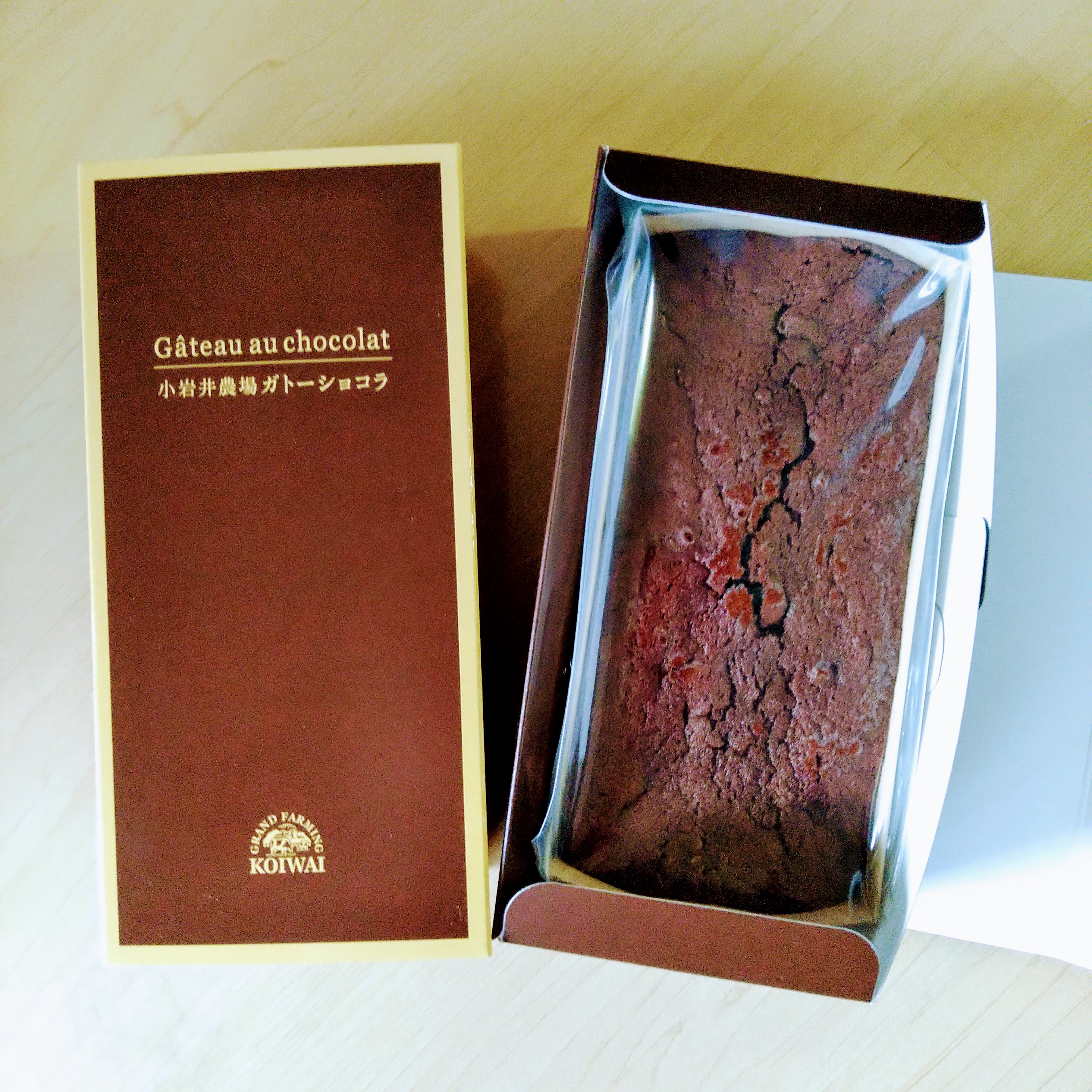 梱包は段ボール箱と梱包材、そして本体の箱。開けるのに全くストレスがありません。ワクワクしてツヤのある本体の箱を眺めることができました。本体の箱はその中のガトーショコラをそのまま箱にしたかのような濃い茶色に金色のラインと文字。これだけでも一目で良いものだと分かるのですから小岩井さんはすごいと思います。箱の裏には原材料表示がありますがこれもシンプルで、なんと12種類、ガトーショコラを作るのに必要な材料だけです。それでも1ヶ月以上日持ちするのですから手土産にもぴったりです。