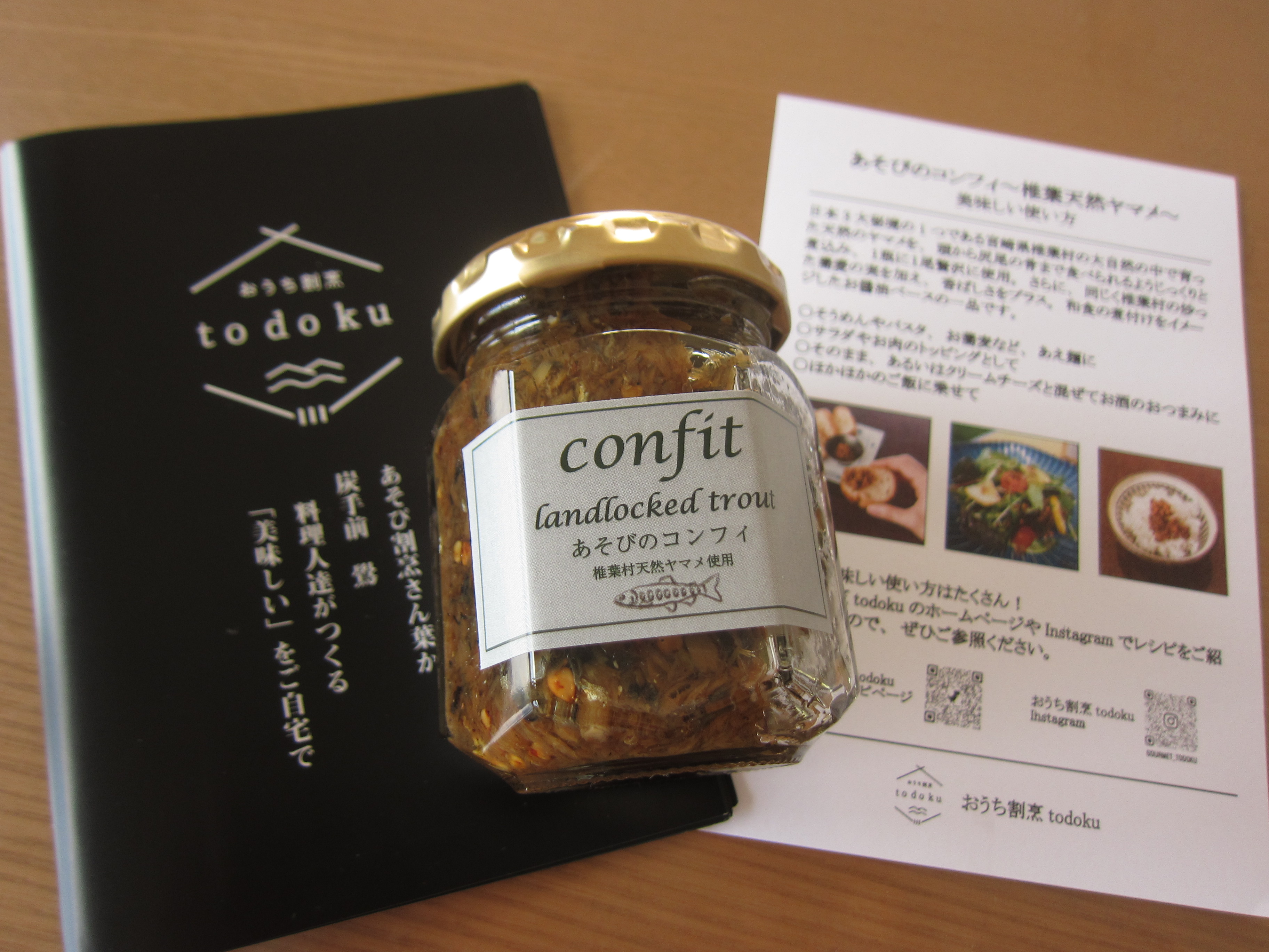 東神田「あそび割烹 さん葉か」、人形町「炭手前 鷽」の料理人が考案した「ヤマメの瓶詰め」です。日本の3大秘境の1つである宮崎県椎葉村の大自然の中で育った天然のヤマメを、1瓶に1尾贅沢に使用し、頭から尻尾の骨まで食べられるようじっくりと煮込んで作り上げました。さらに、椎葉村の炒った蕎麦の実を加え、香ばしさをプラス。和食の煮付けをイメージした醤油ベースの佃煮の様な商品。そのままでご飯のおかずやお酒のおつまみに、また、和え麵やサラダのトッピングなど、幅広く利用でき便利です。