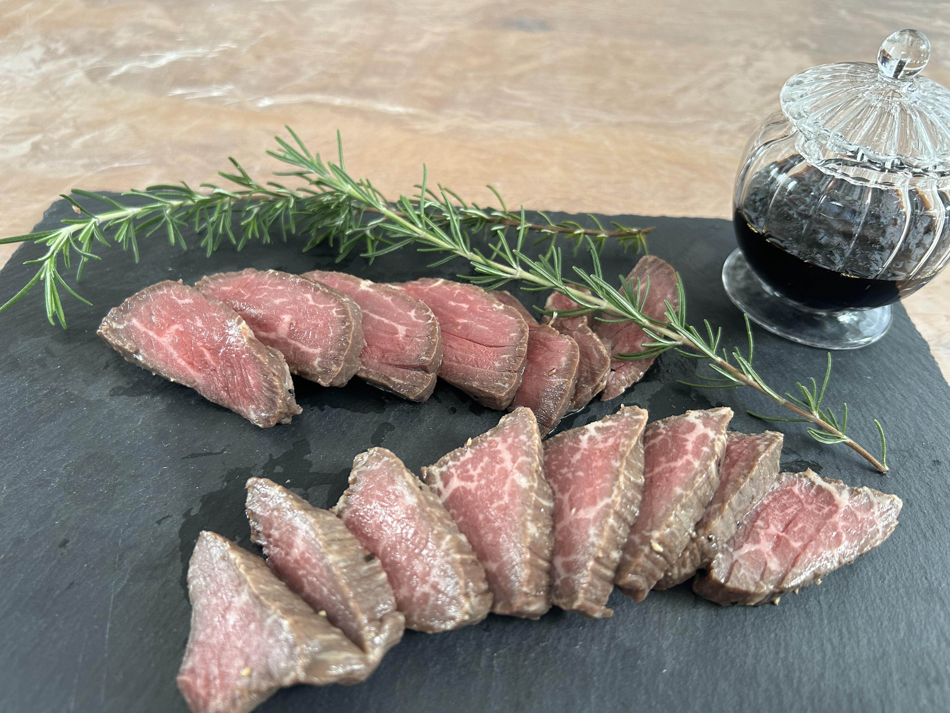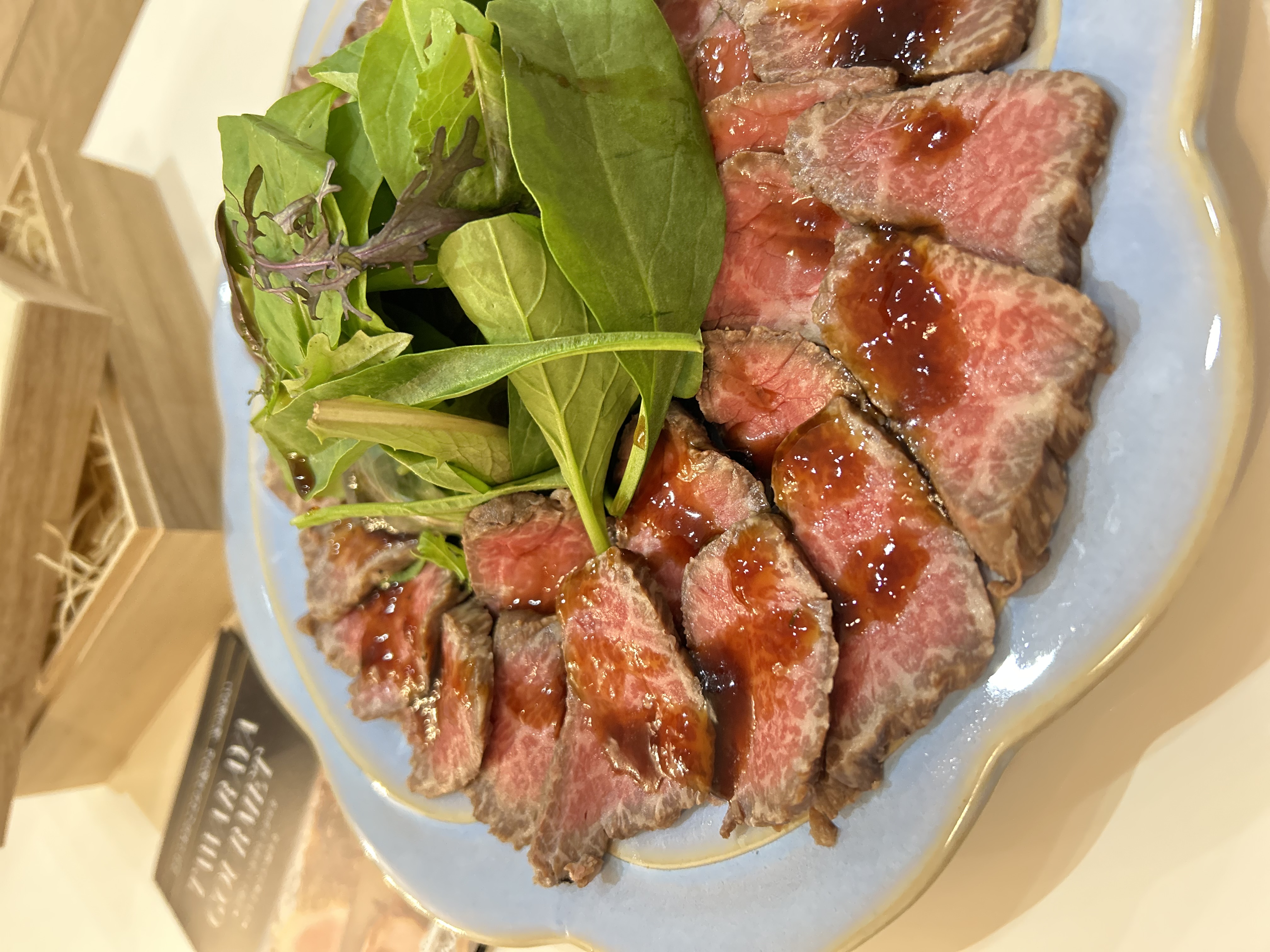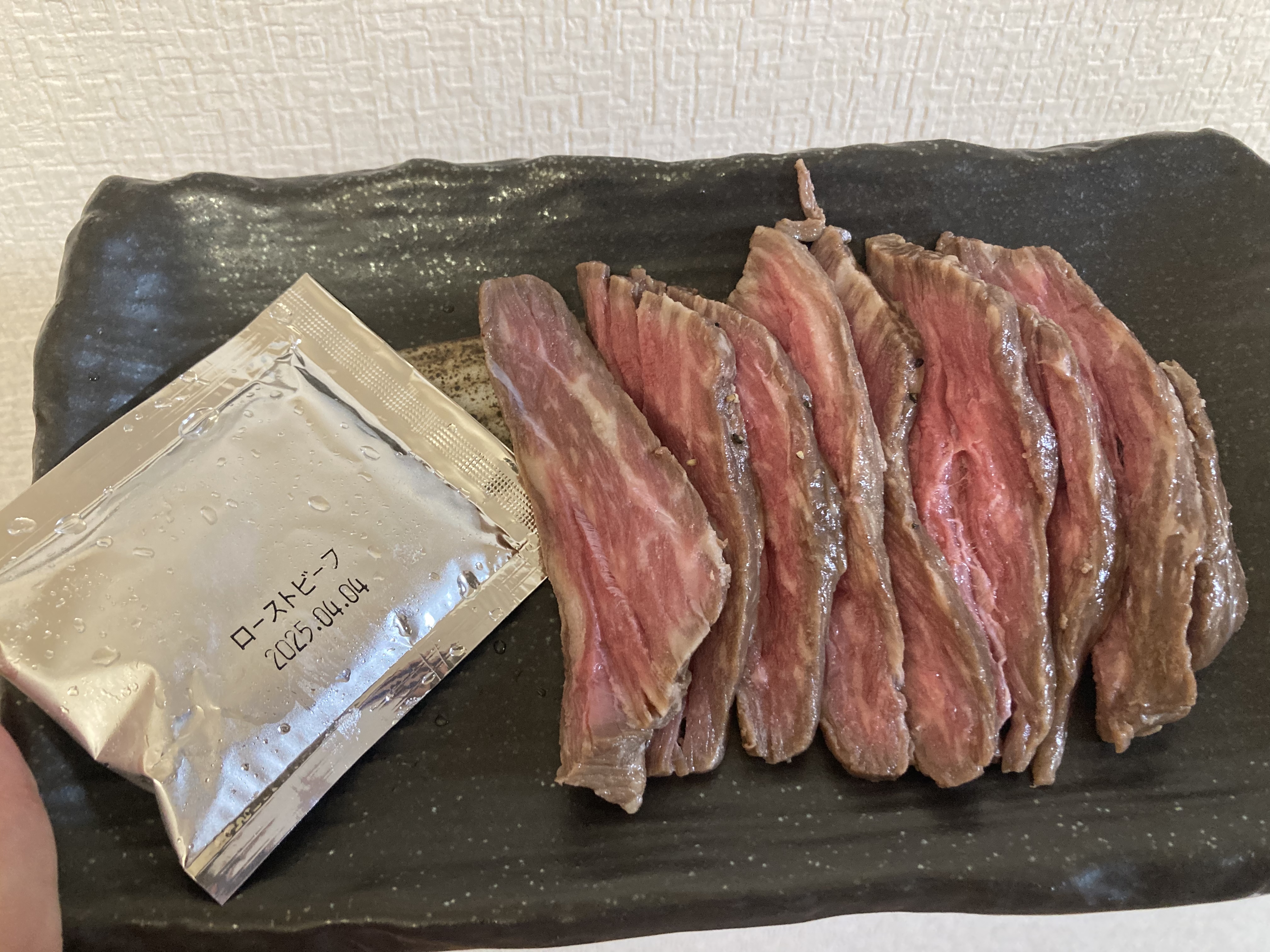 封を開けた瞬間の香りがとてもよく、説明通りに冷蔵庫でゆっくり解凍し、繊維に対して垂直に近い角度で薄く切りお皿に並べました。キレイ赤身となサシが見た目を楽しませてくれます。
