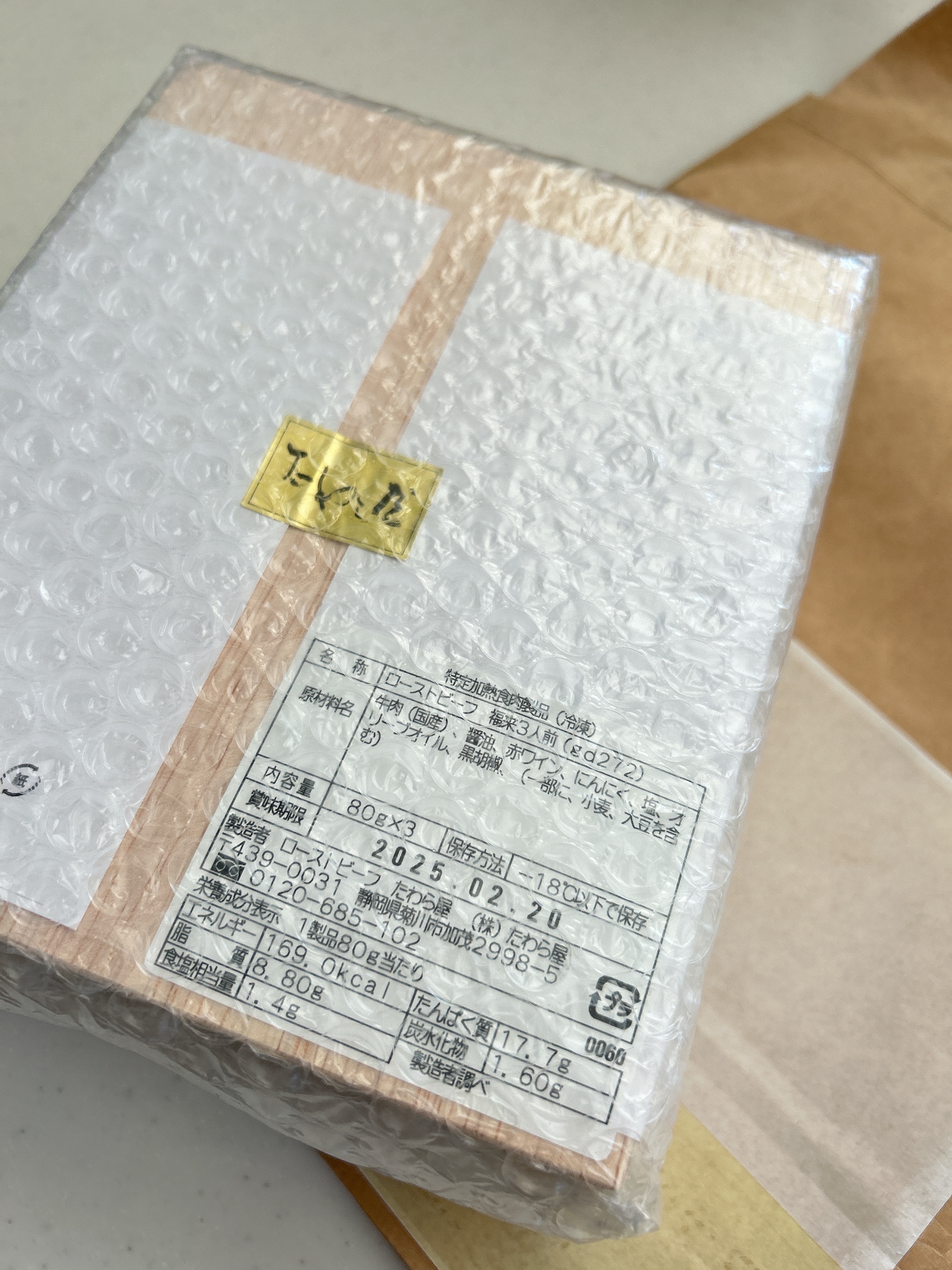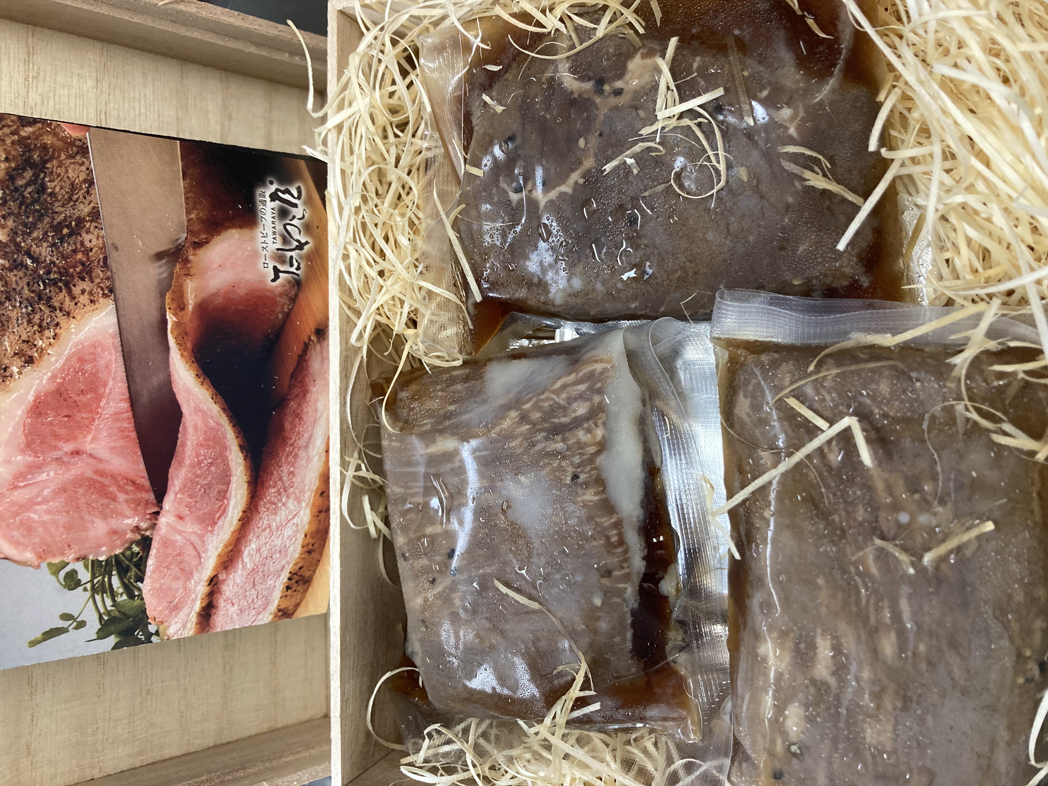 フタを開けると真空パックされた冷凍のローストビーフと専用ソースが3つ入っています。